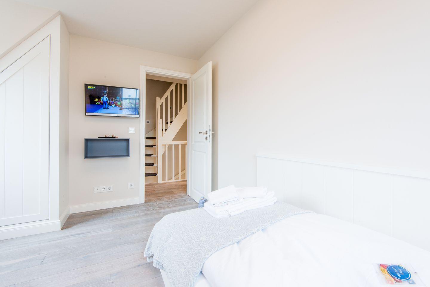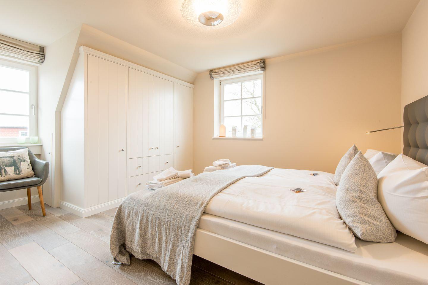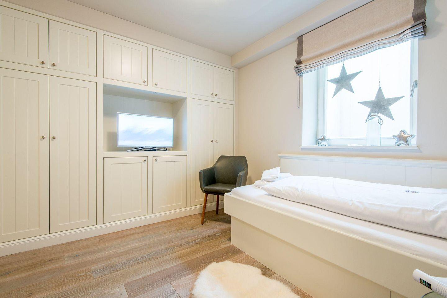 Die zwei großzügigen Schlafzimmer bieten eine entspannte Nachtruhe. Das Hauptschlafzimmer ist mit einem Doppelbett (2x 90x200 cm), Kleiderschrank und TV ausgestattet, das zweite Schlafzimmer verfügt über zwei Einzelbetten (jeweils 90x200 cm), die sich bei Bedarf zu einem Doppelbett zusammenschieben lassen, ebenfalls mit Kleiderschrank und TV. Ein drittes Schlafzimmer mit einem Einzelbett dient als idealer Rückzugsort für ruhige Momente.