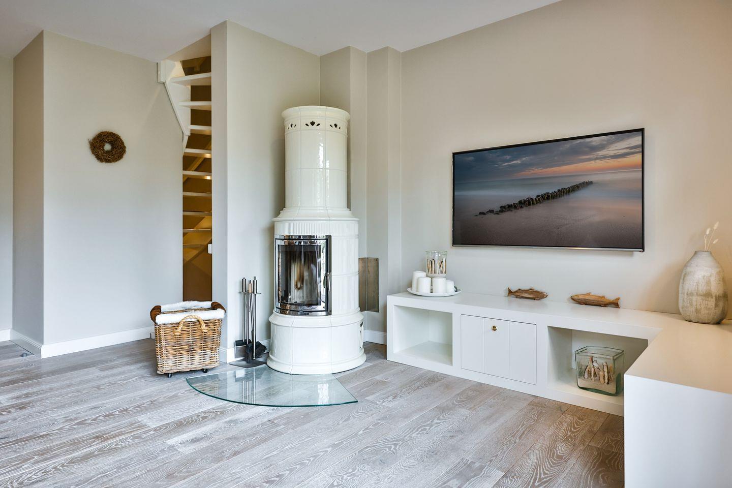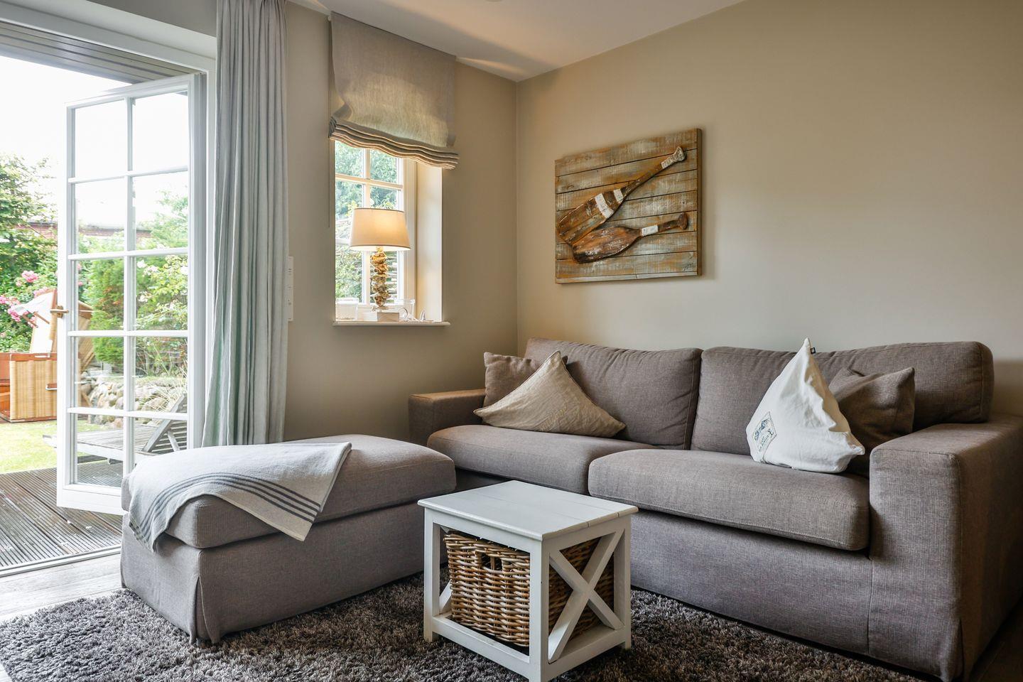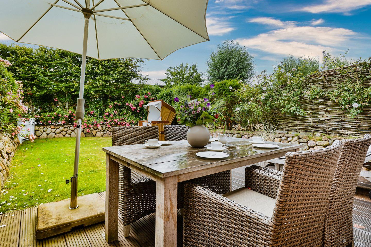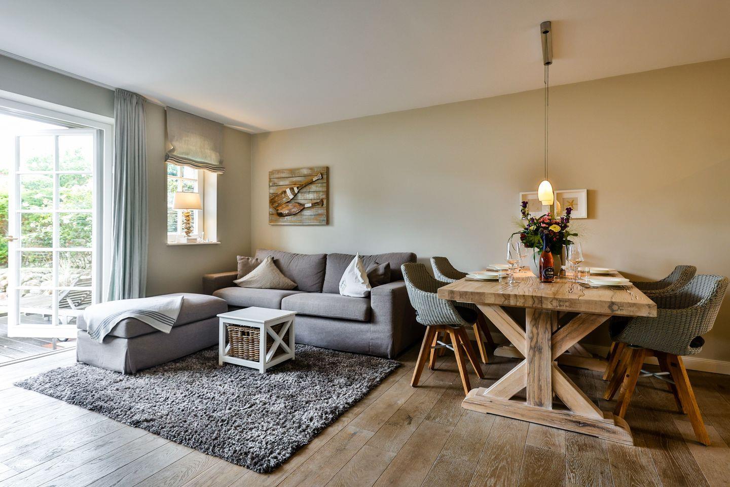 Das lichtdurchflutete Wohn- und Esszimmer schafft mit einem gemütlichen Sofa, einem großen TV und einem traditionellen Kachelofen eine einladende Wohlfühlatmosphäre. Der angrenzende Essbereich ist mit einem großzügigen Tisch für gemeinsame Mahlzeiten ausgestattet. Von hier aus gelangen Sie auf die Gartenterrasse nach Westen, die mit einem Strandkorb und komfortablen Sitzmöbeln perfekt für sonnige Stunden im Freien eingerichtet ist.