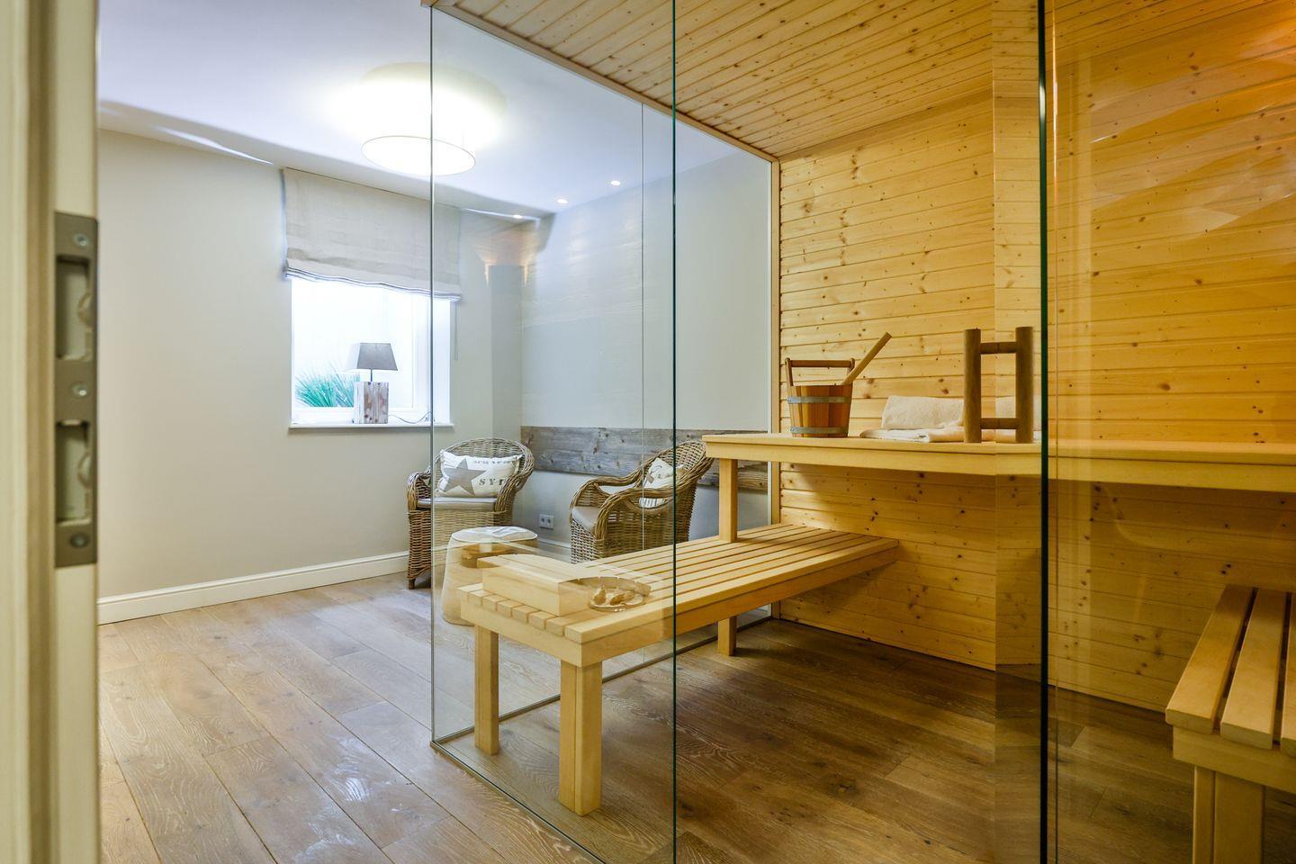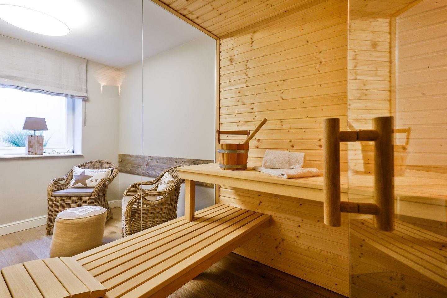 Die großzügige Sauna mit eigenem Ruheraum lädt zu wohltuenden Saunagängen ein. Im Eingangsbereich befinden sich ein Garderobenschrank und ein Gäste-WC.