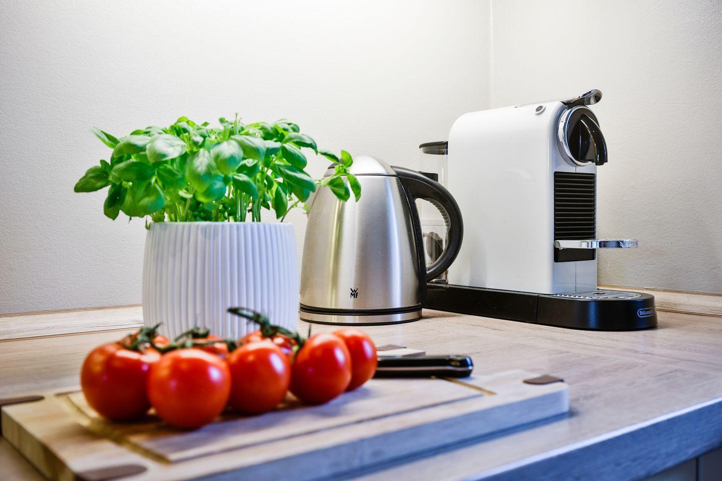 Die offene Küche ist hochwertig ausgestattet und bietet mit modernen Geräten, einer Nespresso-Maschine und viel Arbeitsfläche besten Komfort für genussvolle Kochmomente.