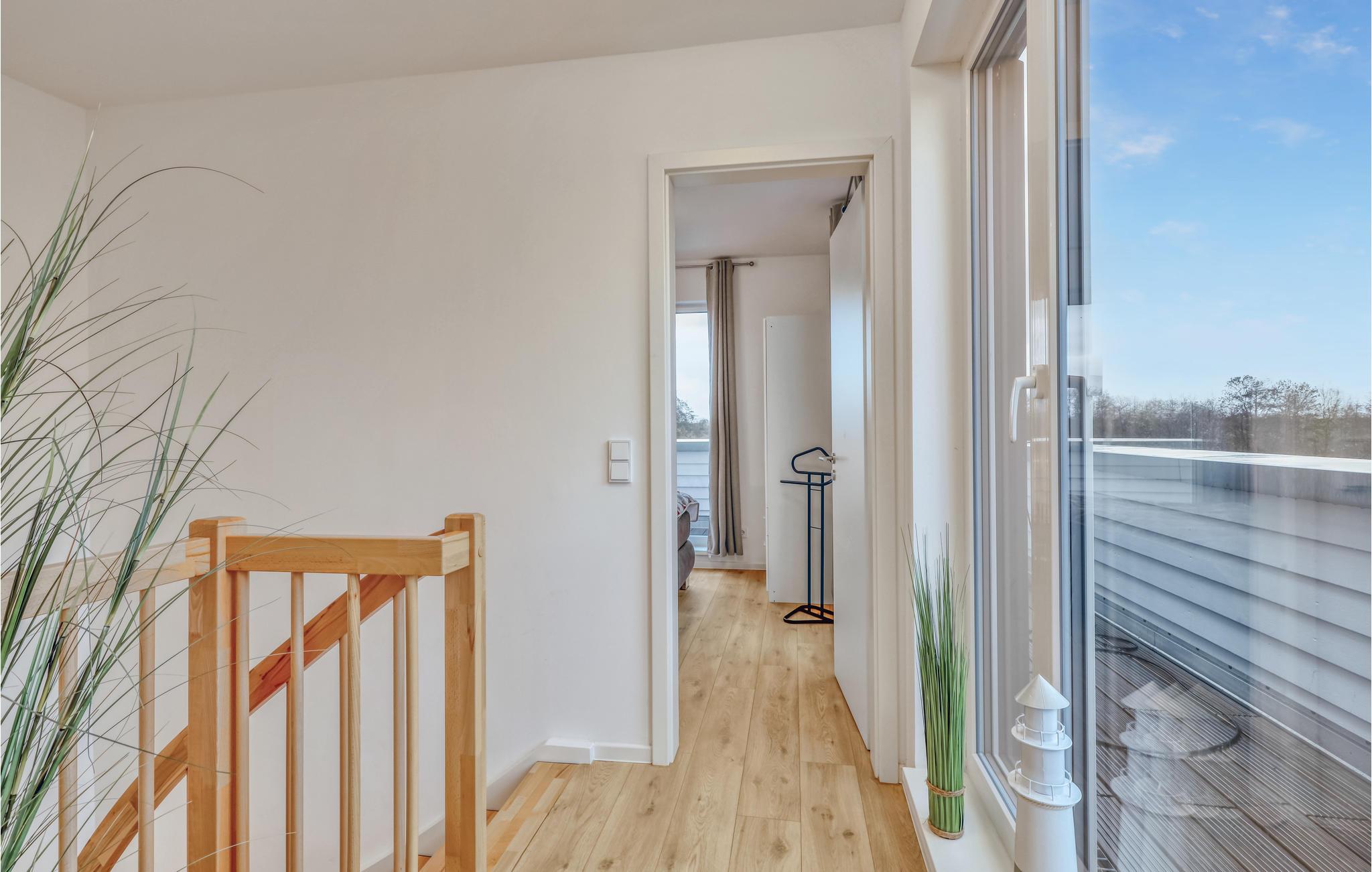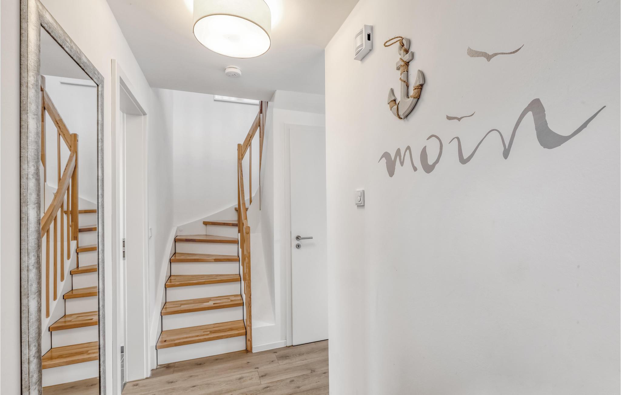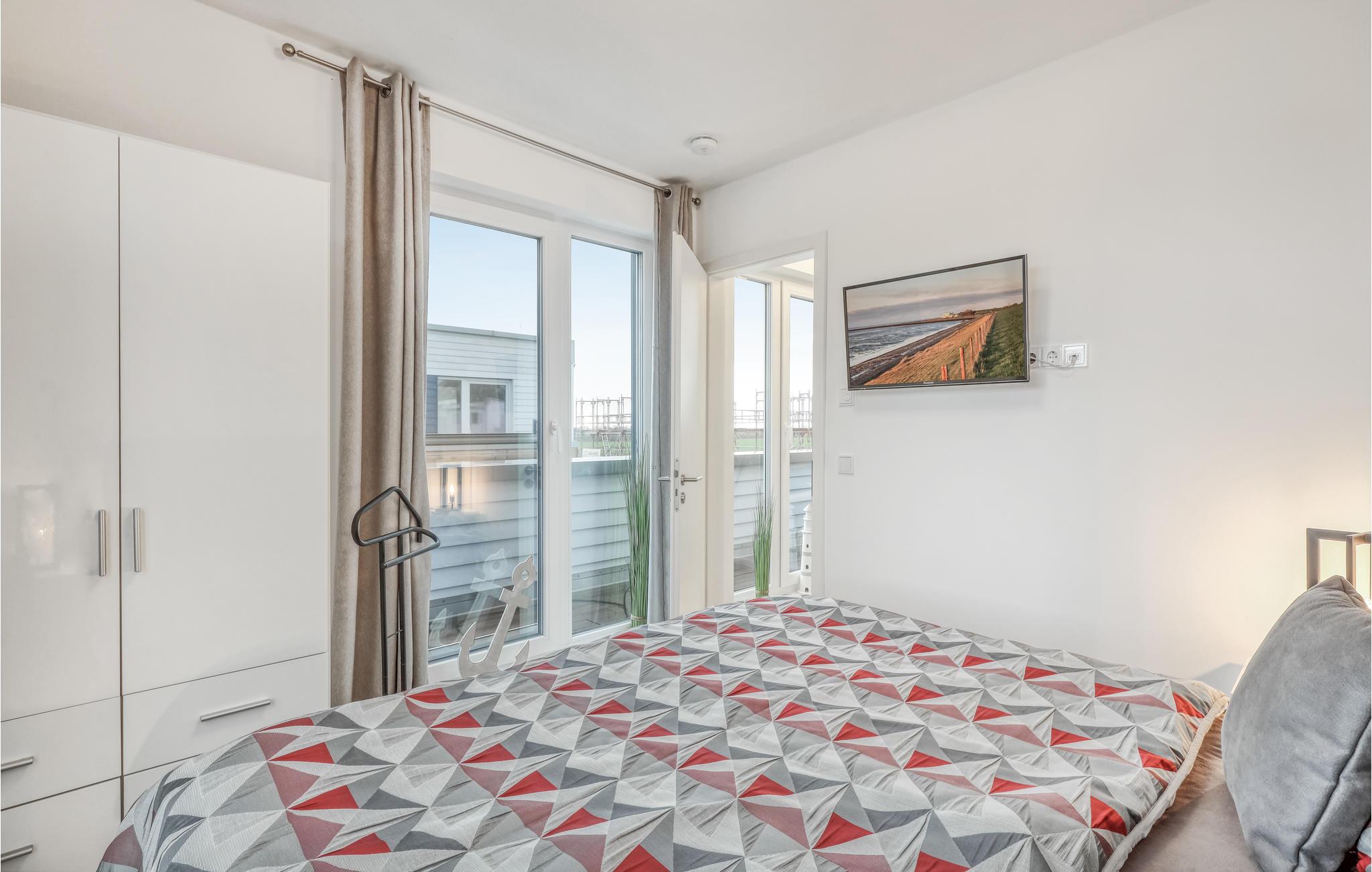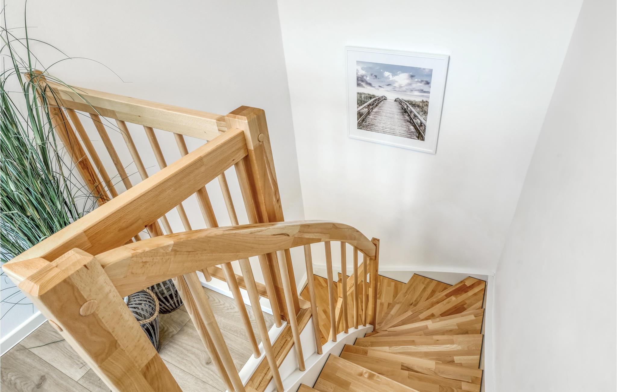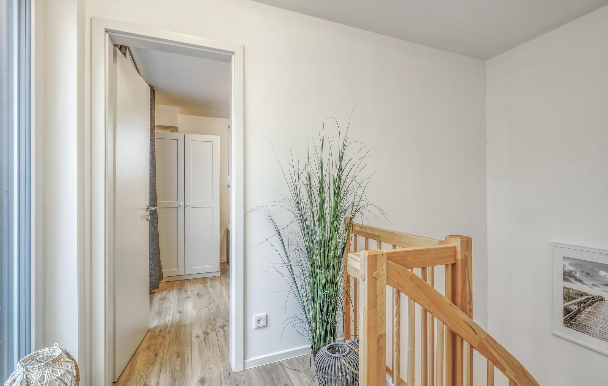 Vom Erdgeschoss gelangen Sie über eine geschwungene Treppe in das Obergeschoss des Doppelhauses, wo zwei geräumige Schlafzimmer auf Sie warten. Hier können Sie die schöne Nordseeluft von einem umlaufenden Balkon genießen, welcher von beiden Schlafzimmern aus zugänglich ist. Hochwertige Möbel und eine gelungene Raumaufteilung machen dieses Ferienhaus zu einem traumhaften Urlaubsdomizil.