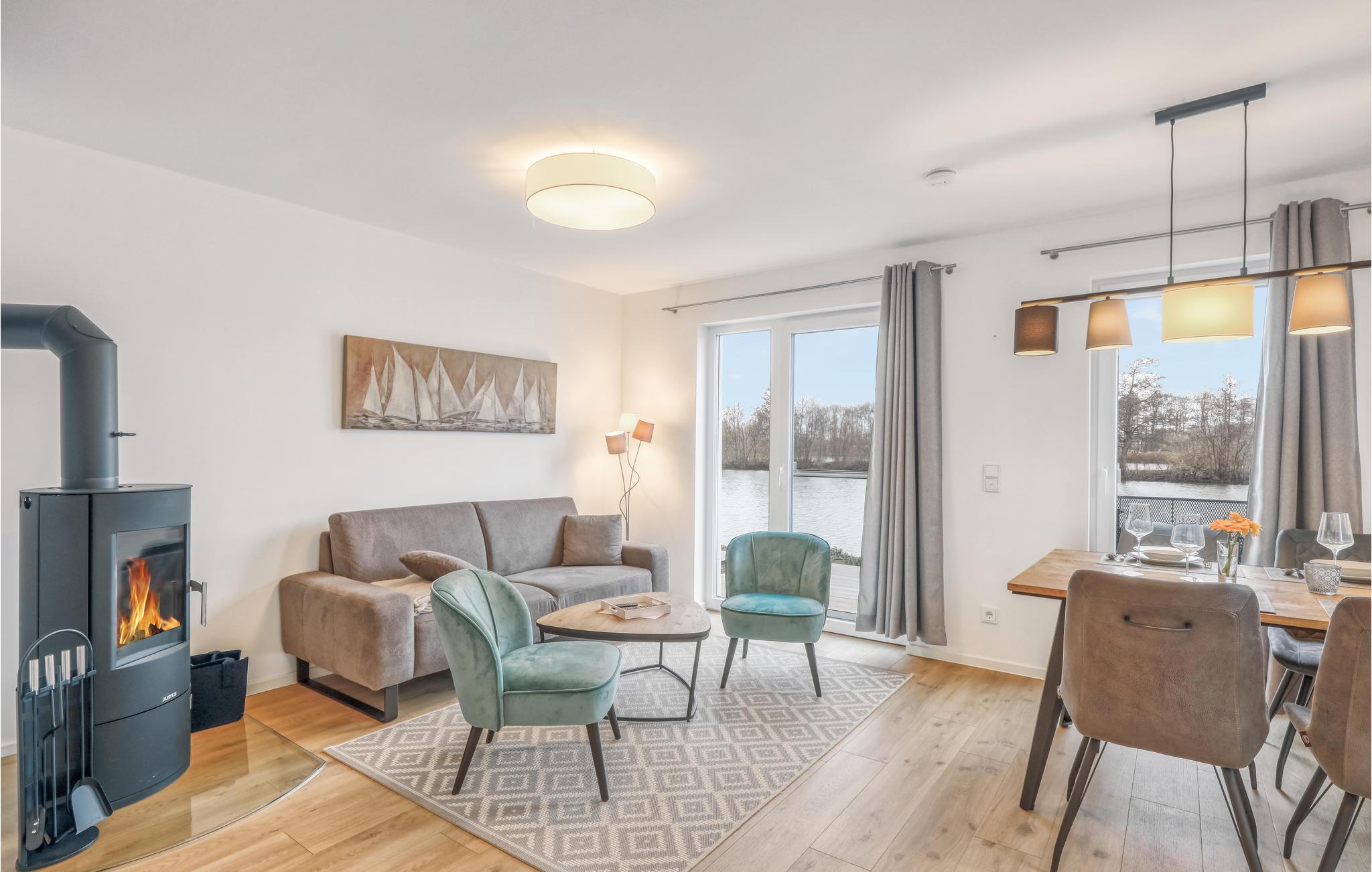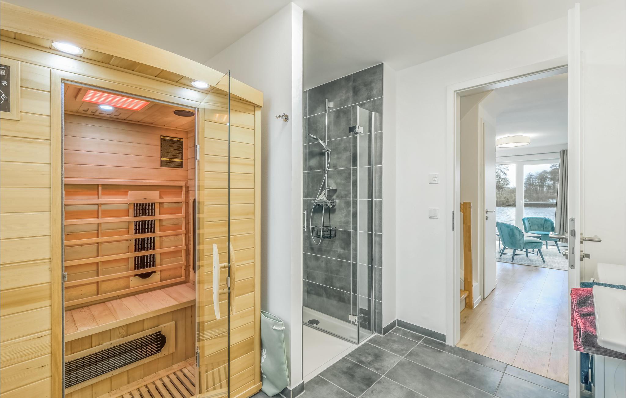 Ihr Haus erstreckt sich über 2 Etagen. Im Erdgeschoss befindet sich ein offener, gemütlicher Wohnbereich mit angrenzender Gartenterrasse und einer modernen Einbauküche, welche durch bodentiefe Fenster zum Verweilen einlädt. An kalten Tagen können Sie es sich vor dem eingebauten Kamin gemütlich machen. Neben dem Wohnbereich befindet sich ein helles Badezimmer mit Duschkabine und Infrarotsauna.