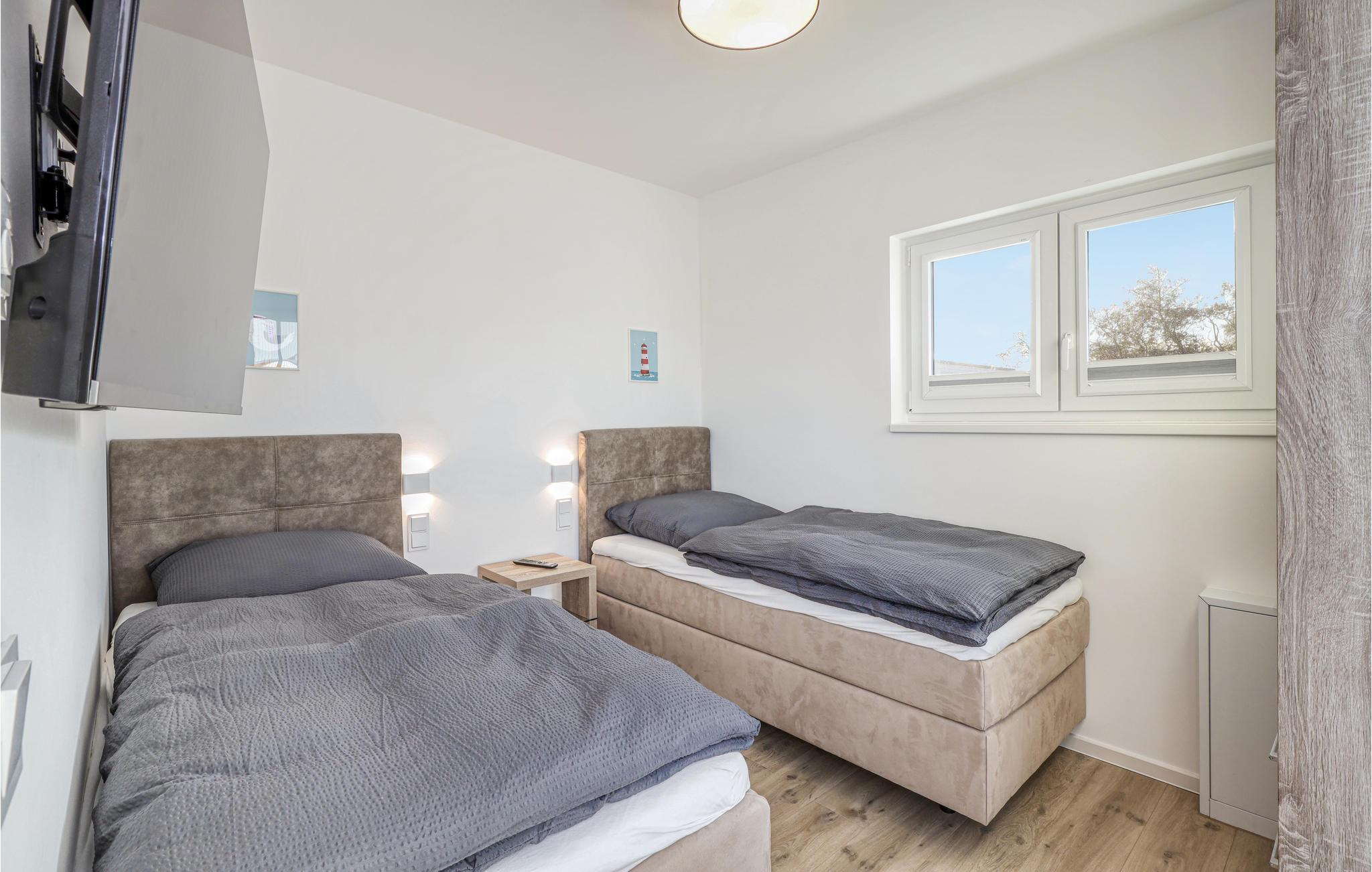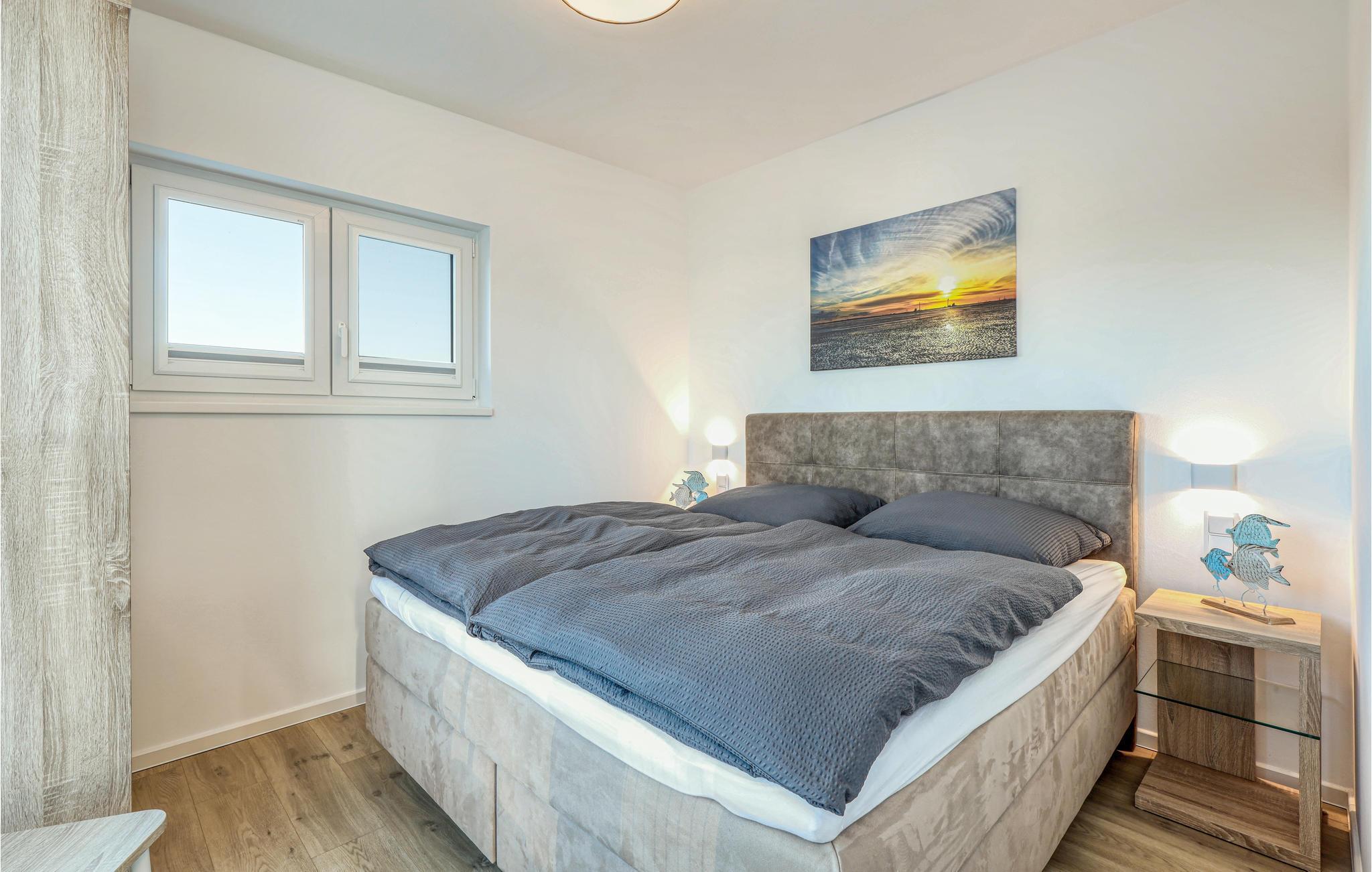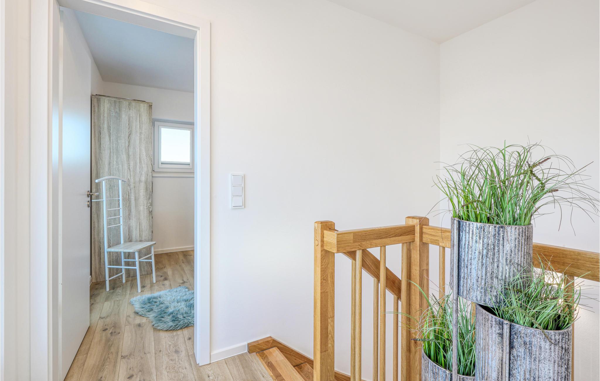 Vom Erdgeschoss gelangt man über eine geschwungene Treppe in das Obergeschoss des Doppelhauses, wo zwei geräumige Schlafzimmer auf Sie warten. Hier können Sie die schöne Nordseeluft von einem Balkon genießen, welcher von beiden Räumen aus zugänglich ist. Hochwertige Möbel und eine gelungene Raumaufteilung machen dieses Ferienhaus zu einem traumhaften Urlaubsdomizil.