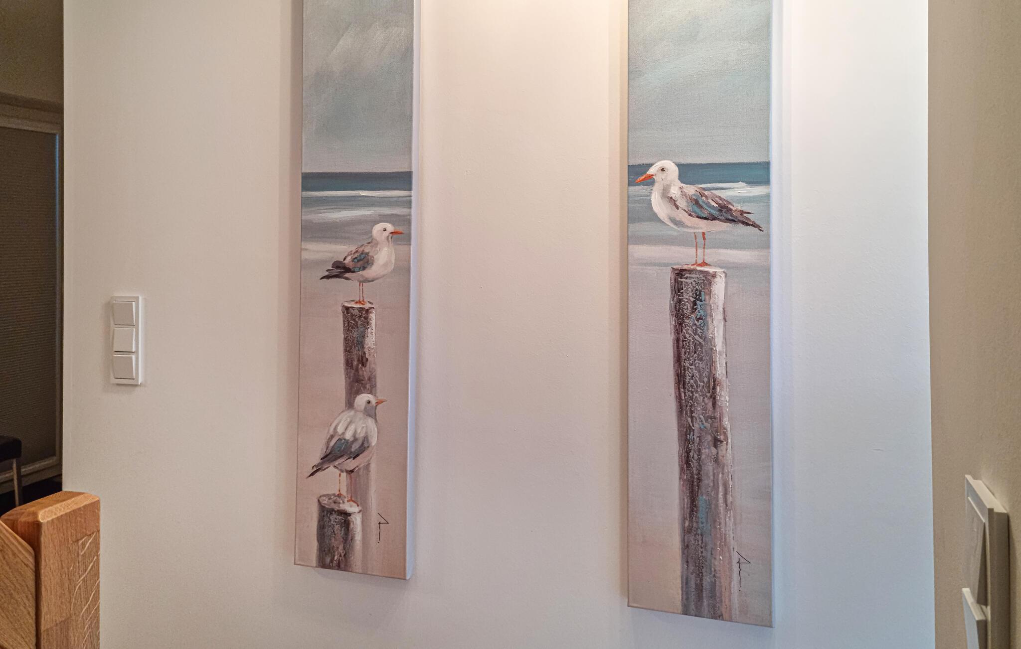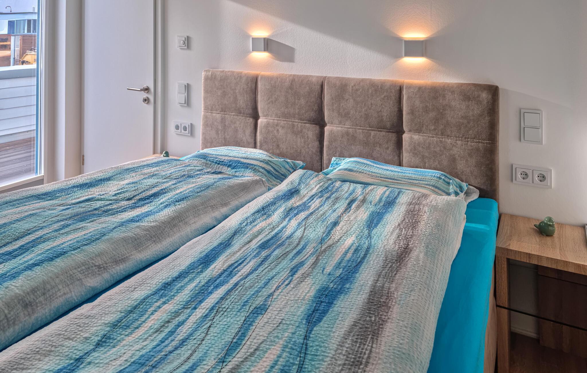Vom Erdgeschoss gelangen Sie über eine geschwungene Treppe in das Obergeschoss des Doppelhauses, wo zwei geräumige Schlafzimmer auf Sie warten. Hier können Sie die schöne Nordseeluft von einem Balkon genießen, welcher von beiden Räumen aus zugänglich ist. Hochwertige Möbel und eine gelungene Raumaufteilung machen dieses Ferienhaus zu einem traumhaften Urlaubsdomizil.