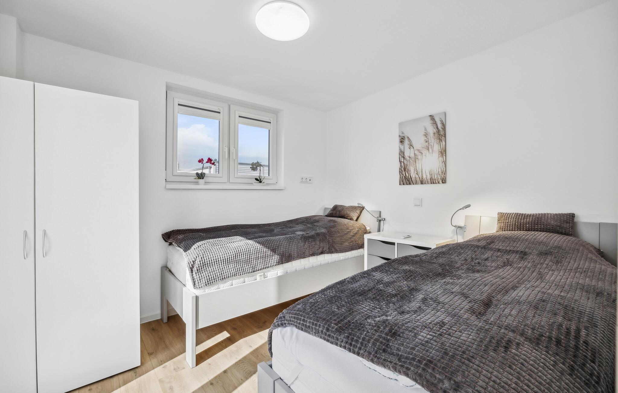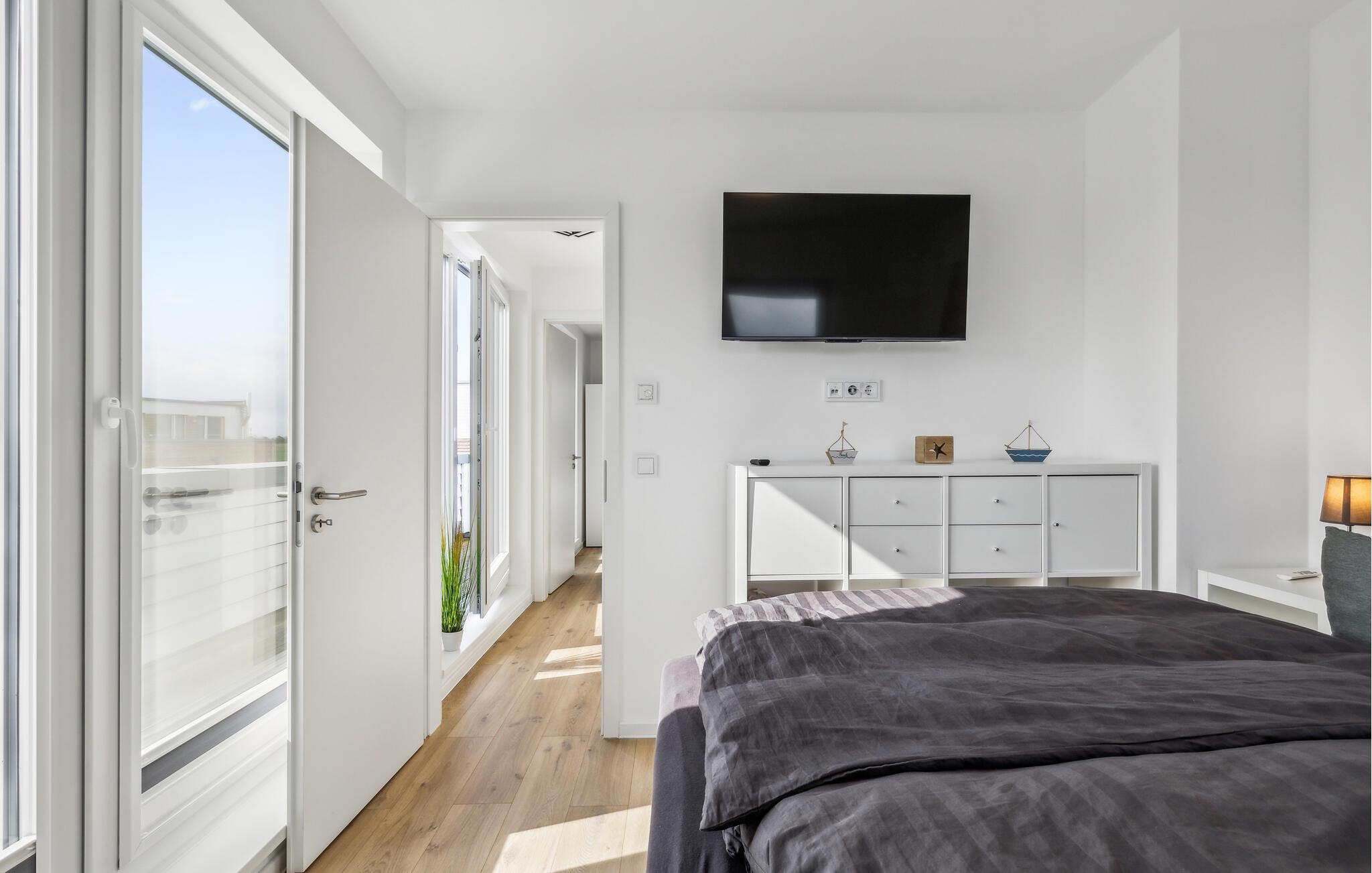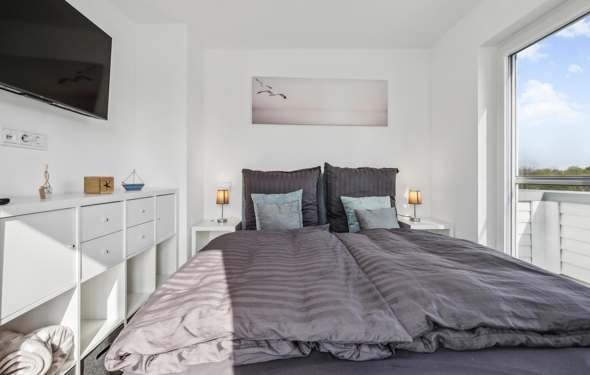 Vom Erdgeschoss gelangt man über eine geschwungene Treppe in das Obergeschoss des Doppelhauses, wo zwei geräumige Schlafzimmer auf Sie warten. Hier können Sie die schöne Nordseeluft von einem umlaufenden Balkon genießen, welcher von beiden Schlafzimmern aus zugänglich ist. Hochwertige Möbel und eine gelungene Raumaufteilung machen dieses Ferienhaus zu einem traumhaften Urlaubsdomizil.