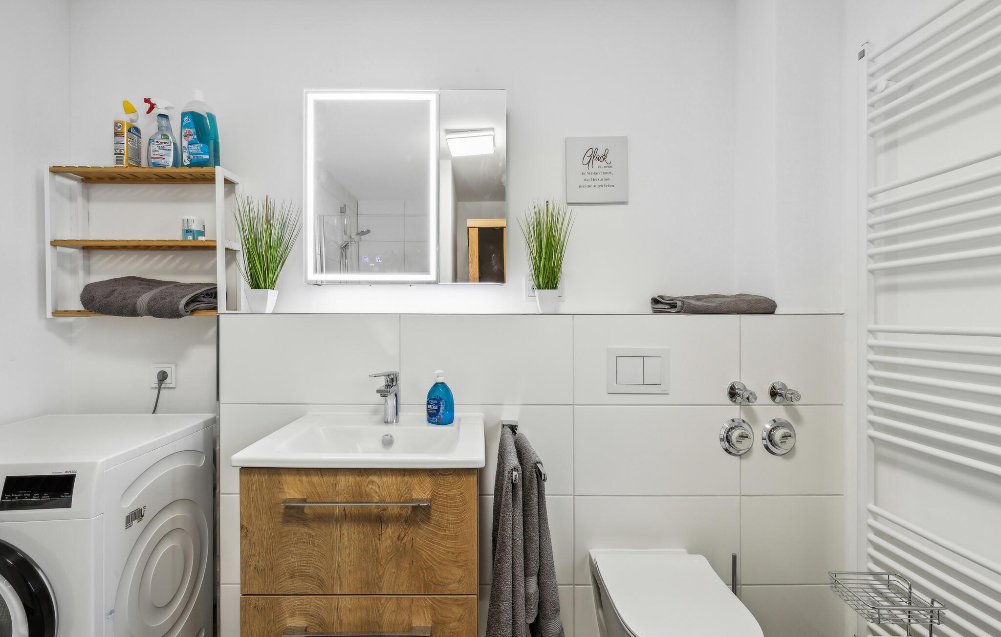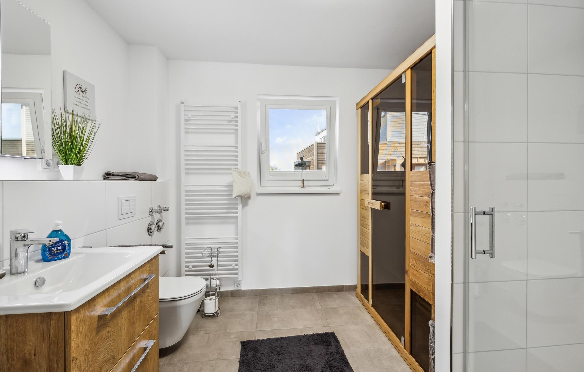 Ihr Haus erstreckt sich über 2 Etagen. Im Erdgeschoss befindet sich ein offener, gemütlicher Wohnbereich mit angrenzender Gartenterrasse und einer modernen Einbauküche, welche durch bodentiefe Fenster zum Verweilen einlädt. An kalten Tagen können Sie es sich vor dem eingebauten Kamin gemütlich machen. Neben dem Wohnbereich befindet sich ein helles Badezimmer mit Duschkabine und Infrarotsauna.