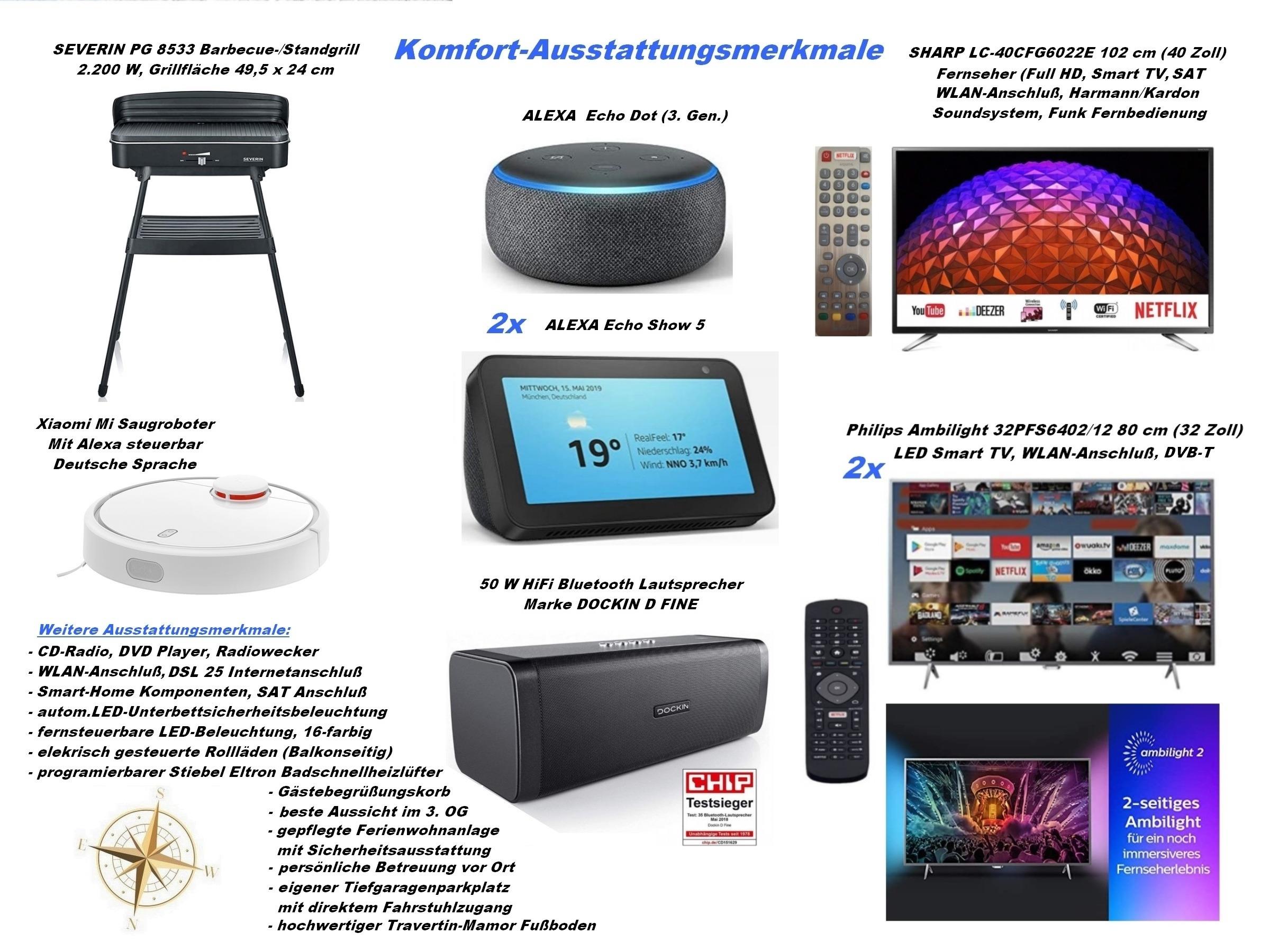 Helle und ruhige Nichtraucherwohnung, strandnah, großer bepflanzter Süd-Balkon mit toller Aussicht im 3. Stock, WLAN, 1xAlexa + 2xEcho Show 5 SmartHome Komponenten, umfangreiche LED Illumination, 1xSat-TV, 2xDVBT&Smart TV, DVD, Radio,, Fahrstuhl, Tiefgarage, el. Außenrolläden im Wohnzimmer, Kinderhochstuhl, Babybett verfügbar, Energie nach Verbrauch