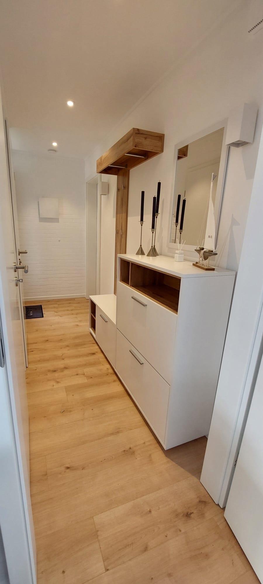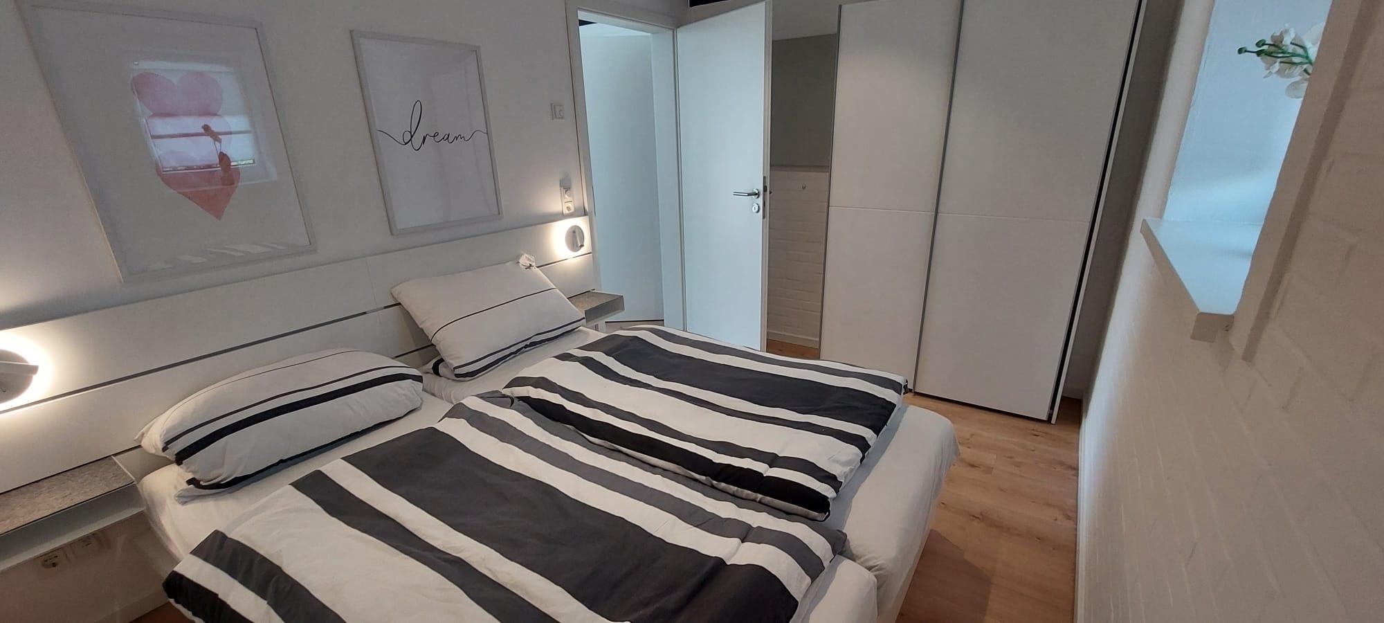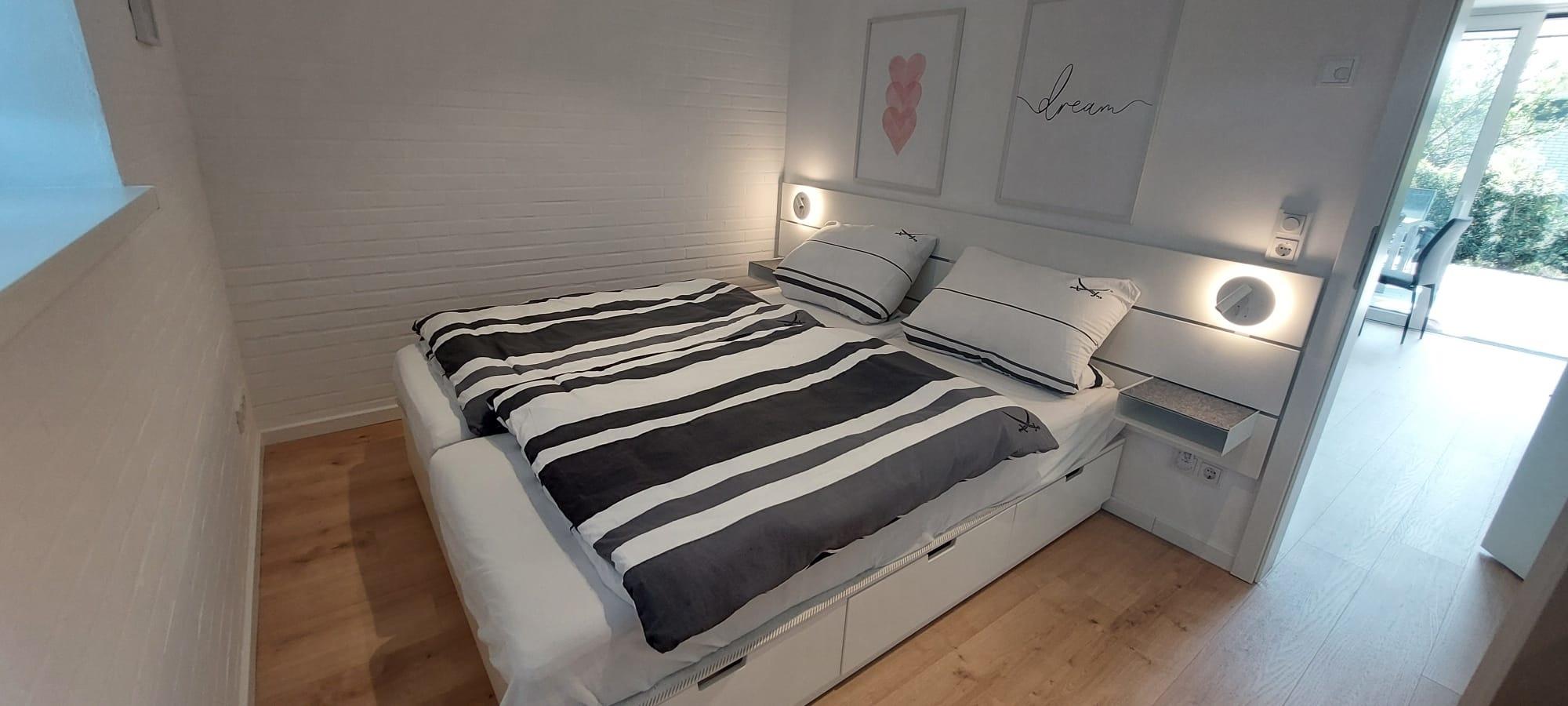Der Wohn- und Essbereich ist ausgestattet mit einer gemütlichen Couch (mit Schlaffunktion/Topper im Bettkasten), einem bequemen Ohrensessel und einem Esstisch für 4 Personen. Ein Kinderhochstuhl Stokke Tripp Trapp ist im Abstellraum vorhanden. Für Unterhaltung sorgt ein 50 Zoll 4K Fernseher, Blue Ray Player, Receiver (Anbieter EWE Zuhause TV) und DAB Radio/CD Player. Die vollausgestattete Küche mit Cerankochfeld, Backofen, Mikrowelle, Toaster, Wasserkocher, Spülmaschine, Kühlschrank mit Gefrierfach, Senseo - Kaffeepad - Maschine ermöglicht Ihnen, kleine oder umfangreiche Gerichte zuzubereiten. Ein Schlafzimmer ist mit einem Doppelbett (zwei Einzelmatratzen 80 x 200 cm) für 2 Personen geeignet, im weiteren Schlafzimmer finden sich zwei Einzelbetten 80 x 200cm, ein mitgebrachtes Kindereiserbett kann auf Wunsch aufgestellt werden. Das moderne Bad bietet mit Spiegelschrank, elektrischem Handtuchheizkörper und bodengleicher Dusche einen guten Komfort auf kleinem Raum. Ein Fön ist im Waschtischunterschrank vorhanden. Die gesamte Haustechnik ist separat in einem Anbau untergebracht und ausgelagert, Heizung/Warmwasseraufbereitung erfolgt über regenerative Energien- Luft/Wasserwärmepumpe. Der ebenfalls neugestaltete Garten mit großzügiger Terrasse liegt zur Südseite und ist weitgehend sichtgeschützt. Eine hochwertige Biohort Freizeitbox bietet Platz für Sitzkissen, 2 Sonnenliegen, 4 Klappstühle und den Sonnenschirm. Ein ebenfalls hochwertiges Biohort Gartenhaus bietet Platz für mitgebrachte Fahrräder, ein Holzkohlegrill ist vorhanden.