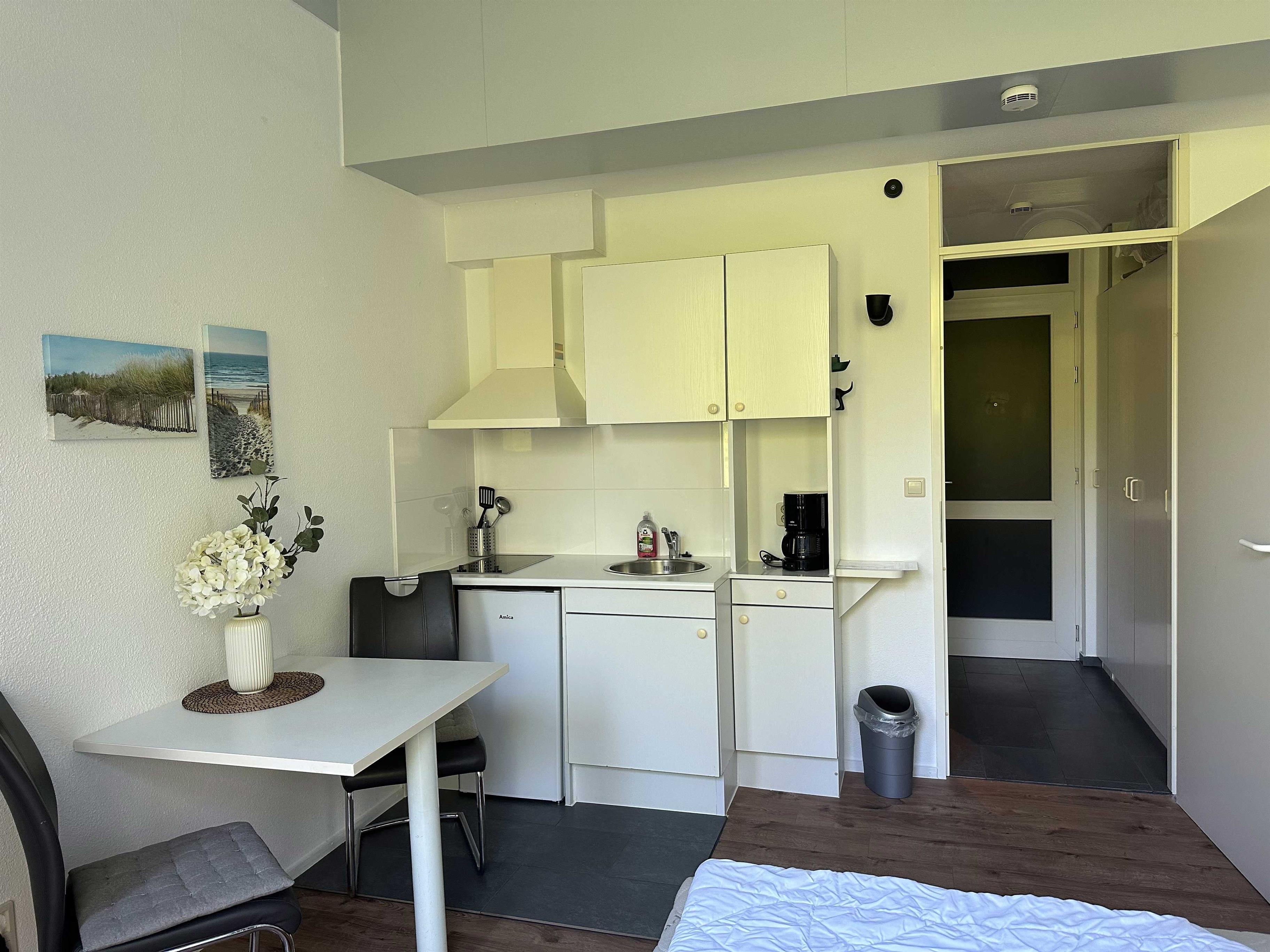 - eine kleine, praktische Küche mit Ceranfeld (2 Platten), Toaster, Wasserkocher, Mikrowelle, Kaffeemaschine, Kühlschrank und allem nötigen Zubehör