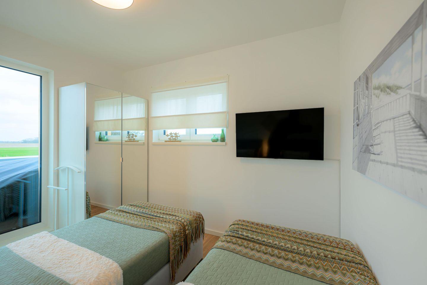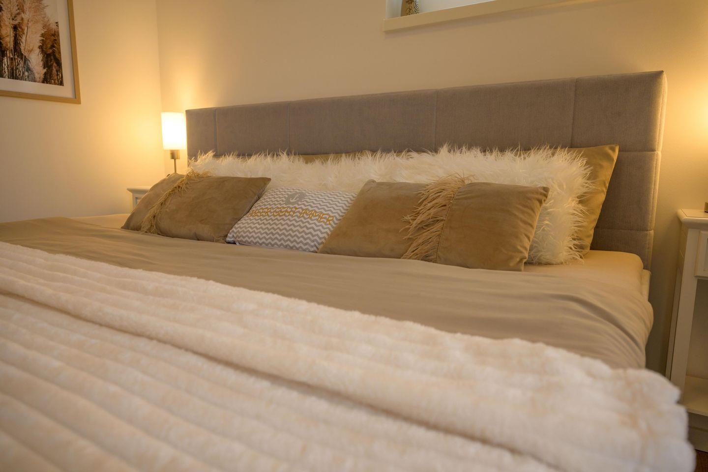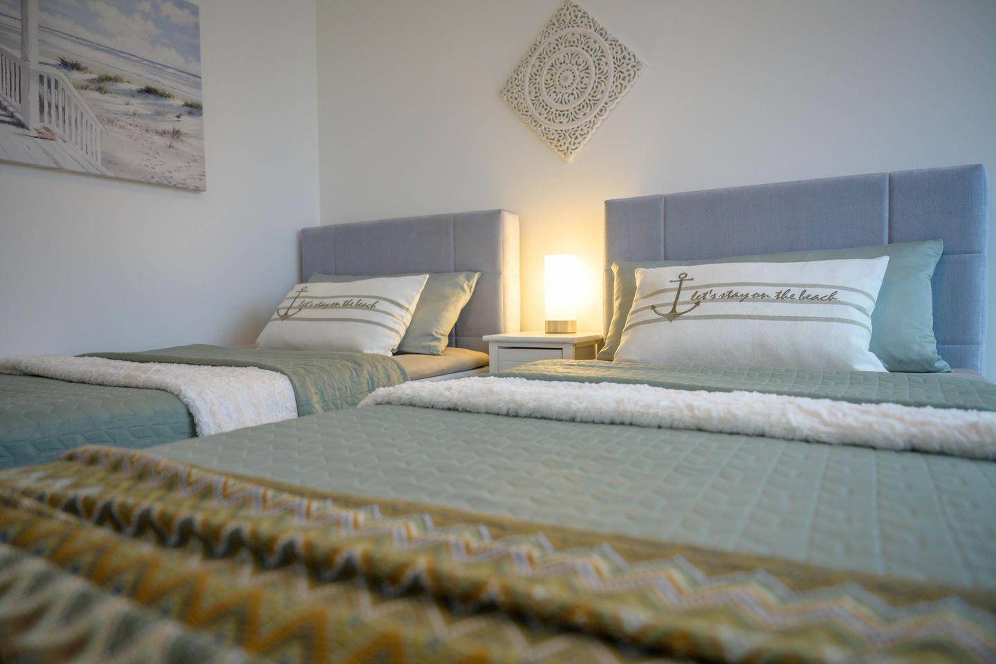 Im Obergeschoss befinden sich zwei liebevoll eingerichtete Schlafzimmer – eines mit komfortablem Boxspringbett, das andere mit zwei Einzel-Boxspringbetten. Beide Zimmer sind mit Smart-TV, Verdunkelung und viel Stauraum ausgestattet – ideal für Paare, Familien oder Freunde.