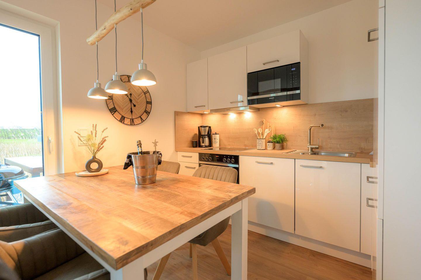 Im lichtdurchfluteten Wohnbereich mit bodentiefen Fenstern, Holzofenkamin und großem Smart-TV kannst du es dir richtig gemütlich machen. Die offene, voll ausgestattete Küche mit Essbereich lädt zum gemeinsamen Kochen ein. Von hier aus hast du direkten Zugang zur möblierten Terrasse und zum Garten mit Weber-Kohlegrill.