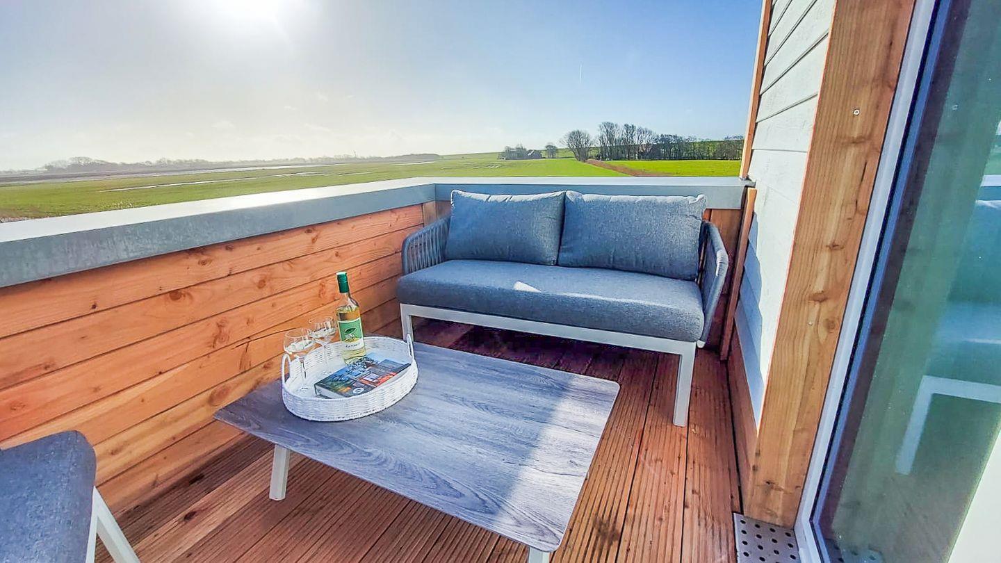 Ein Fahrradständer steht zum sicheren Abstellen deiner Räder bereit. Die umweltfreundliche Bauweise und nachhaltige Ausstattung runden das Urlaubskonzept ab. Die Dachterrasse mit Loungemöbeln und Sonnenliege ist ein echtes Highlight – genieße hier deine ganz private Auszeit mit Blick auf den Deich.