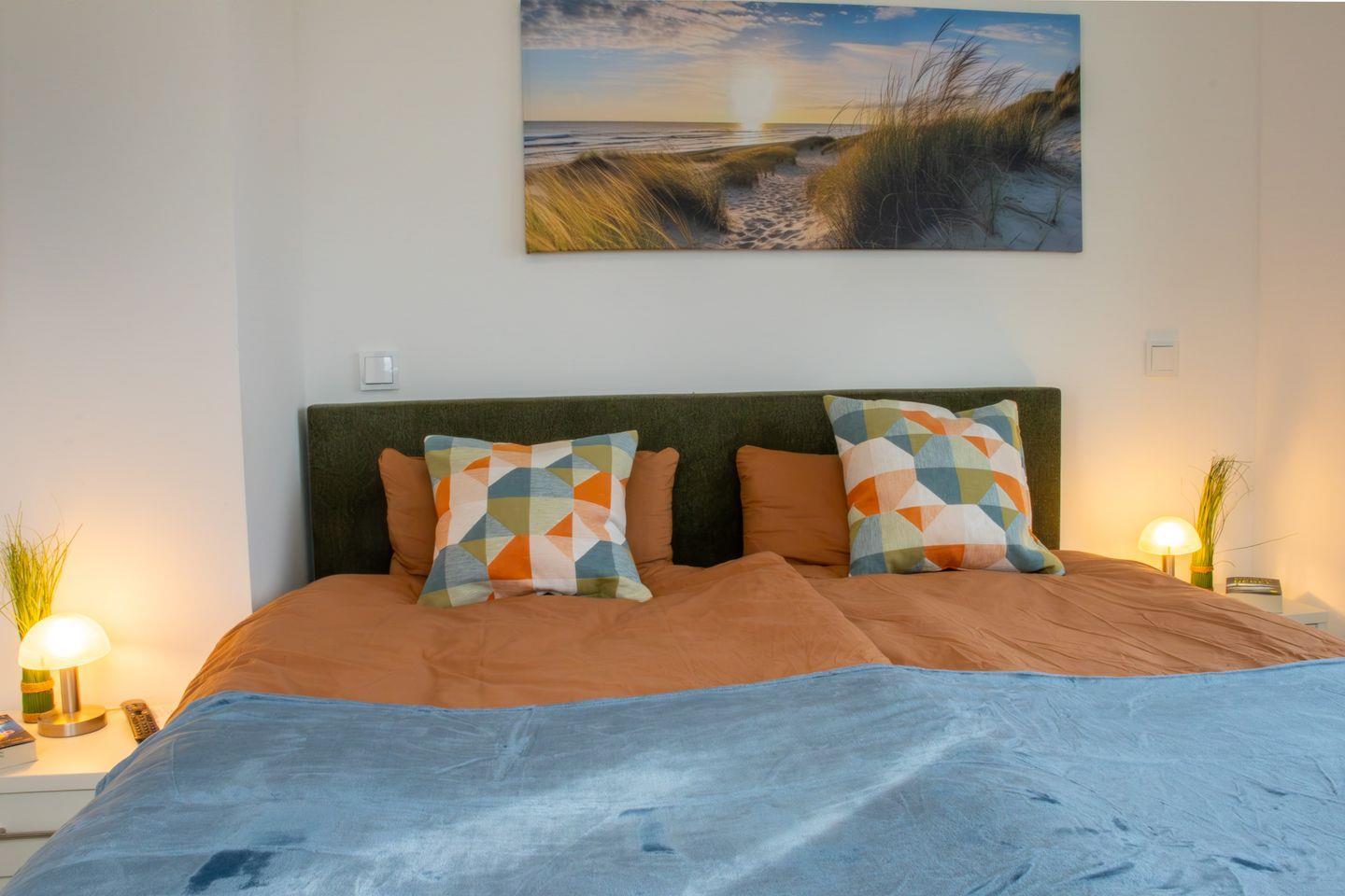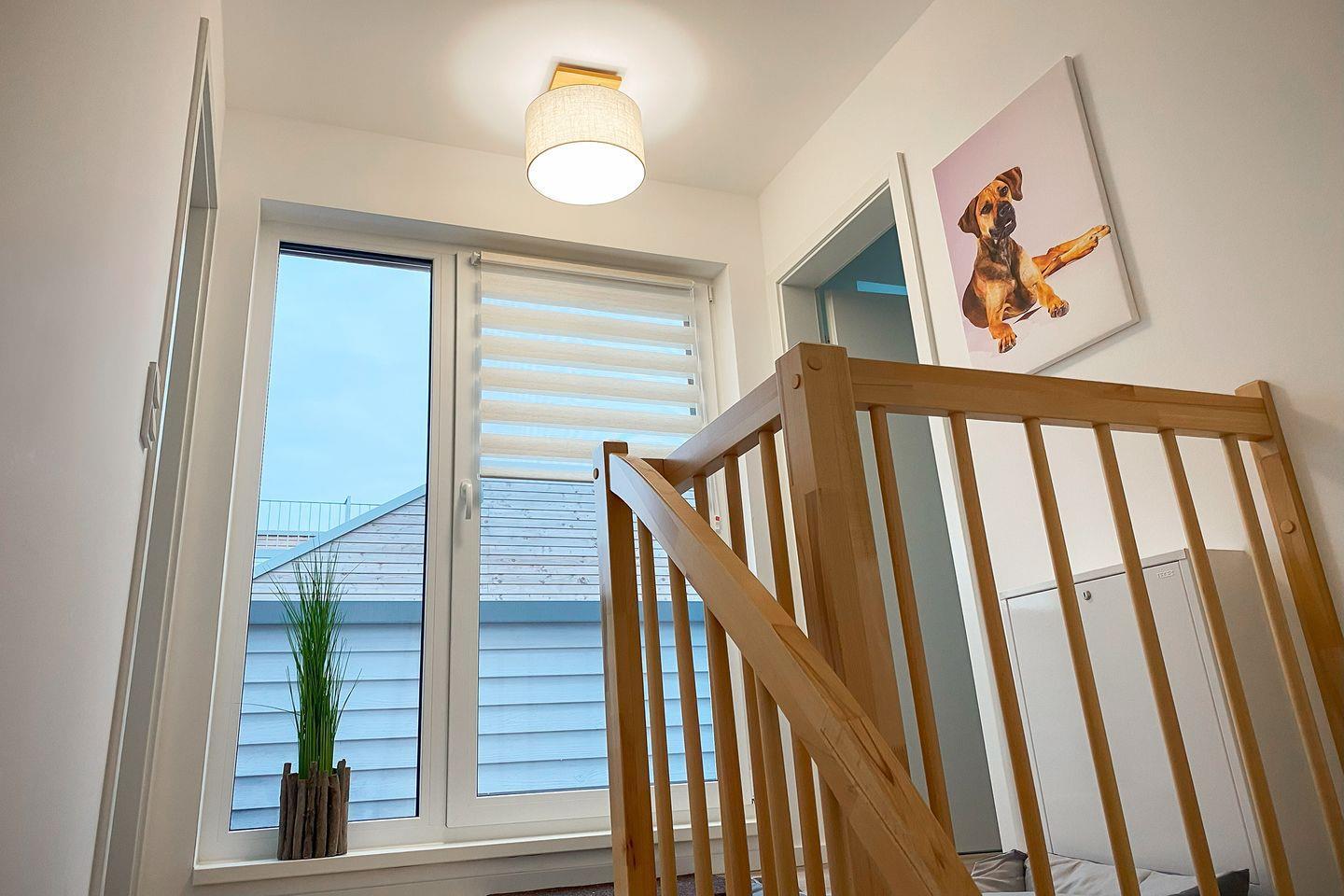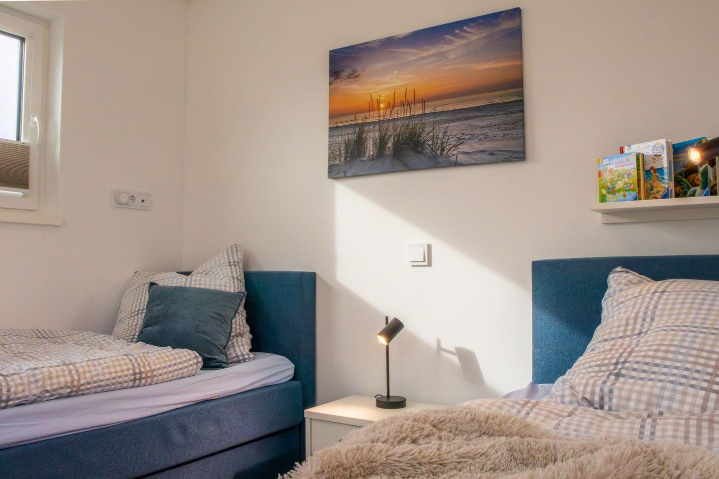 Im Obergeschoss erwarten dich zwei liebevoll eingerichtete Schlafzimmer. Eines davon ist mit einem hochwertigen Boxspringbett (180x200?cm) und einem Smart-TV ausgestattet – perfekt für entspannte Abende. Das zweite Schlafzimmer verfügt über zwei komfortable Einzel-Boxspringbetten (je 90x200?cm) und eignet sich ideal für Kinder, Freunde oder Geschwister. Beide Räume sind mit Verdunkelungsplissees versehen, die dir einen ruhigen, erholsamen Schlaf ermöglichen.