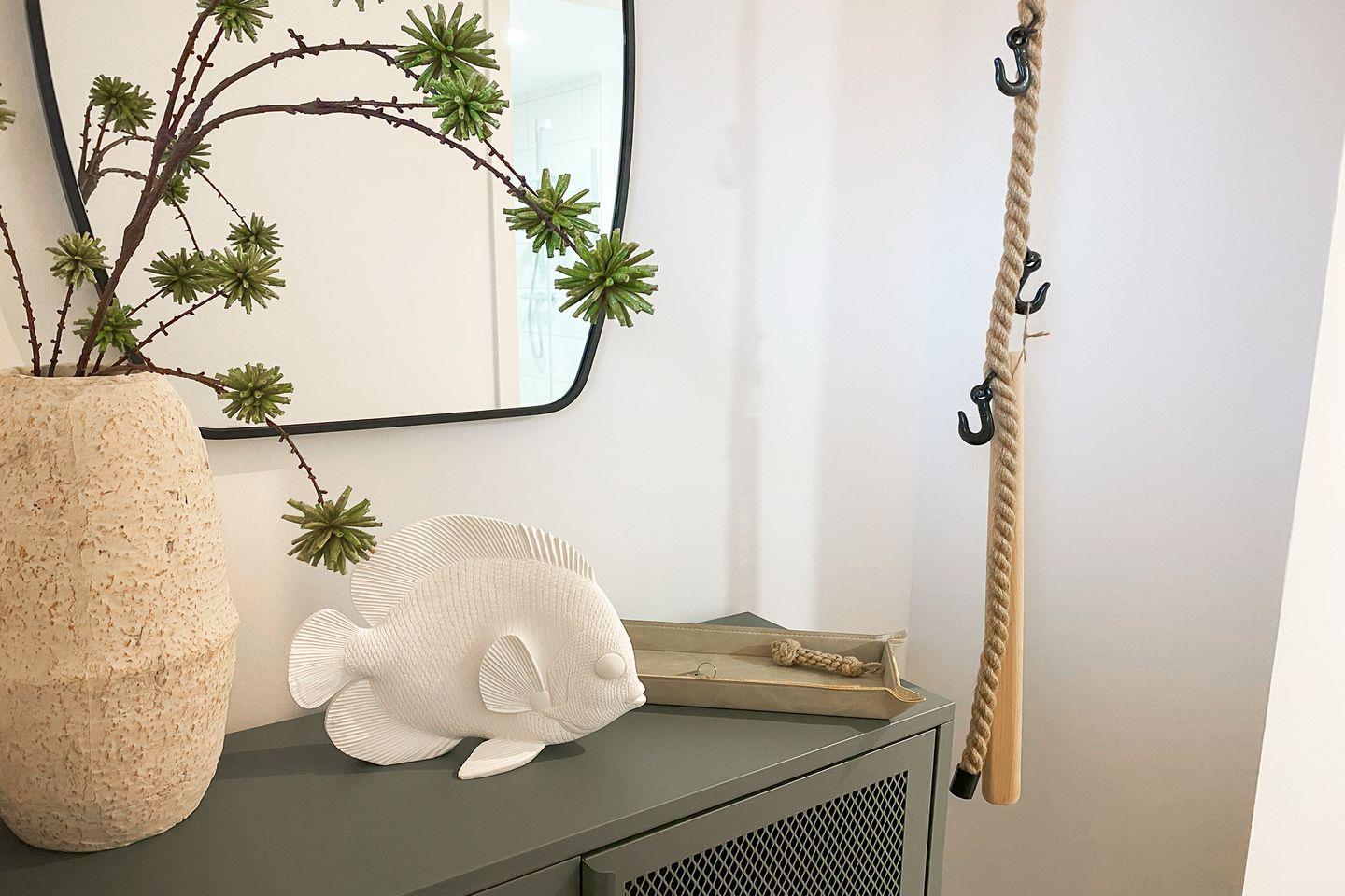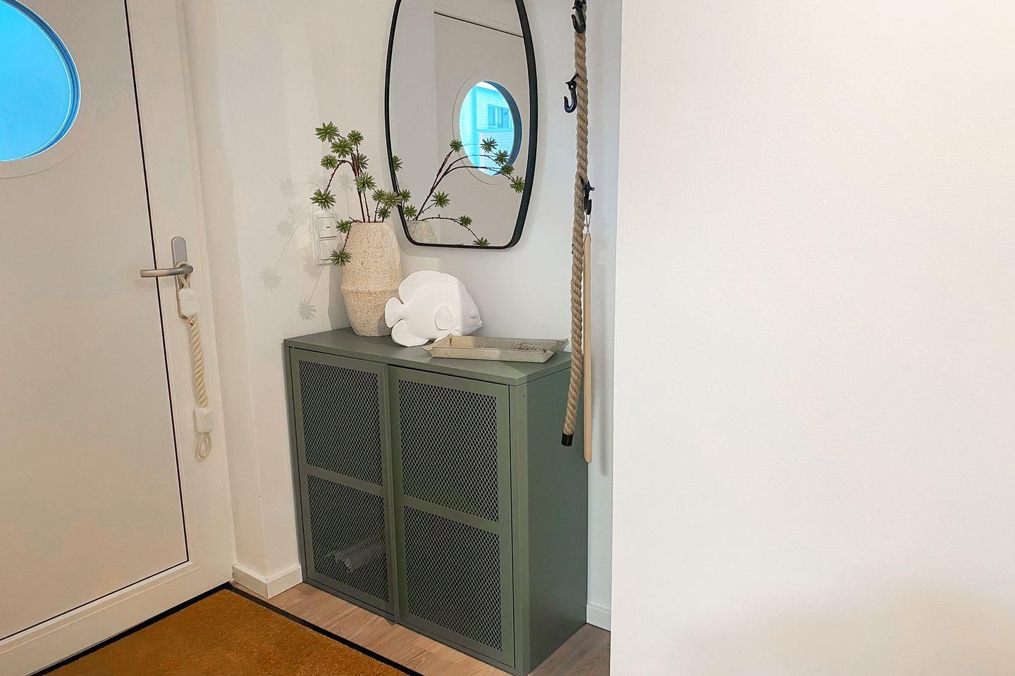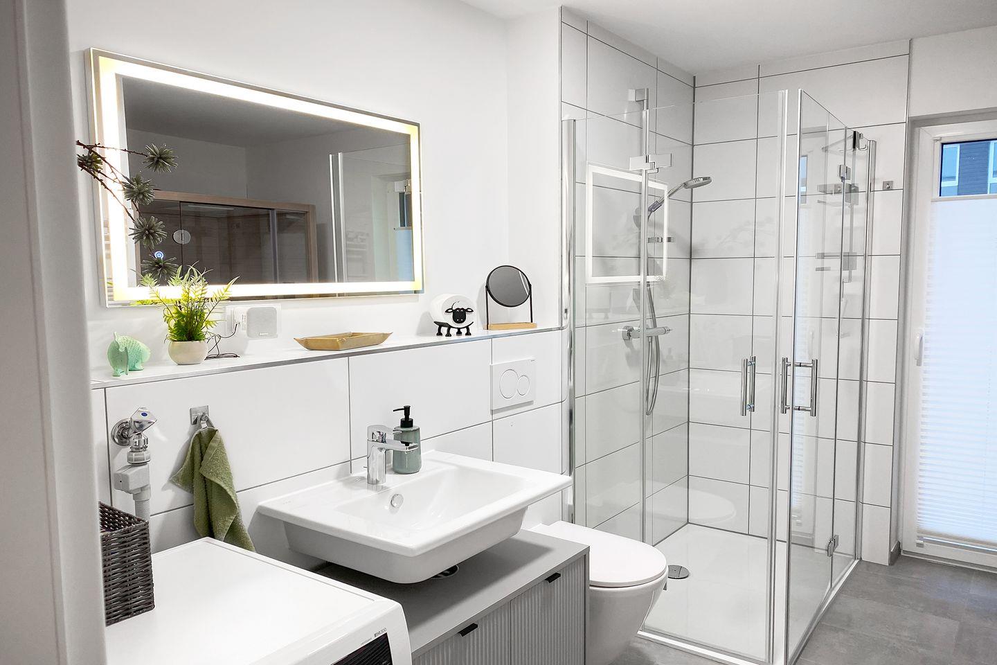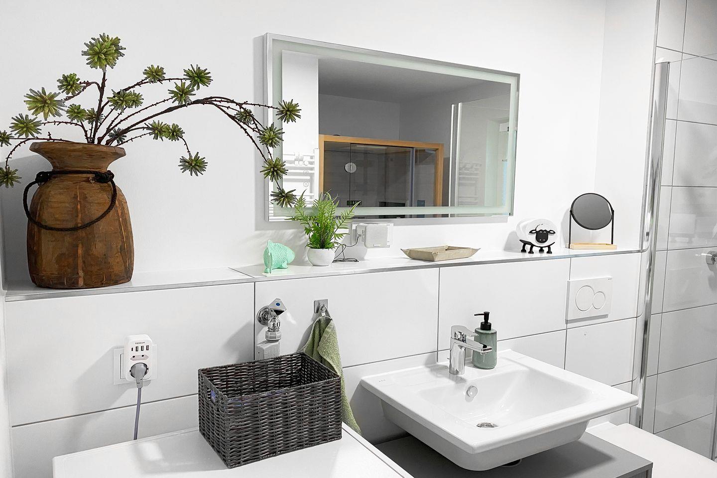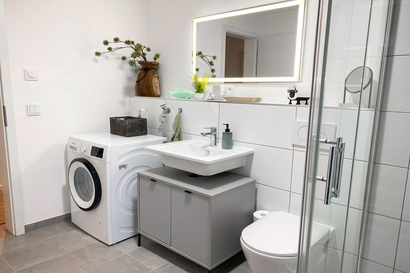Nach einem Tag an der Nordseeluft wartet das Wellnessbad mit Infrarotsauna auf dich. Die ebenerdige Dusche, stilvolle Details und eine Waschmaschine machen diesen Raum zur Wohlfühloase.