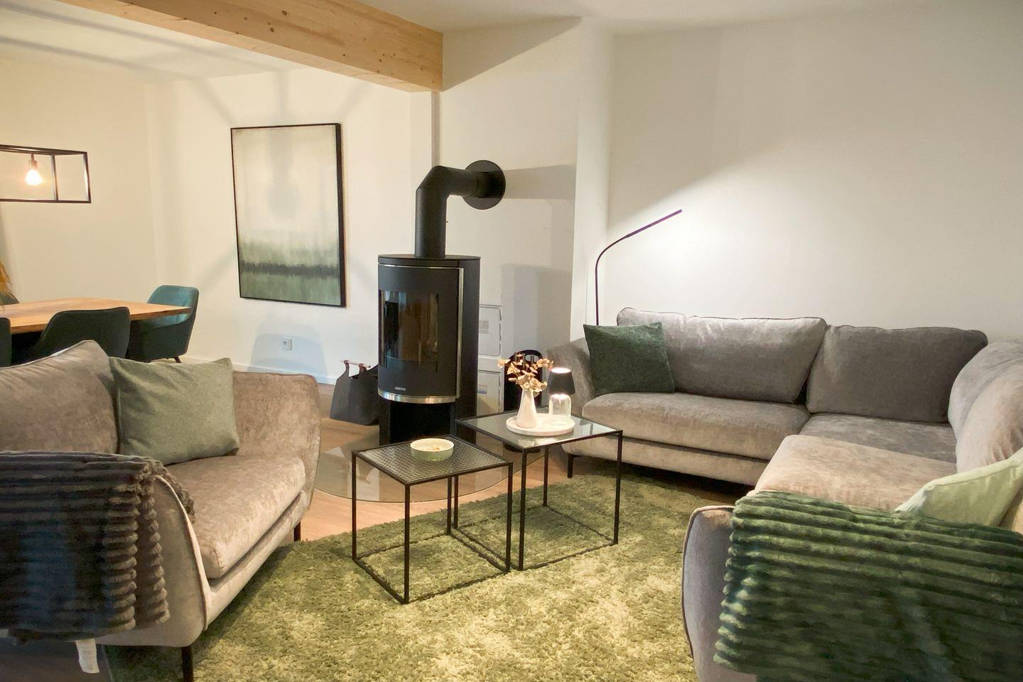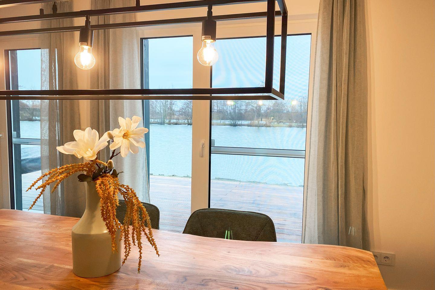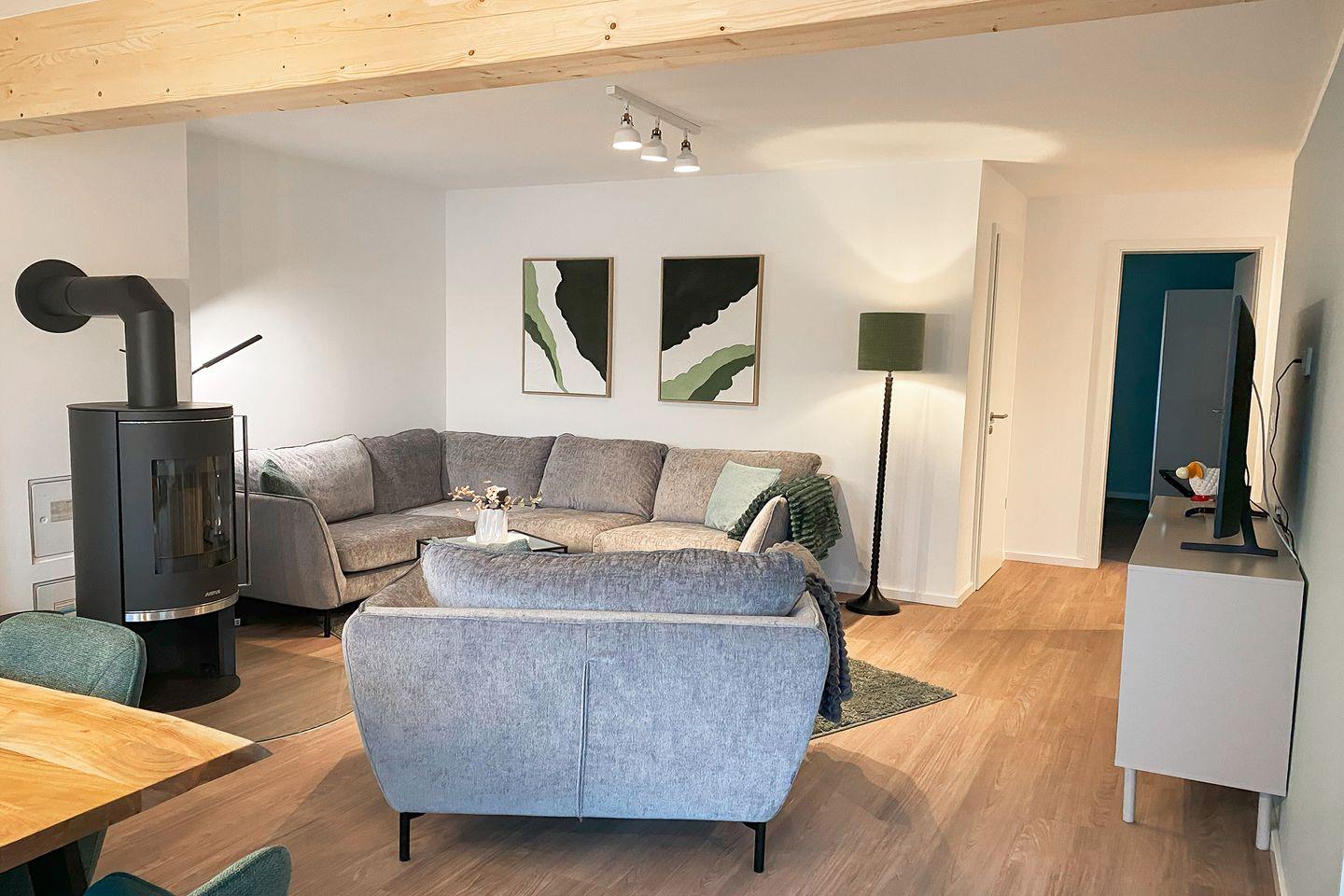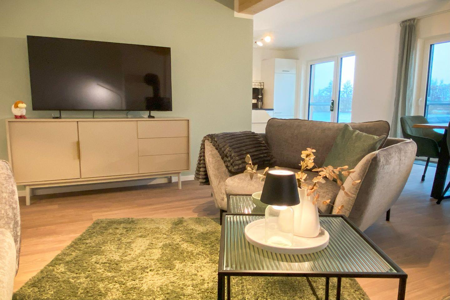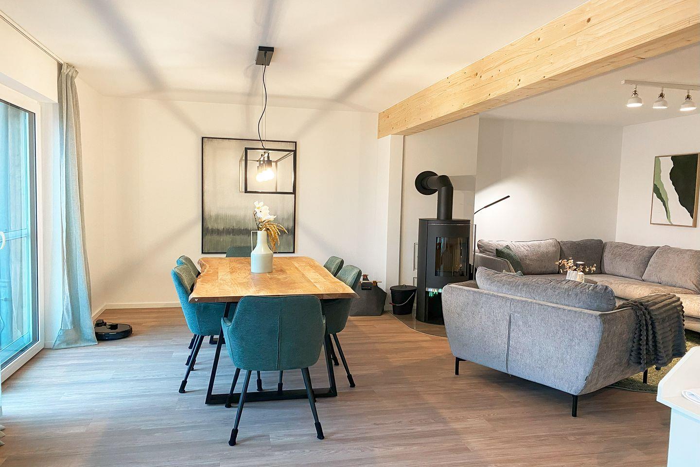Die lichtdurchflutete Wohnung wurde von einer erfahrenen Raumgestalterin mit viel Liebe zum Detail eingerichtet. Harmonische Farben, hochwertige Materialien und stilvolle Möbel sorgen für eine behagliche Atmosphäre. Im offenen Wohnbereich lädt ein gemütlicher Holzofen zu entspannten Stunden ein – perfekt, um es dir nach einem Spaziergang an der frischen Luft so richtig warm und gemütlich zu machen. Die moderne Küche – ausgestattet mit Tassimo-Kaffeemaschine, Mikrowelle, Saftpresse und Sodastream – bietet alles für kulinarische Genüsse. Durch bodentiefe Fenster genießt du jederzeit den Blick auf Terrasse und Wasser.