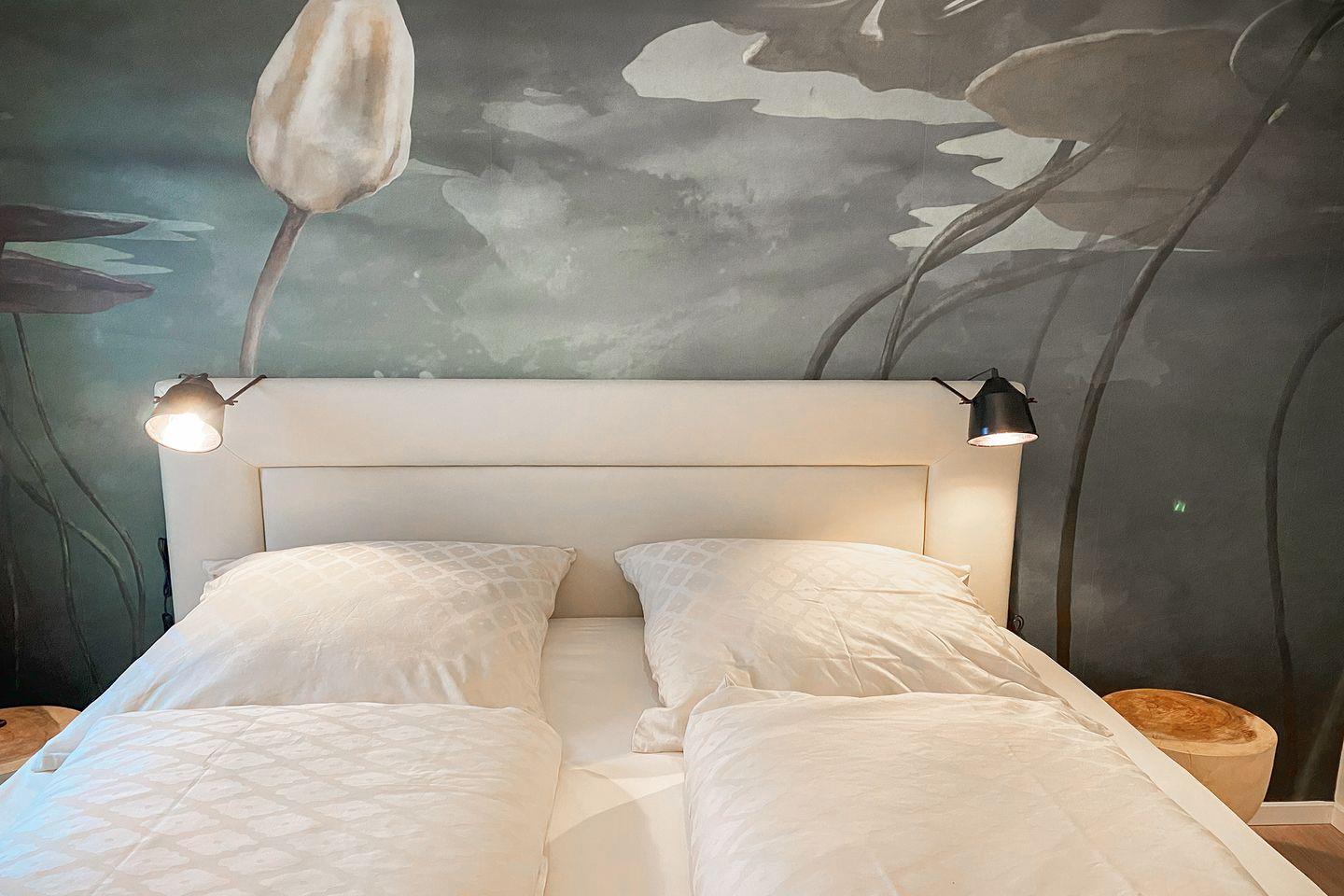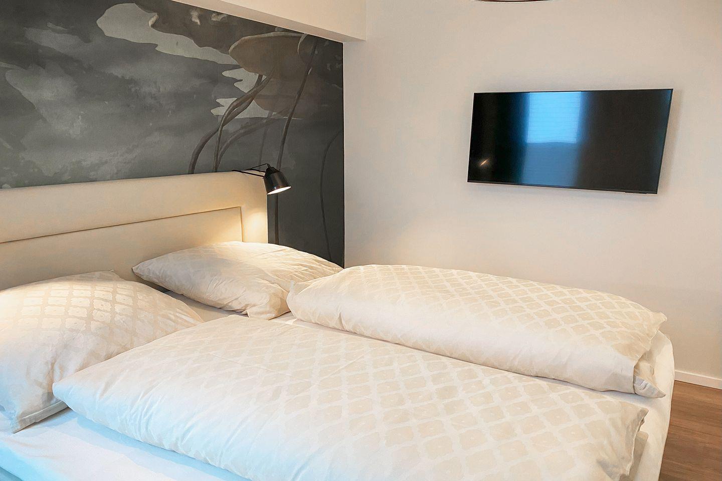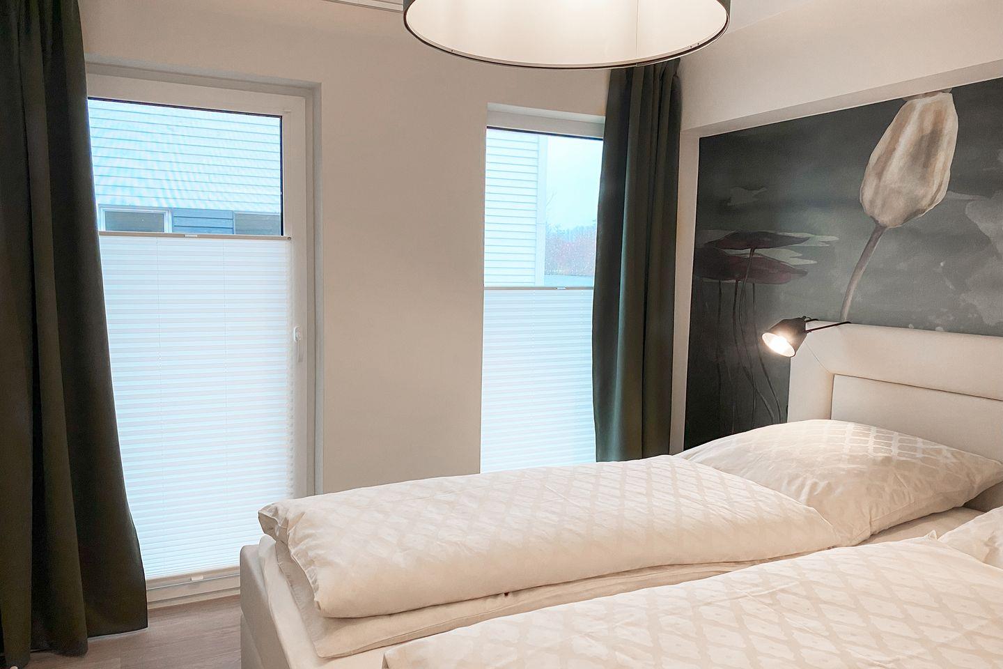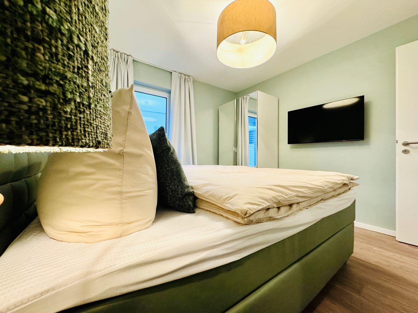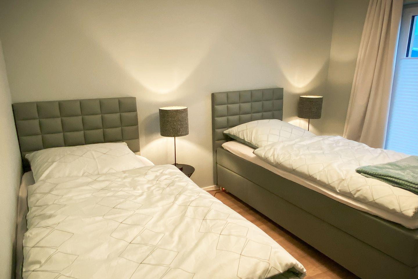 Im Hauptschlafzimmer sorgt ein hochwertiges Boxspringbett für erholsame Nächte. Verdunkelungsvorhänge und warme Farben schaffen eine ruhige Atmosphäre. Das zweite Schlafzimmer ist mit zwei flexiblen Einzel-Boxspringbetten ausgestattet, die sich bei Bedarf zu einem Doppelbett verbinden lassen – ideal für Kinder, Freunde oder Paare.