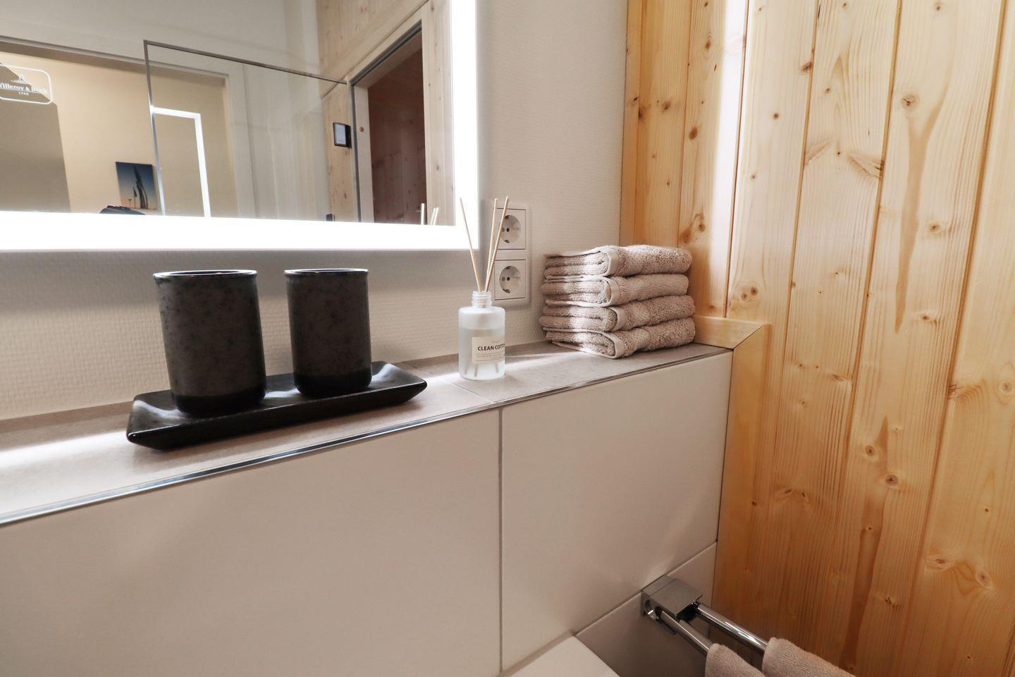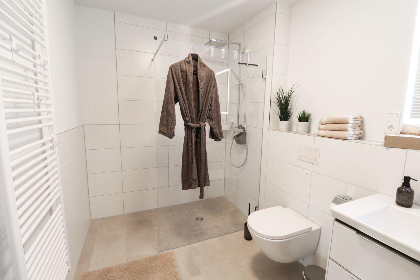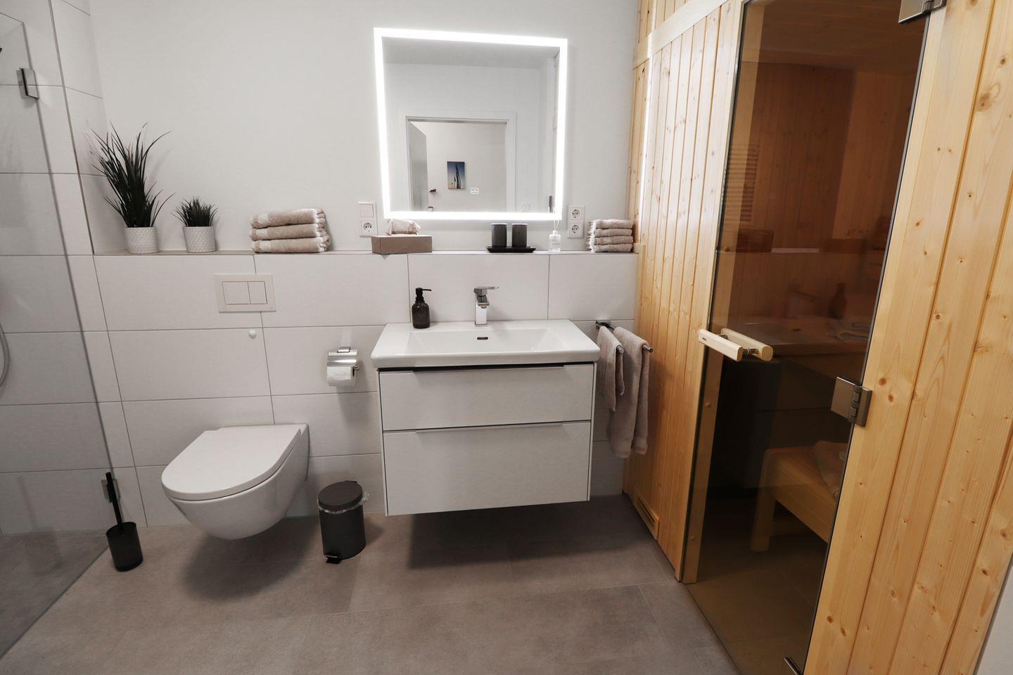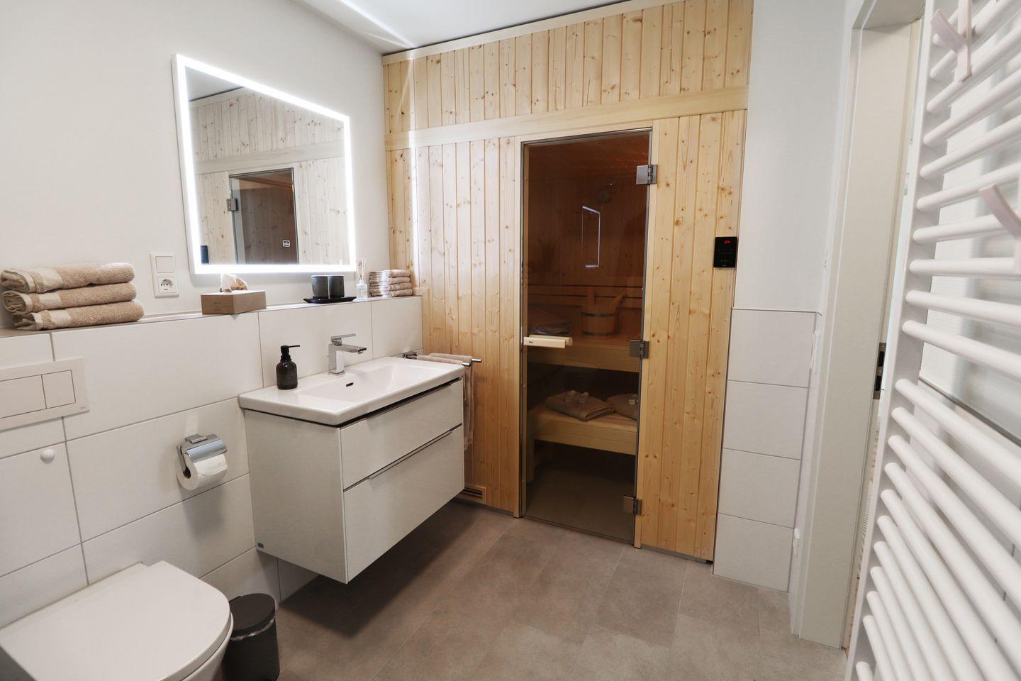 Genieße dein privates Spa: Im Wellnessbad erwarten dich eine eigene Sauna und eine bodentiefe Dusche – ideal zum Entspannen nach einem Tag am Strand oder einer Wattwanderung.