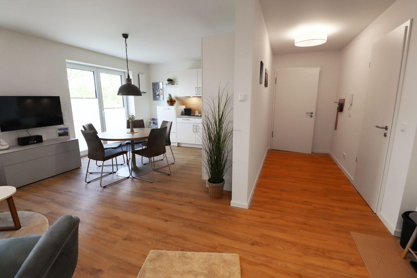 Im offenen Wohnbereich kannst du die Seele baumeln lassen. Große Fenster sorgen für Tageslicht, während der angrenzende Balkon zum Frühstück in der Sonne oder zum Sundowner einlädt. Die moderne Küche ist voll ausgestattet – inklusive Spülmaschine, Backofen, Kühl-Gefrierkombination, Senseo- und Filterkaffeemaschine. Der Essbereich ist der perfekte Ort für gemeinsame Mahlzeiten und Spieleabende.
