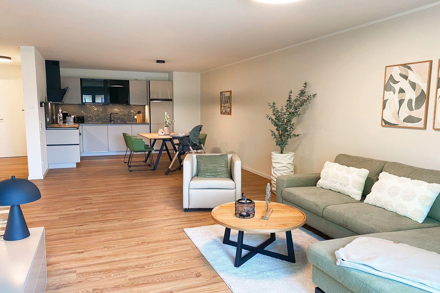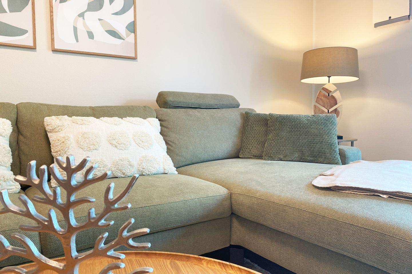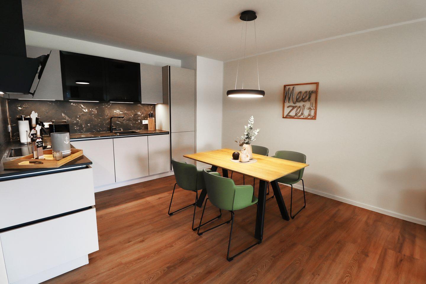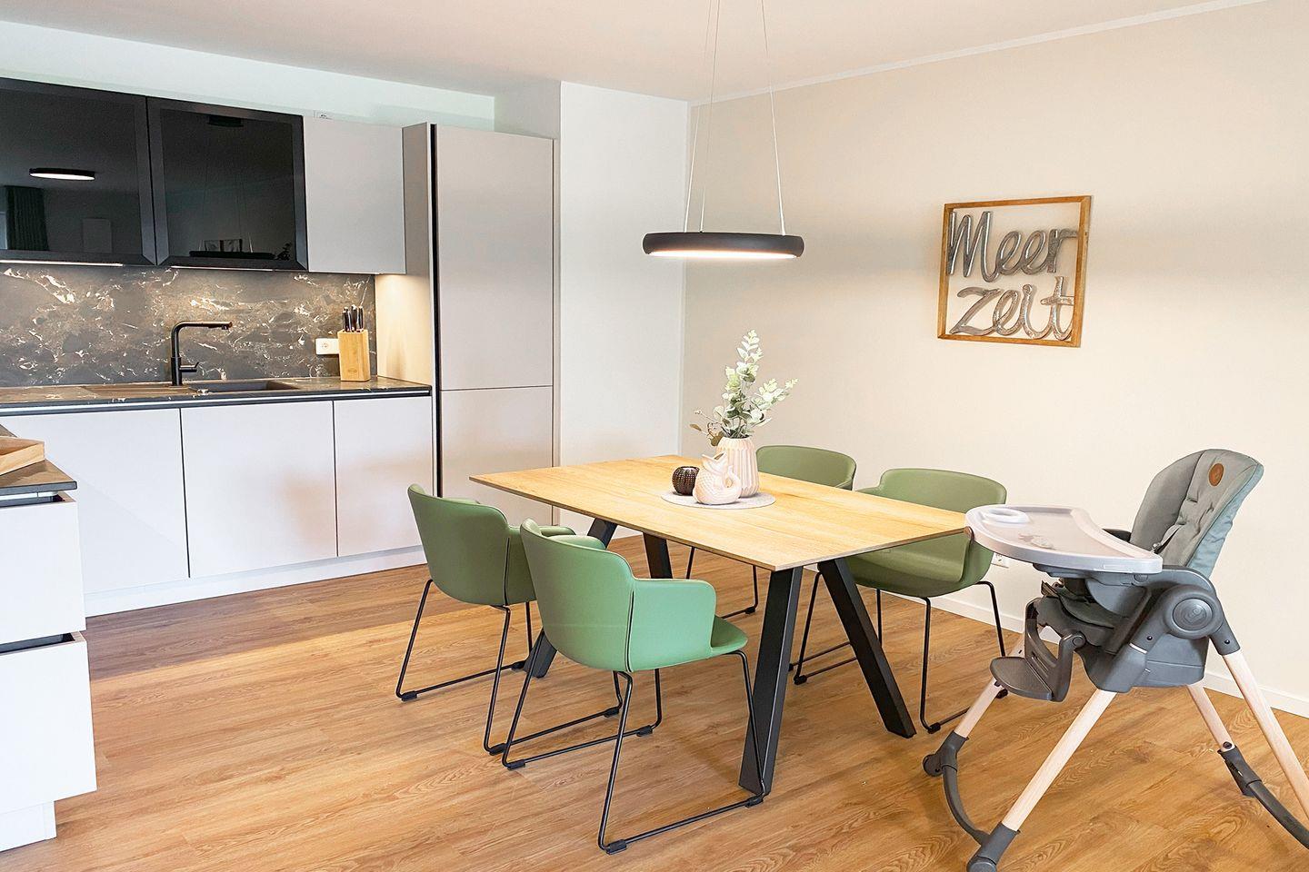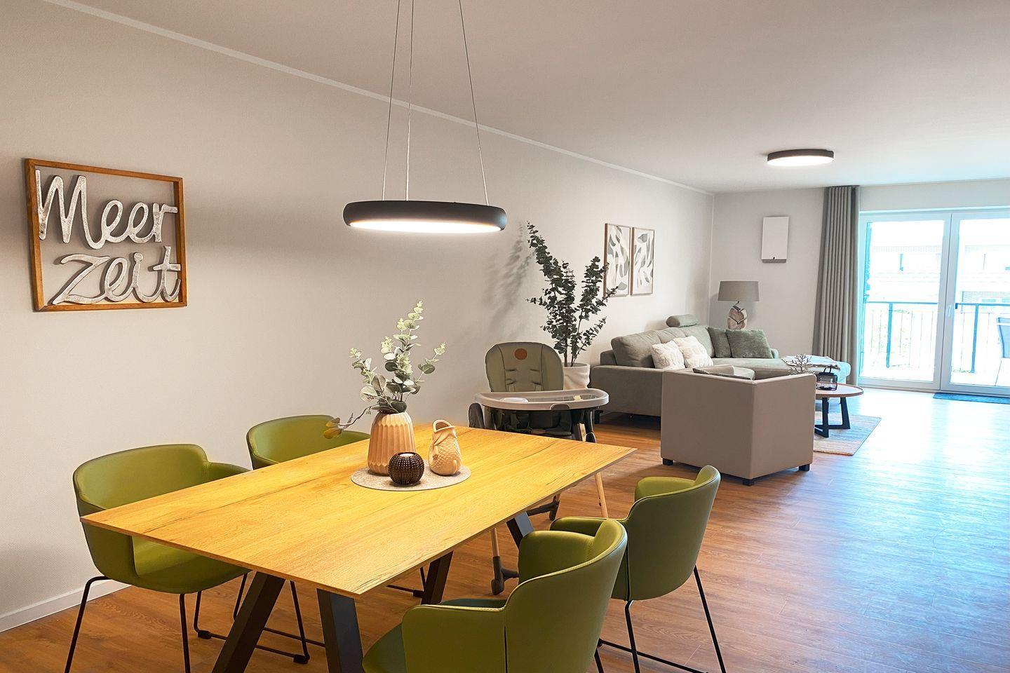 Der offene Wohnbereich mit hochwertigem Schlafsofa, großem Smart-TV und direktem Zugang zum Balkon lädt zum Entspannen ein. Helle Fenster schaffen eine freundliche Atmosphäre, die moderne Küche ist voll ausgestattet – ideal für Kochabende, Frühstück in der Sonne oder Spiele mit den Kids.