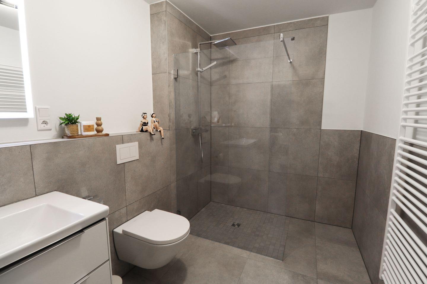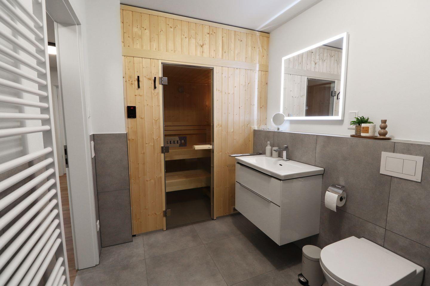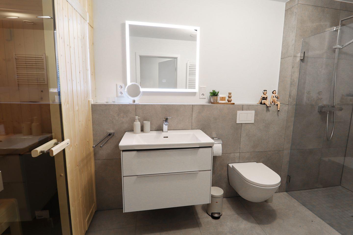 Das moderne Bad verfügt über eine bodentiefe Dusche und eure ganz private Sauna – perfekt zum Aufwärmen nach Strandtagen oder Wattwanderungen.