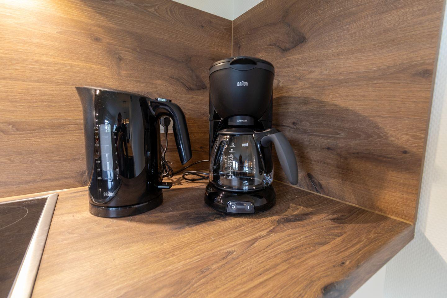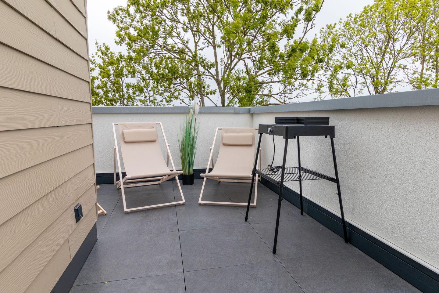 Der offene Wohnbereich mit Zugang zur umlaufenden Dachterrasse schafft eine entspannte Atmosphäre. Zwei Personen finden auf dem Schlafsofa Platz. Große Fenster und Fliegengitter an allen Fenstern sorgen für Licht und Luft ohne ungebetene Gäste. Für gemütliche Abende stehen ein Smart-TV und Gesellschaftsspiele bereit. Die voll ausgestattete Küche mit hochwertigen Geräten, Filter- und Nespresso-Maschine sowie ein großer Esstisch bieten alles für gemeinsame Mahlzeiten. Ein Elektrogrill lädt zu geselligen Abenden auf der Terrasse ein.