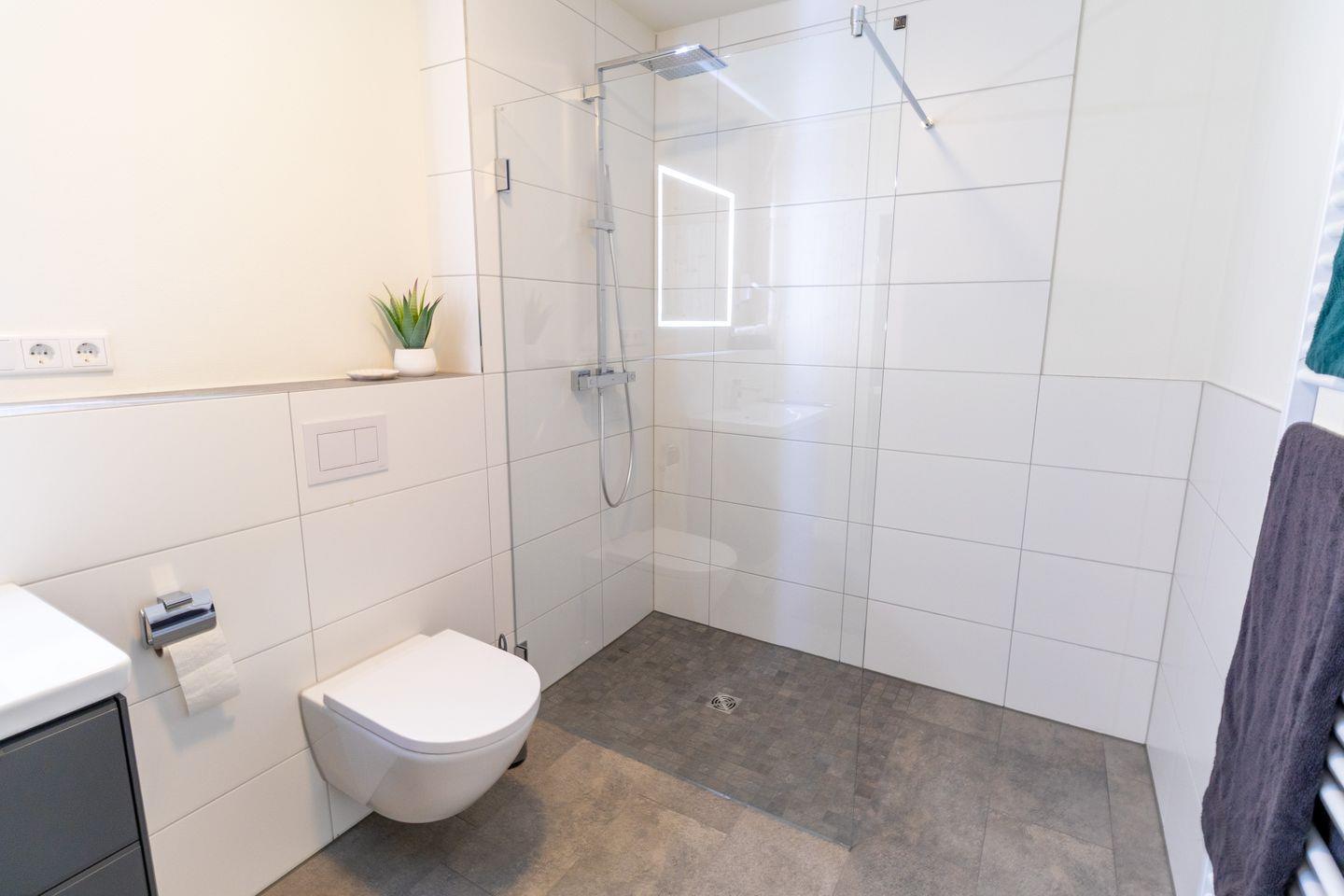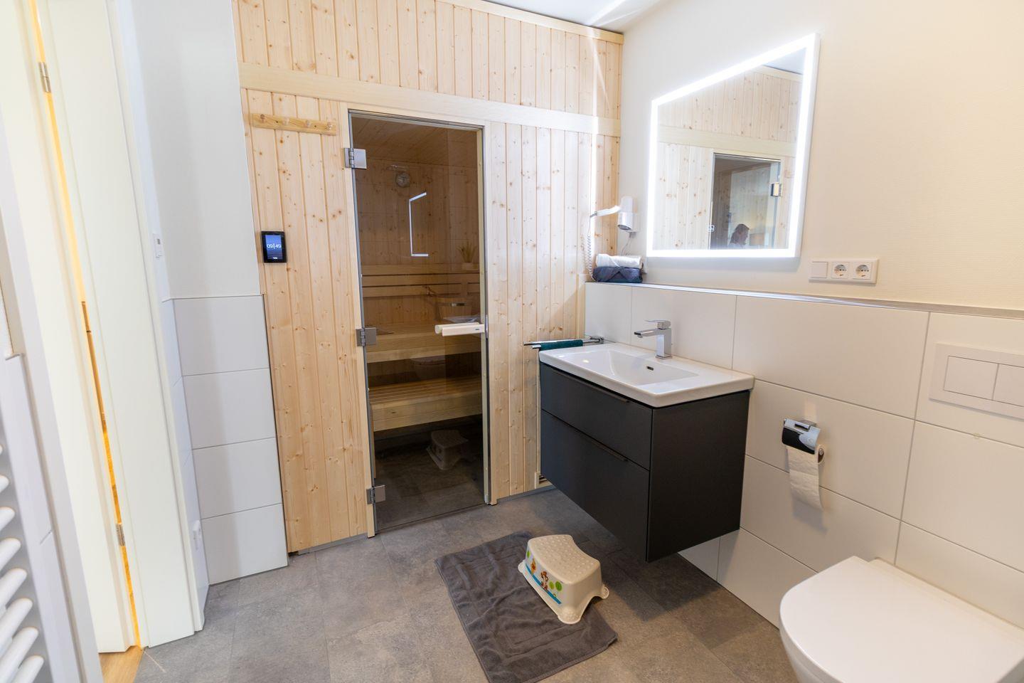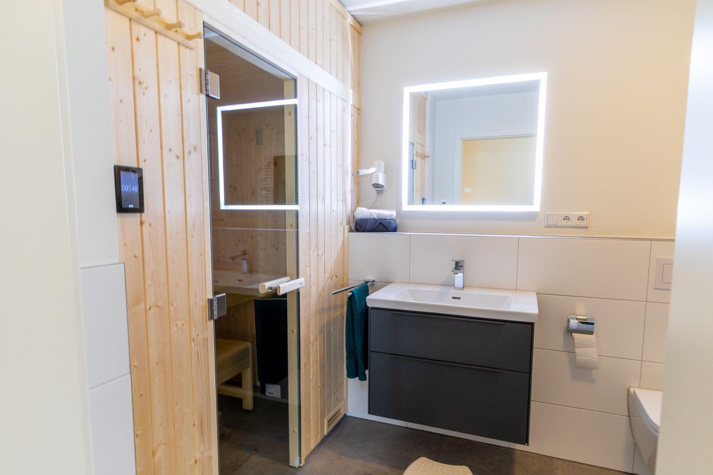 Das moderne Bad überzeugt mit bodentiefer Dusche, stilvollem Design und eurer privaten Sauna – für eine wohltuende Auszeit nach einem Tag am Meer.