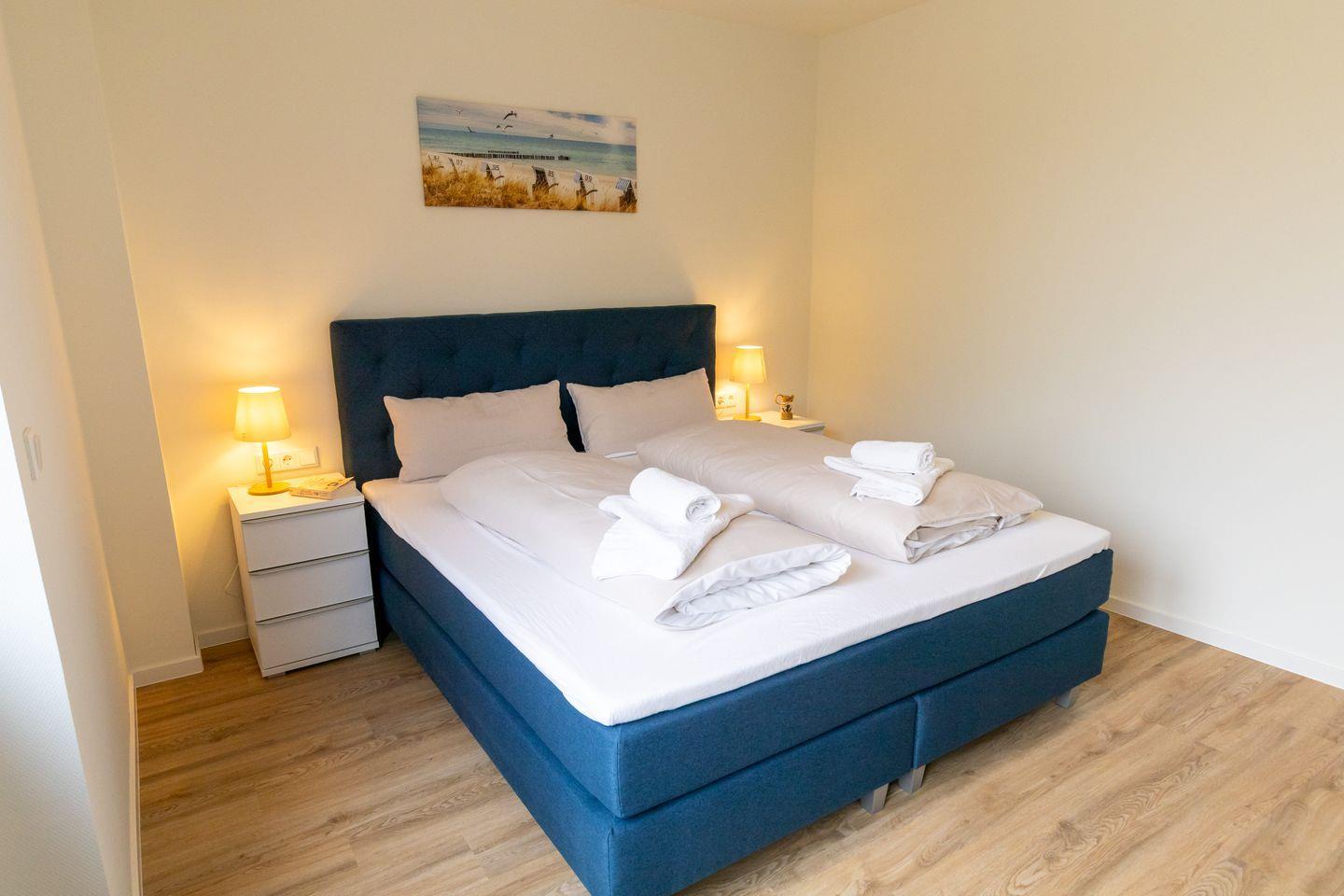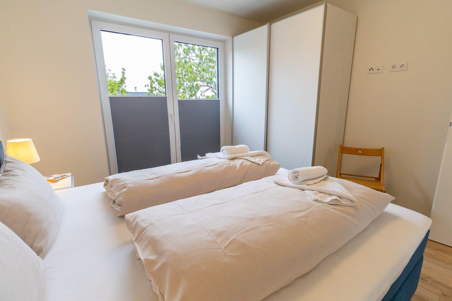 Zwei Schlafzimmer mit komfortablen Boxspringbetten (180 × 200 cm), direktem Zugang zur Terrasse, Verdunkelungsplissees, zusätzlichen Verdunkelungsvorhängen sowie Fliegengittern sorgen für erholsame Nächte – auch an hellen Sommertagen.