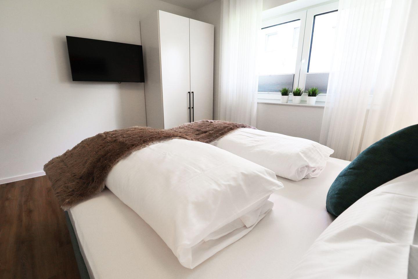Im Schlafzimmer erwartet euch ein hochwertiges Boxspringbett (180 × 200 cm), Smart-TV und Verdunkelungsplissees für erholsame Nächte. Das bequeme Schlafsofa im Wohnbereich bietet Platz für eine dritte erwachsene Person oder zwei Kinder.
