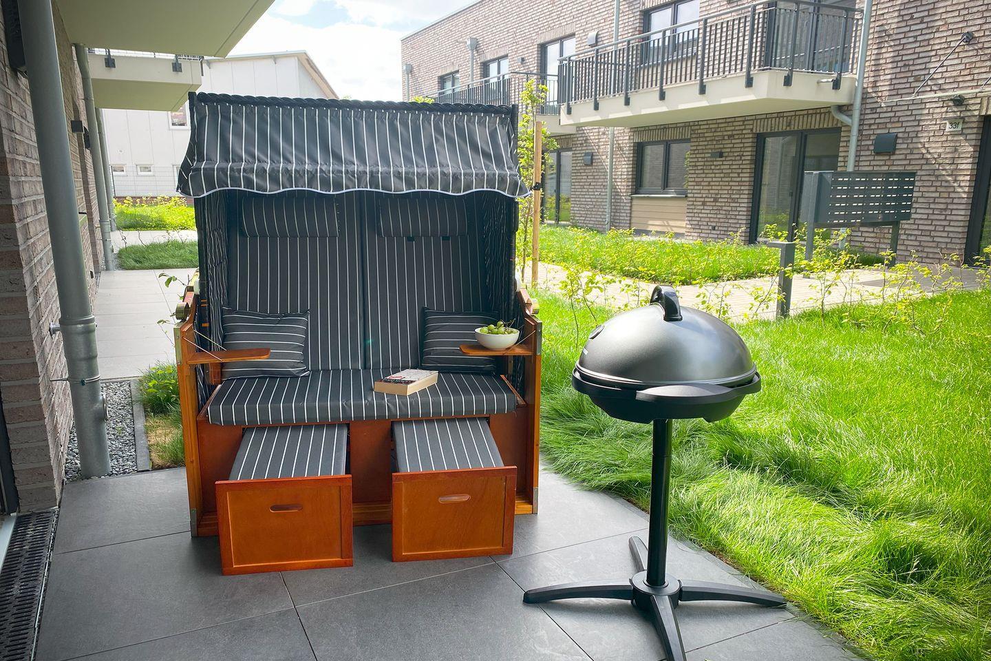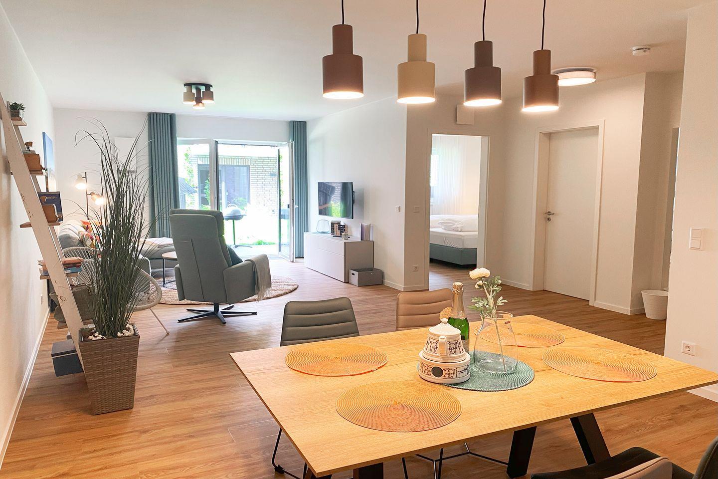 Ein extrabreiter Parkplatz direkt vor der Wohnung ermöglicht bequemes Ein- und Aussteigen. Fahrräder und E-Bikes finden Platz im abschließbaren Fahrradraum. WLAN, Smart-TV und kontaktloser Check-in via Schlüsseltresor sind selbstverständlich inklusive.