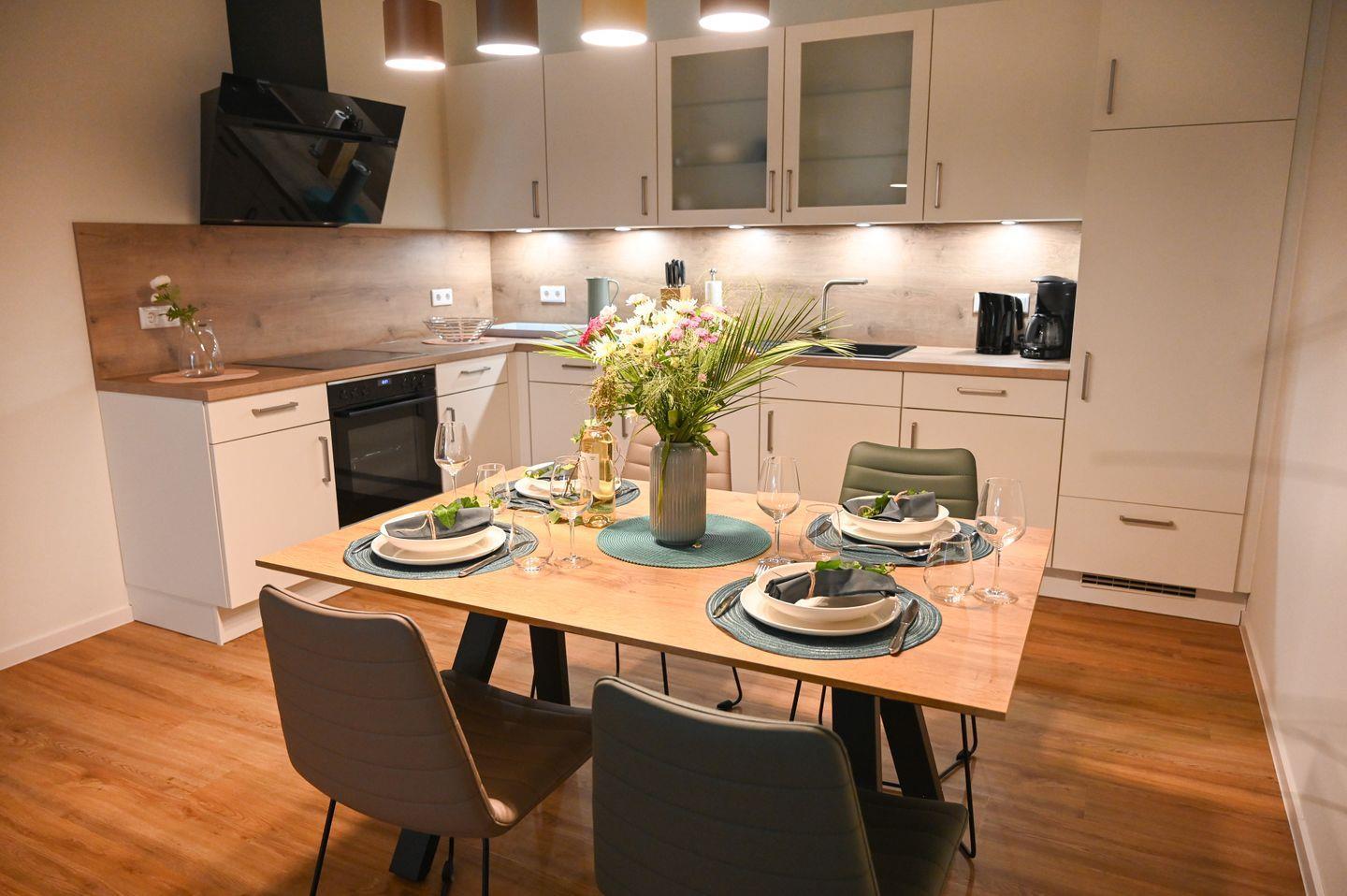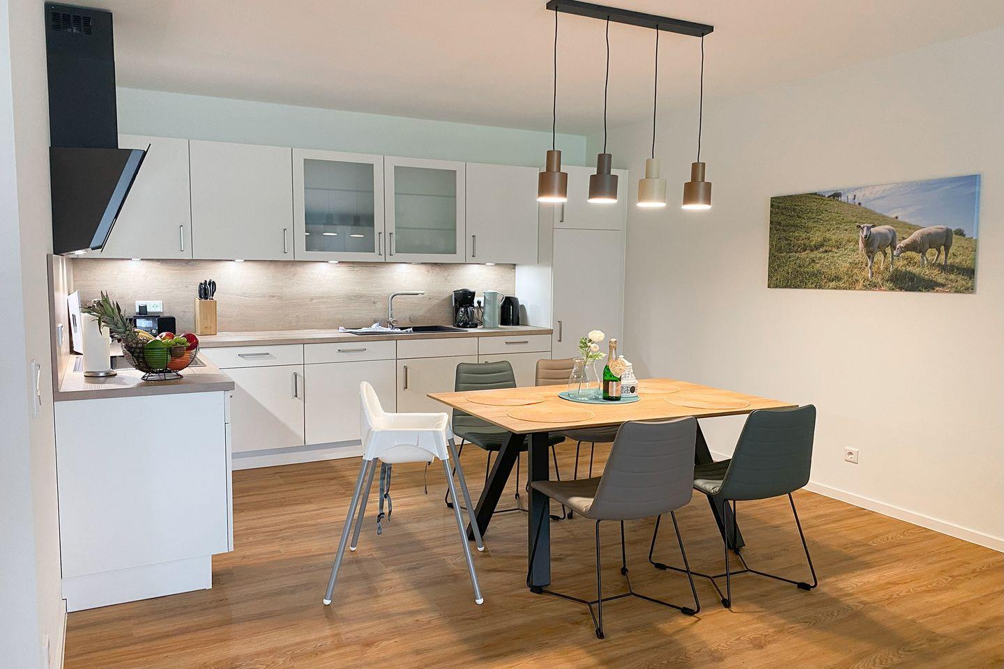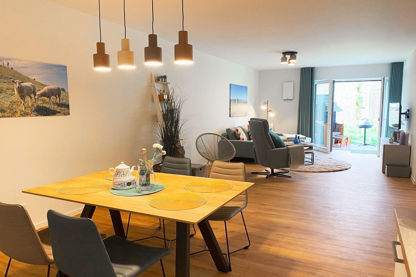 Der offene Wohnbereich mit großen Fenstern, direktem Gartenzugang und möblierter Terrasse sorgt für eine helle, freundliche Atmosphäre. Die voll ausgestattete Küche mit hochwertigen Geräten, Raclette- und Elektrogrill macht das Kochen zum Vergnügen – ob für ein gemeinsames Abendessen oder gemütliche Spieleabende am großen Esstisch.
