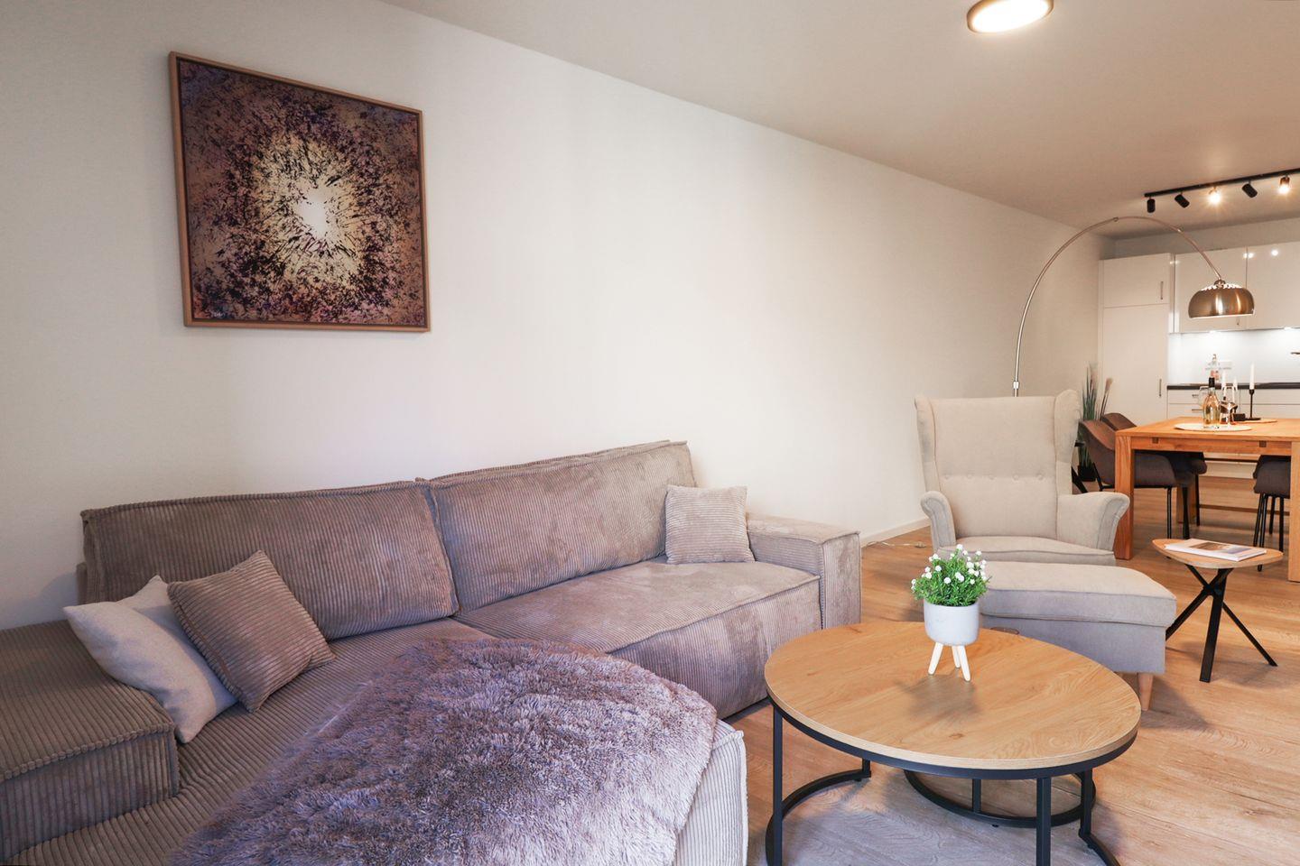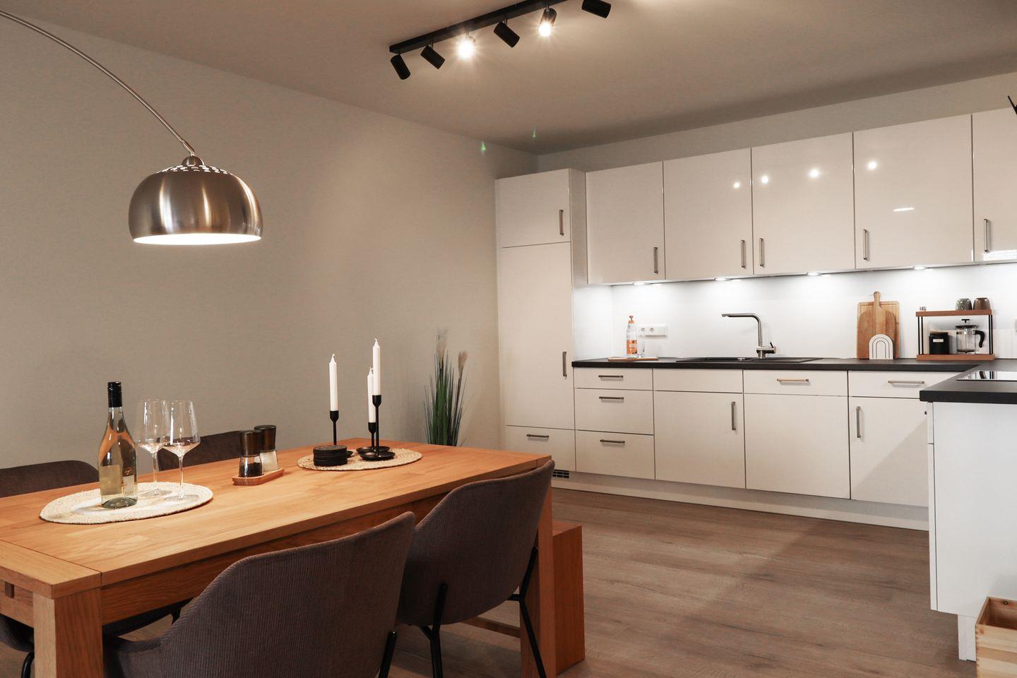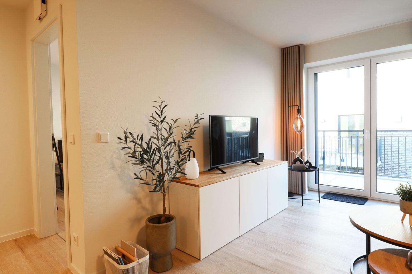 Im offenen Wohnbereich kannst du dich auf ein gemütliches Schlafsofa, einen Smart-TV und einen einladenden Esstisch freuen. Große Fenster bringen viel Licht in den Raum, und der direkte Zugang zum Balkon macht deinen Urlaub perfekt. Die offene Küche ist voll ausgestattet – inklusive Spülmaschine, Backofen und Kaffeemaschine.