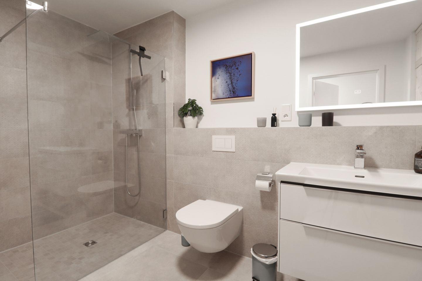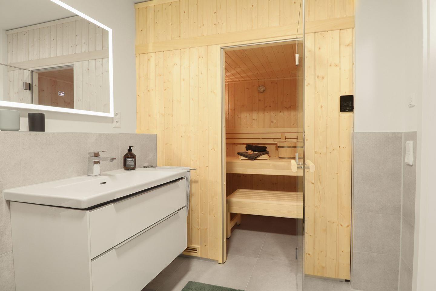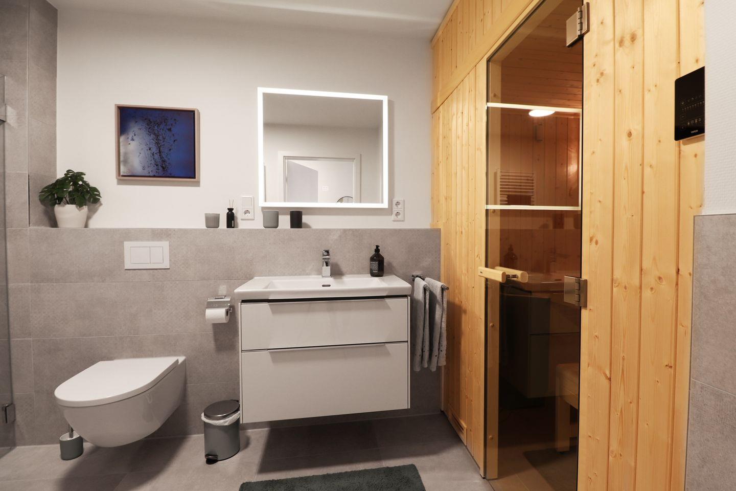 Das moderne Duschbad ist hell gestaltet und überzeugt mit einer ebenerdigen Dusche, einem Waschtisch mit Spiegel und einem Haartrockner. Highlight: deine private Sauna für wohlige Entspannung – auch an kühleren Tagen.