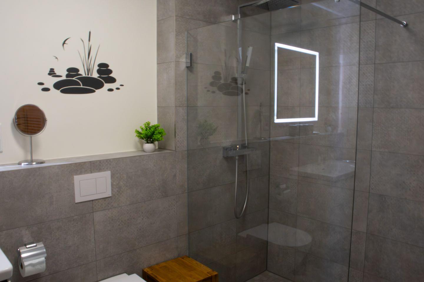 Im stilvollen Badezimmer findest du deine private Sauna – perfekt für entspannte Stunden nach einem Spaziergang am Deich oder einer Wattwanderung. Die bodengleiche Dusche ergänzt das Wohlfühlangebot und bringt Spa-Gefühl in den Urlaub.