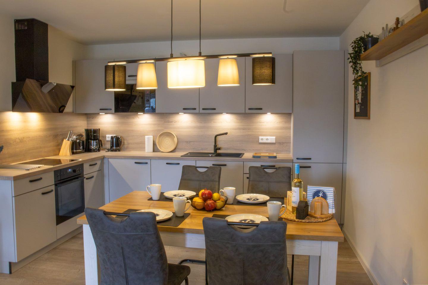 Der offene Wohnbereich empfängt dich mit einer bequemen Sitzecke, einem großen Smart-TV und lichtdurchfluteten Fenstern für eine angenehme Atmosphäre. Auf dem hochwertigen Schlafsofa finden zwei weitere Gäste Platz. Die offene Küche mit modernen Geräten lädt zum gemeinsamen Kochen ein – den perfekten Rahmen bietet der angrenzende Essbereich. Vom Wohnzimmer gelangst du direkt auf den Balkon – ideal für sonnige Frühstücke oder entspannte Abende mit frischer Meeresbrise.