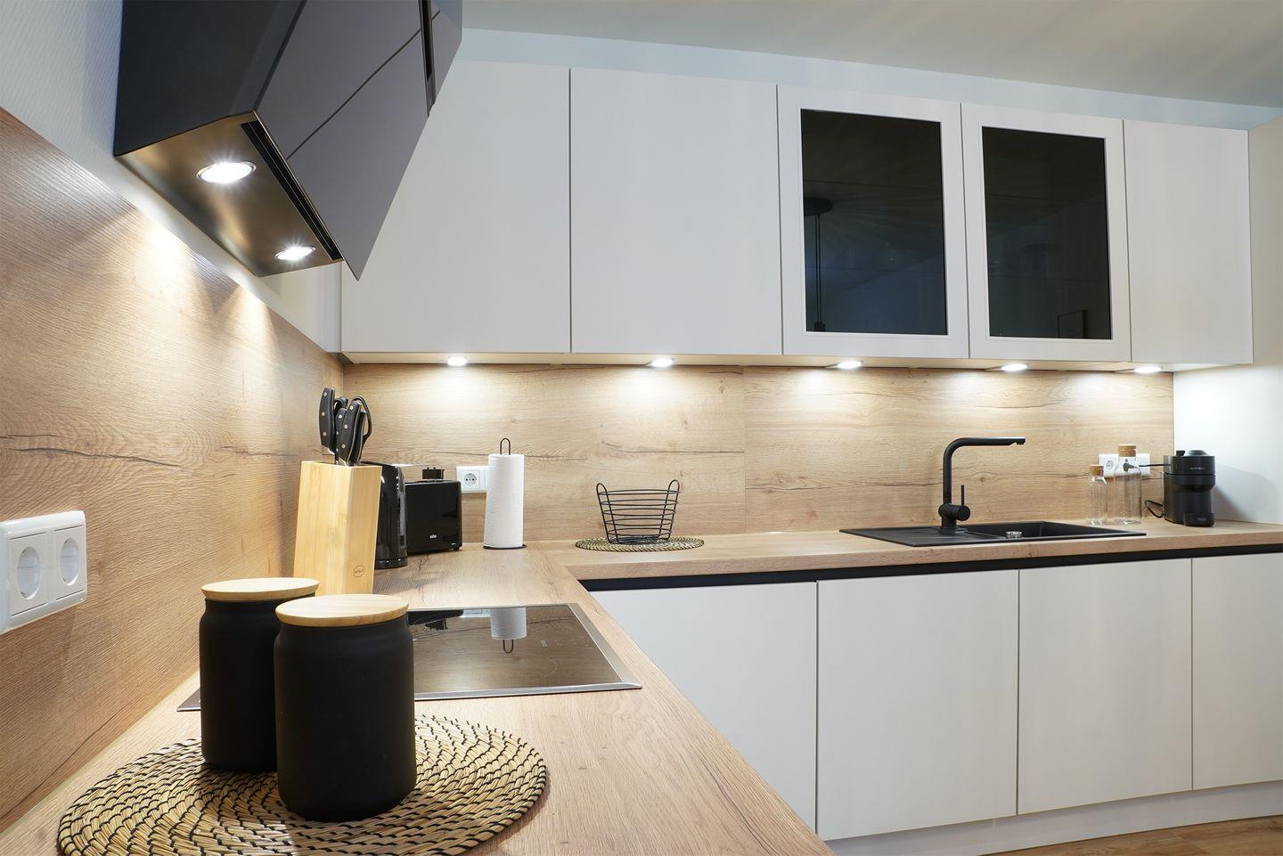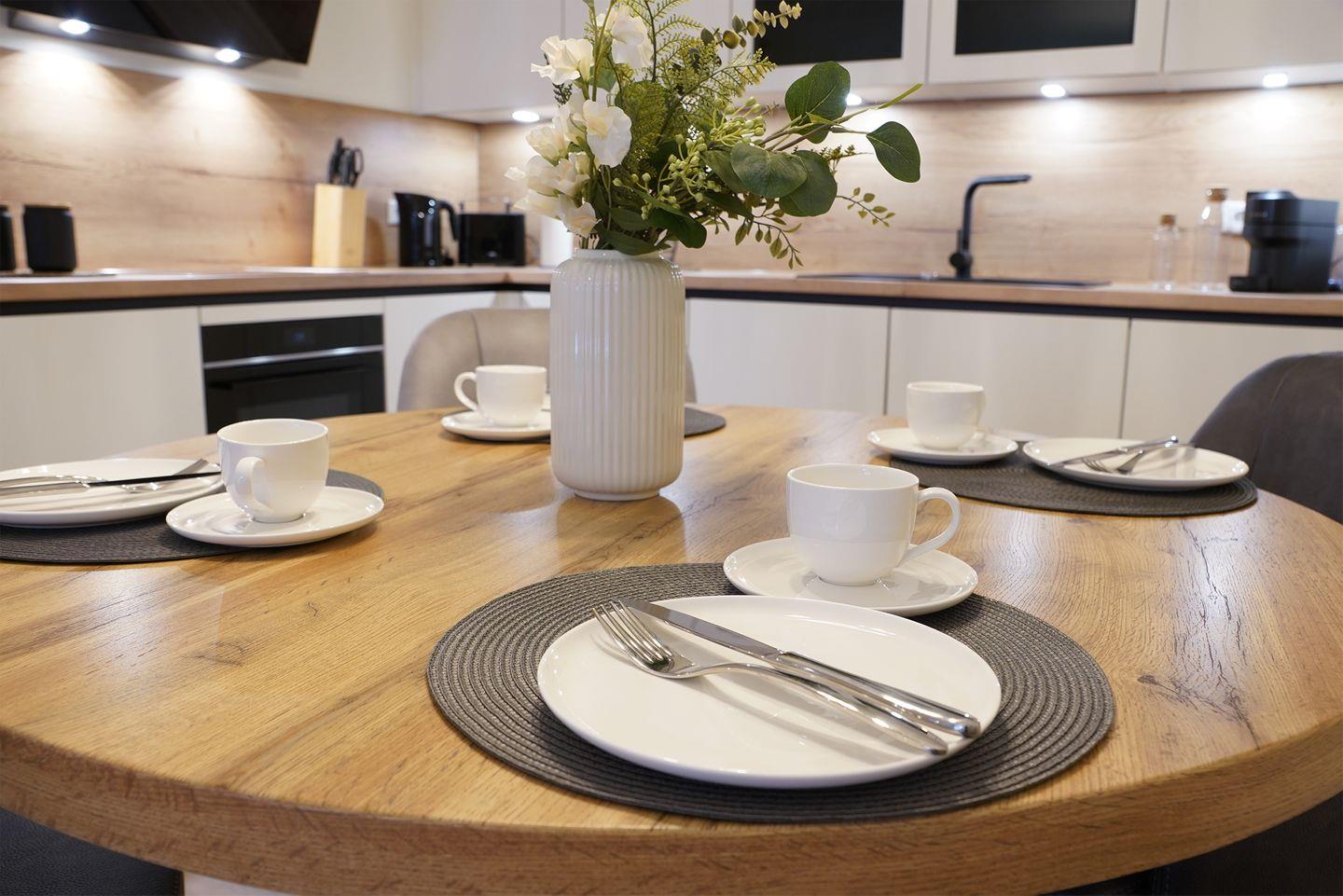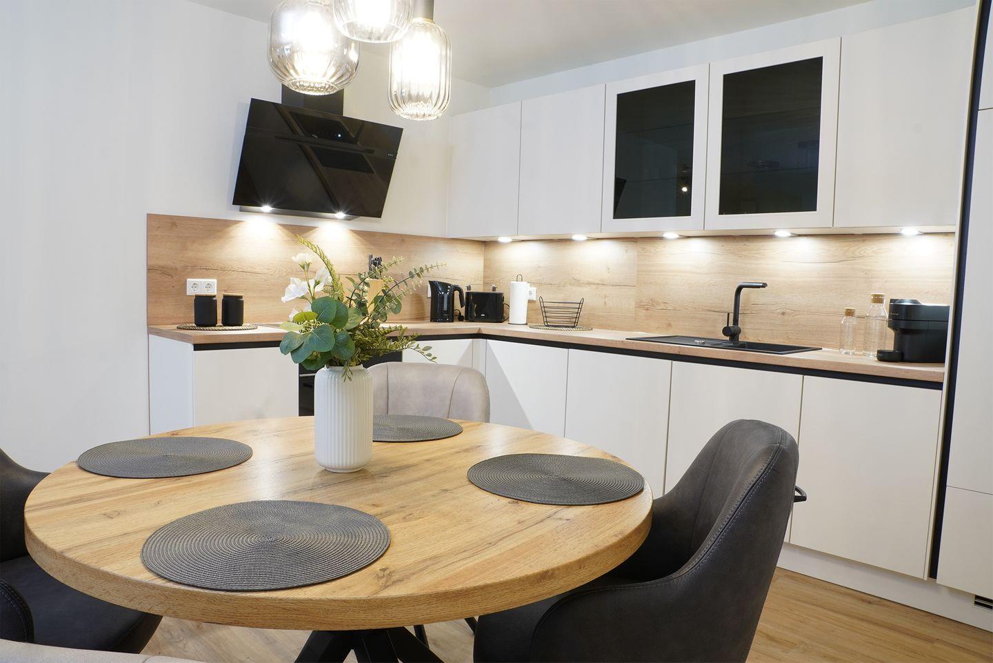 Der offene Wohnbereich bietet dir viel Licht und eine klare, moderne Gestaltung. Große Fenster sorgen für Helligkeit. Die Sofaecke lädt zum Lesen, Streamen oder Ausruhen ein. Küche, Essplatz und Wohnraum gehen ineinander über. Du kochst gemeinsam, sitzt lange am Tisch oder lässt den Tag ruhig ausklingen. Der Balkon erweitert den Wohnraum nach draußen. Im Strandkorb sitzt du windgeschützt und bequem.