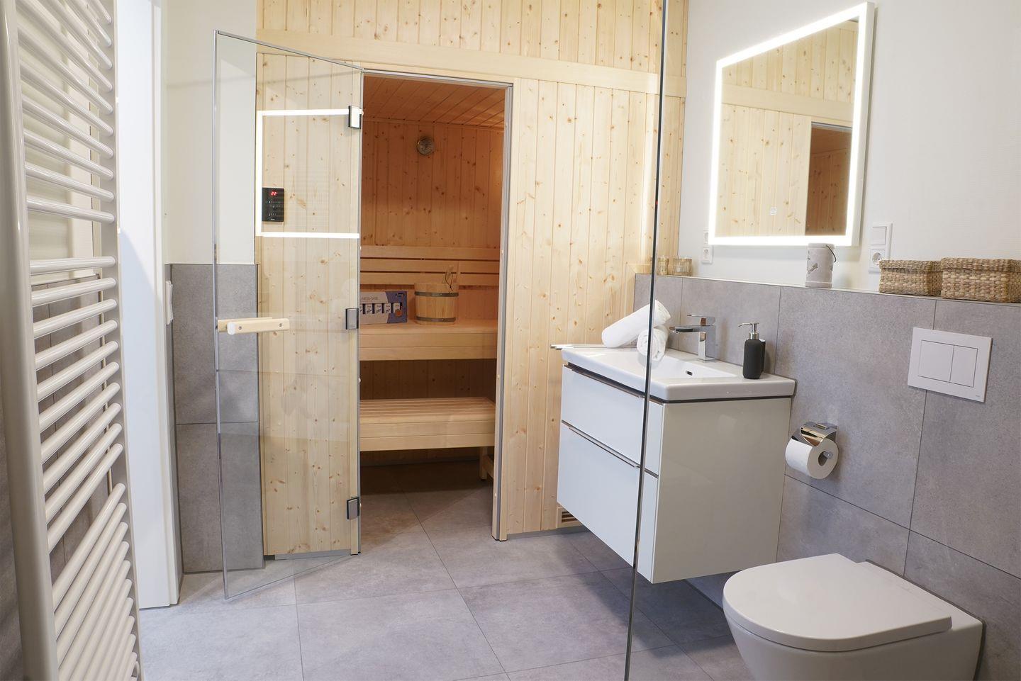 Das moderne Bad verfügt über eine bodengleiche Dusche und deine eigene Sauna. Du wärmst dich nach einem Strandspaziergang auf und gönnst dir bewusst Zeit für dich. Auch an kühleren Tagen bleibt dein Urlaub entspannt.