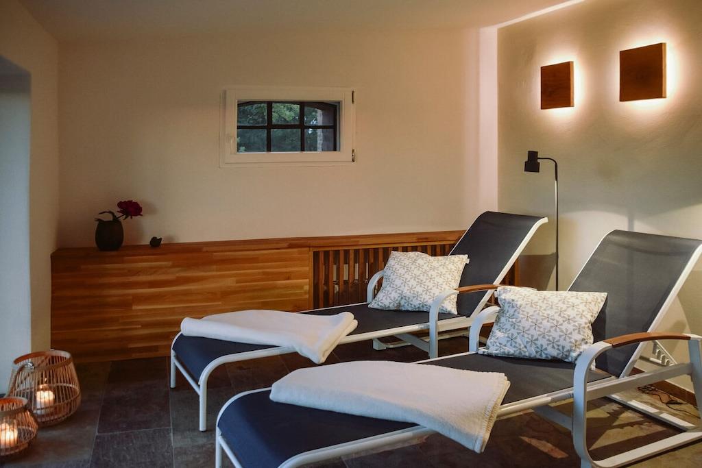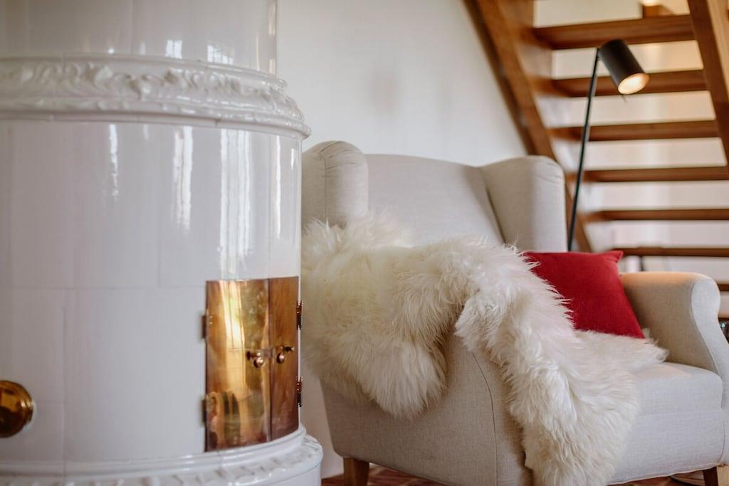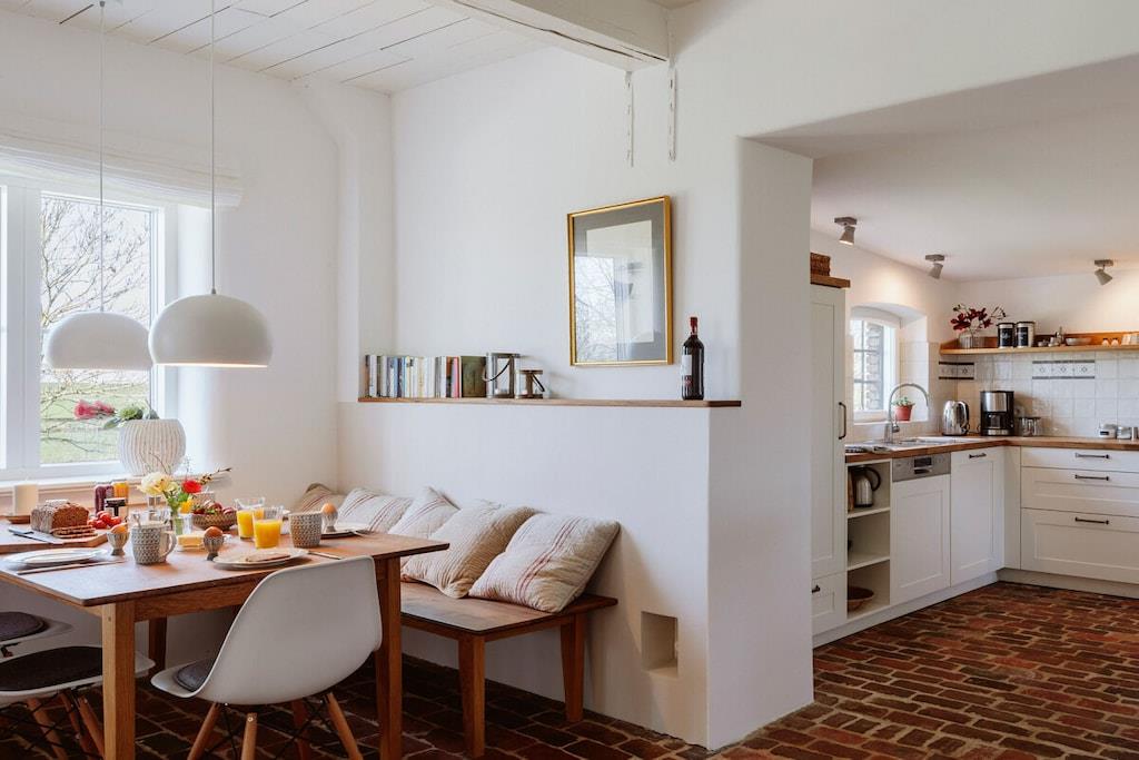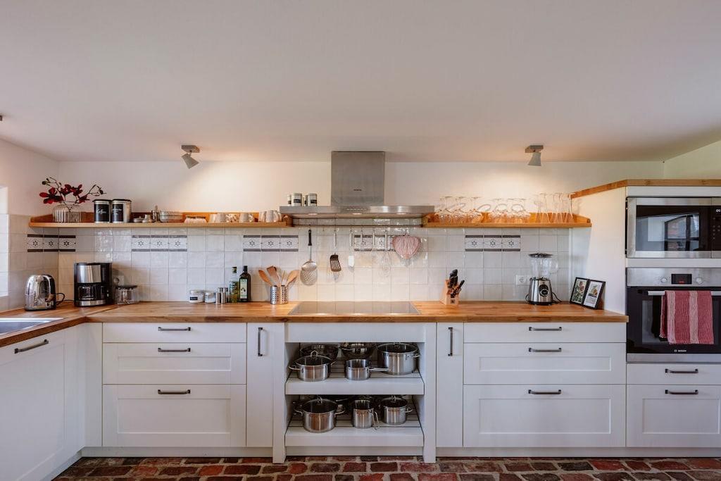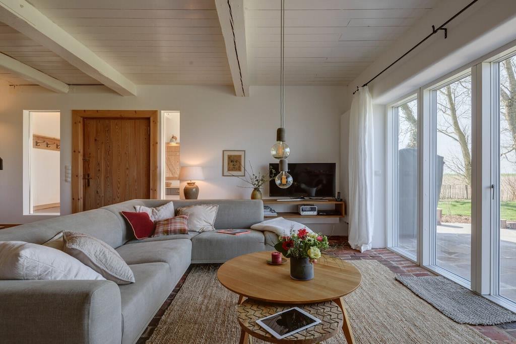 *** Besuchen Sie unsere Webseite: www.huus-uelvesbuell.de *** Inmitten der weiten Marschlandschaft Eiderstedts steht unser fast 120 Jahre altes Reetdachhaus Huus Uelvesbüll, das wir 2017 mit Liebe zum Detail grundlegend saniert haben. Aus jedem Fenster unseres lichtdurchfluteten Hauses mit den drei Hausteilen Ost, Süd und West schauen Sie in die Weite: auf Deiche, Felder und grasende Schafe. Die äußere Weite wird auch innen spürbar: durch eine schnörkellose, skandinavisch inspirierte und sehr hochwertige Einrichtung und Ausstattung. Im Hausflügel Richtung Südwesten finden Sie auf 150qm ein Wohnzimmer mit antikem schwedischen Kachelofen und angrenzender offener Küche und Terrasse, drei Schlafzimmer für bis zu 6 Personen (7. Person auf Anfrage), zwei Bäder sowie eine Gästetoilette. Im Haus steht Ihnen ein großzügiger Saunabereich mit Ruheraum zur Verfügung. Eine Aufladesäule für E-Autos ist auf dem Parkplatz des Hauses verfügbar.