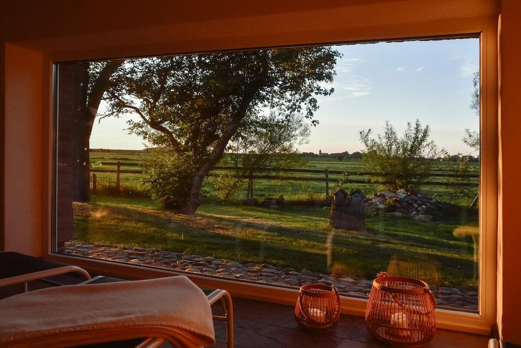 Entdecken Sie Huus Uelvesbüll, ein liebevoll saniertes Reetdachhaus mit Sauna und Blick auf die weite Marschlandschaft.