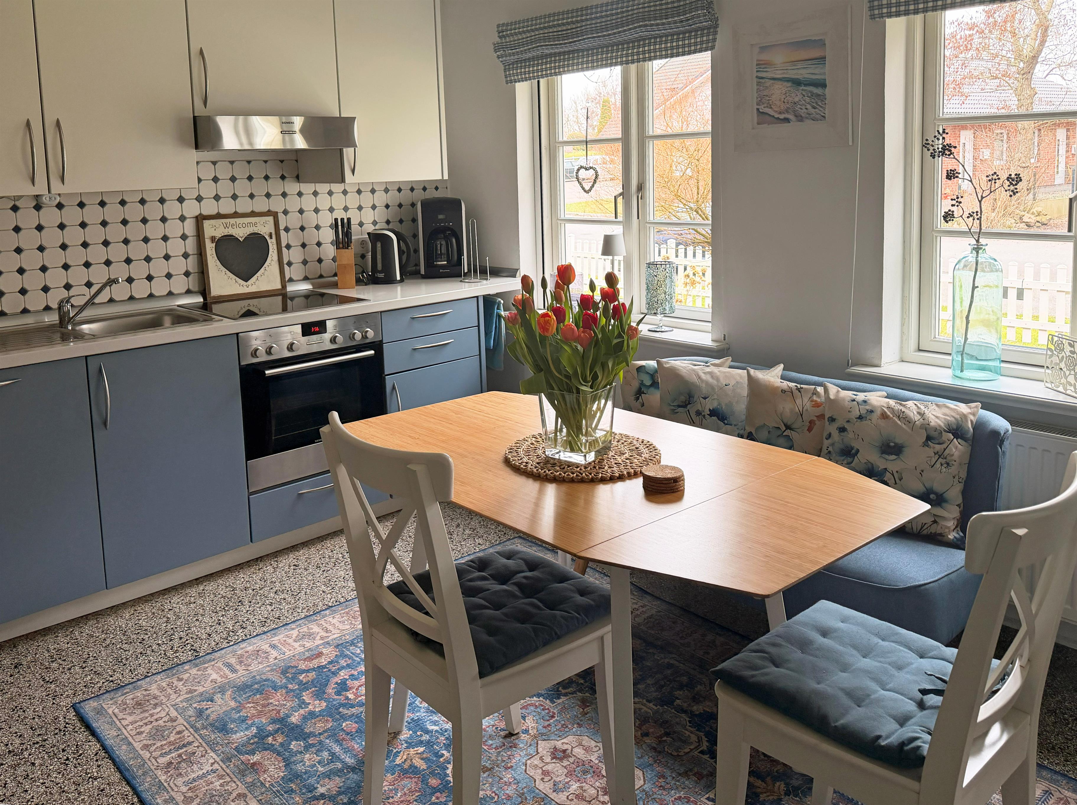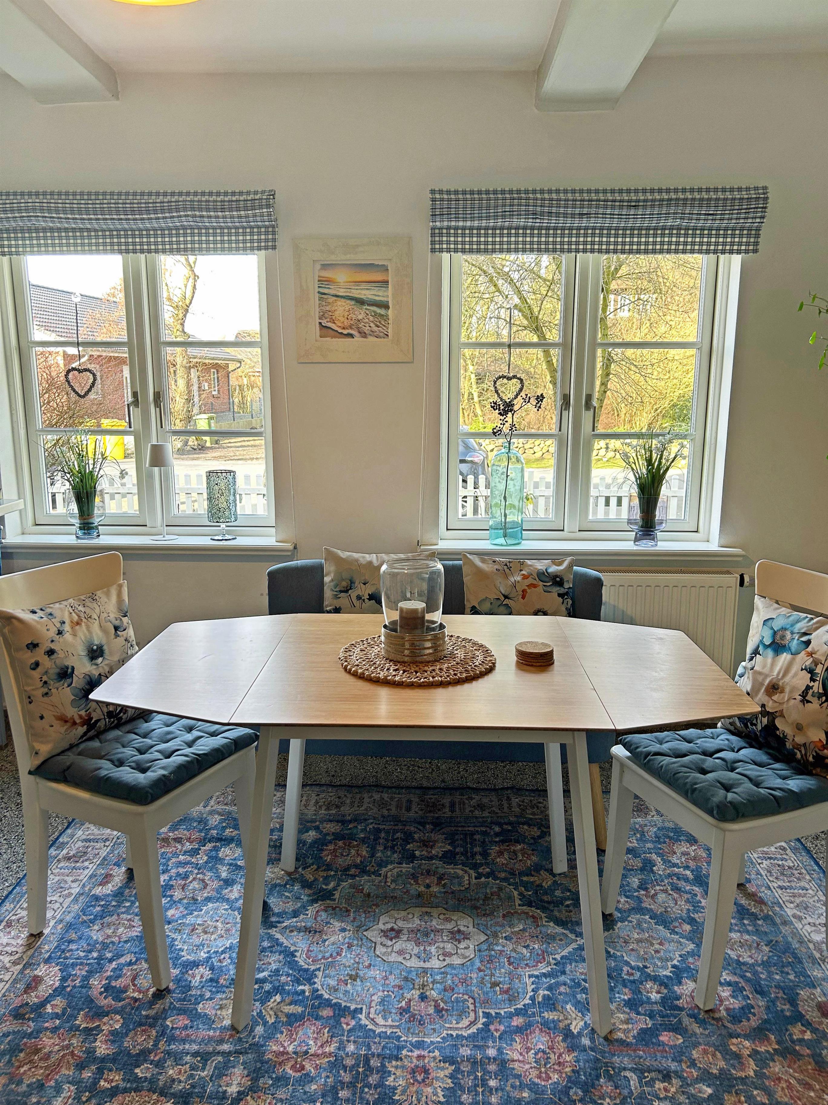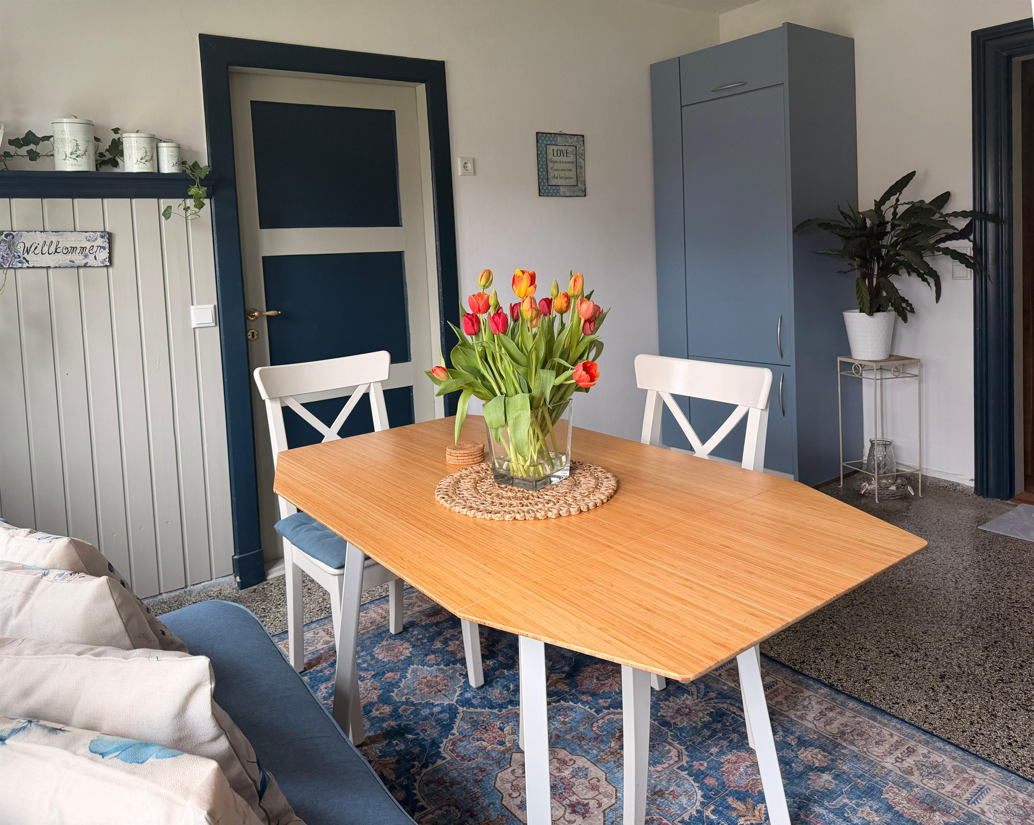 Das Haus wurde vollständig modernisiert, um den heutigen Komfortwünschen zu entsprechen. Dabei war es uns sehr wichtig, den Charme des historischen Gebäudes zu erhalten. Die Wohnung verfügt über ein Wohnzimmer mit Essbereich und Kaminofen, zwei getrennte Schlafzimmer, eine großzügige Küche, Bad und eine Abstellkammer. Das erste Schlafzimmer ist mit einem Boxspring-Doppelbett ausgestattet, im Zweiten befindet sich ein Stockbett.