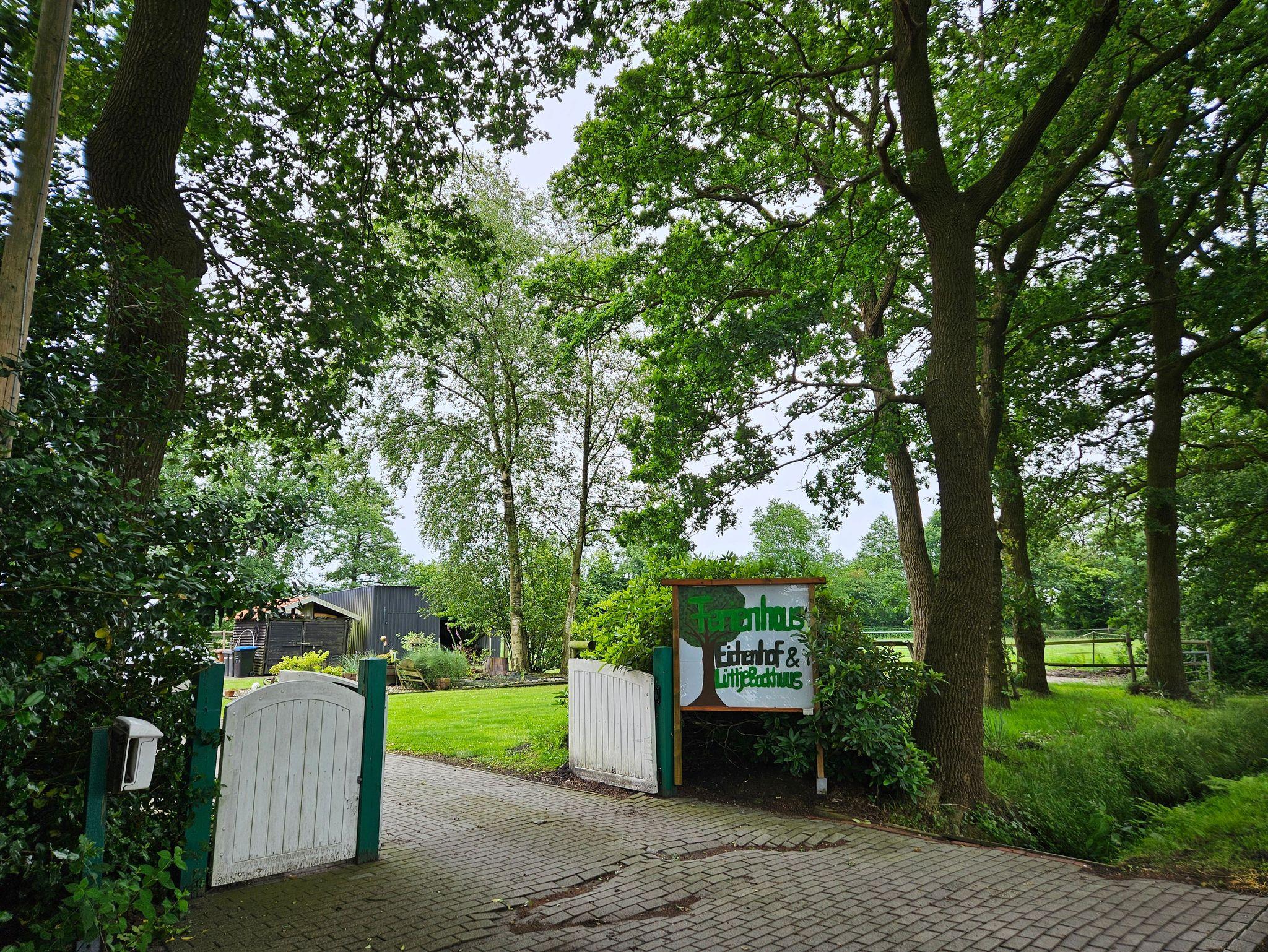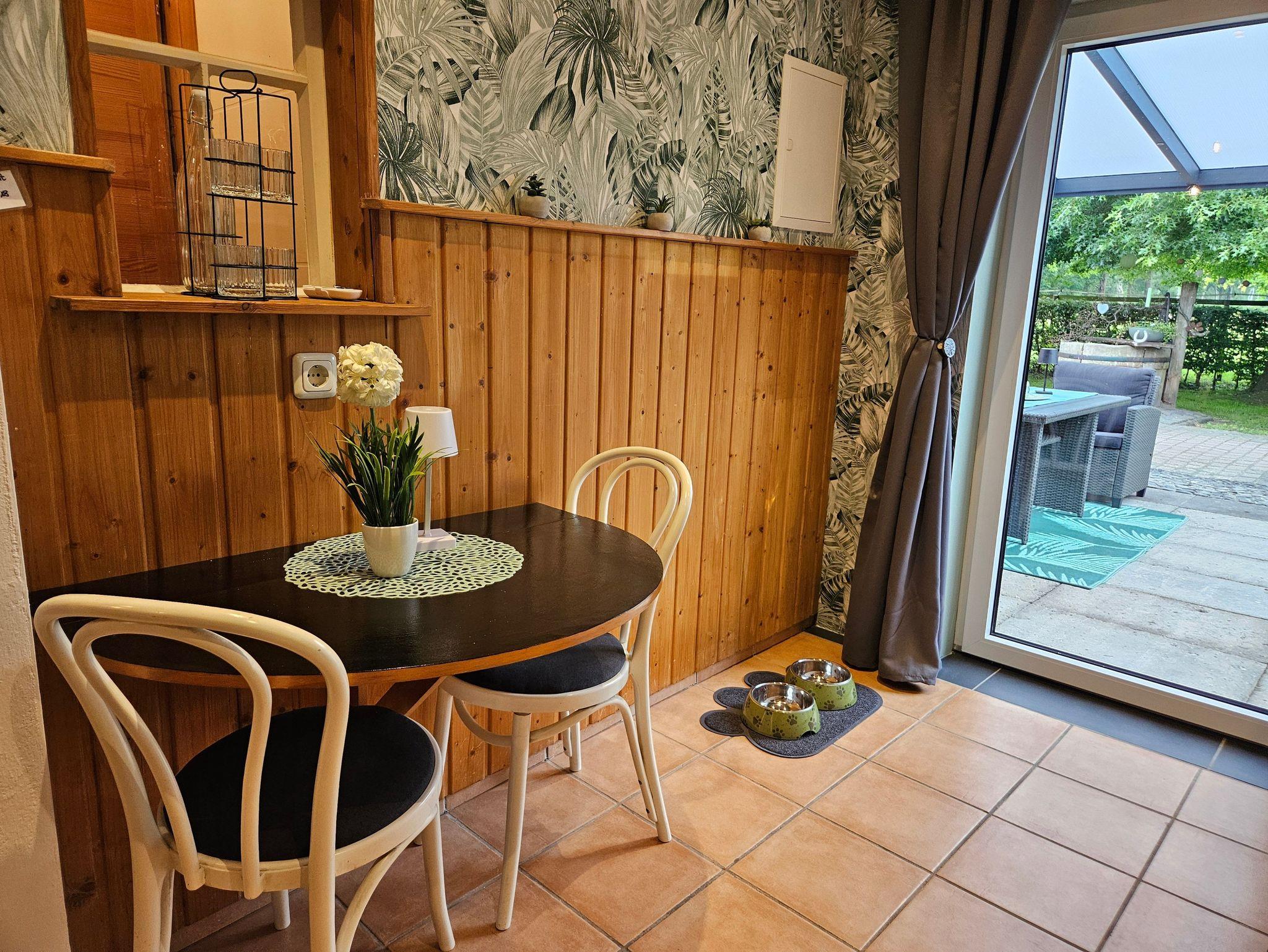 Gemütliches Ferienhaus Luettje Backhuus mit Kamin und überdachter Terrasse in idyllischer Natur.