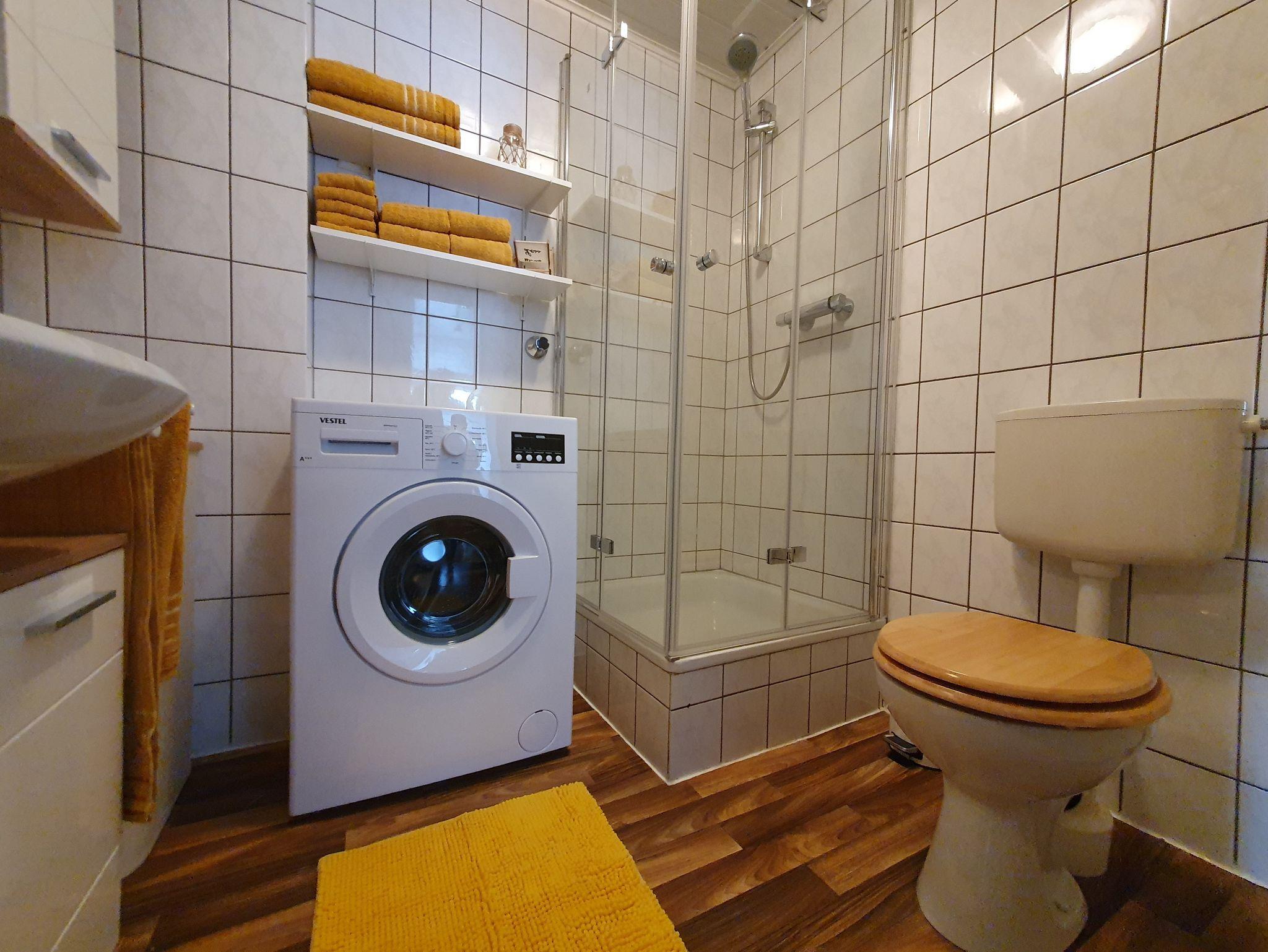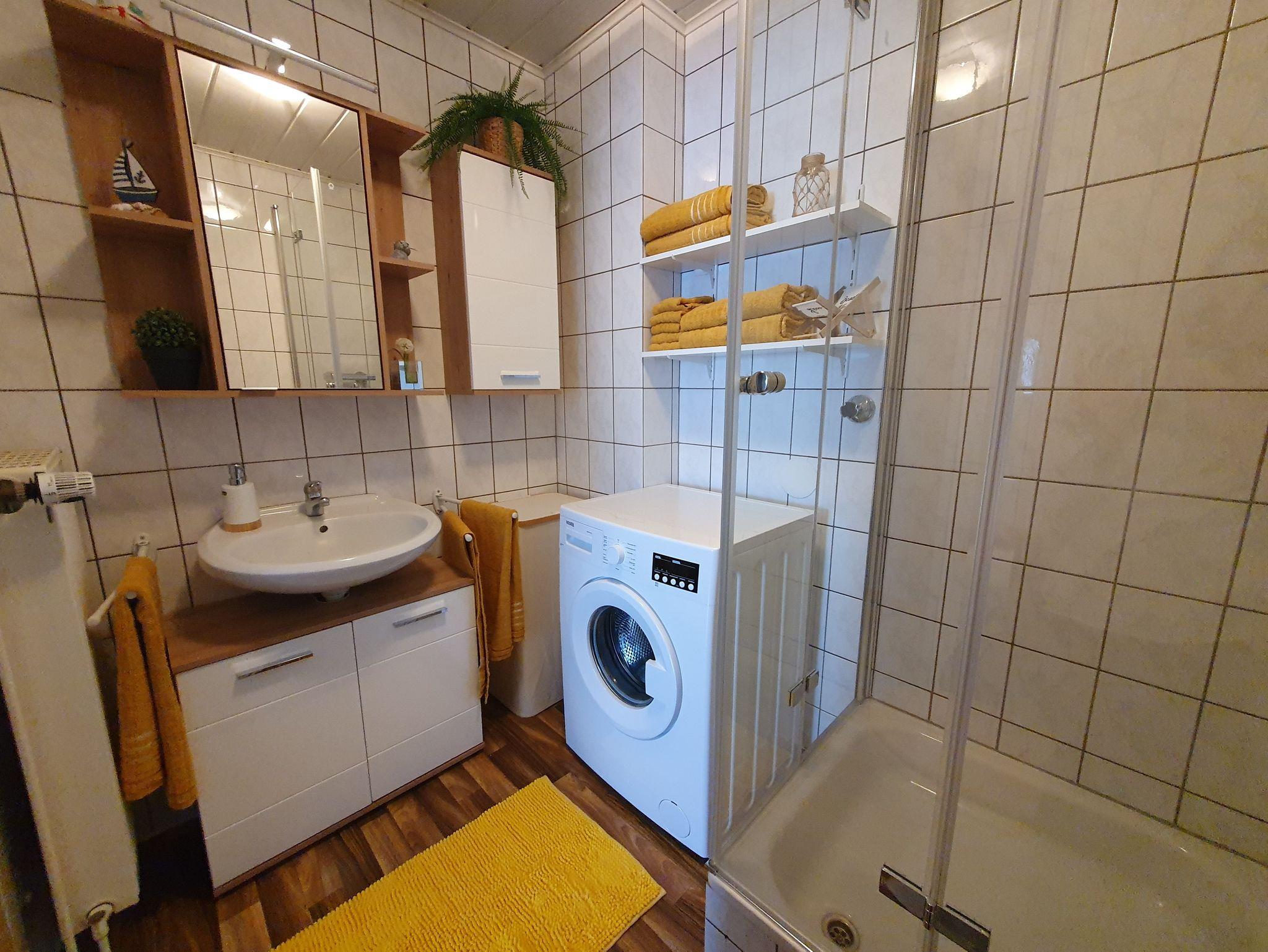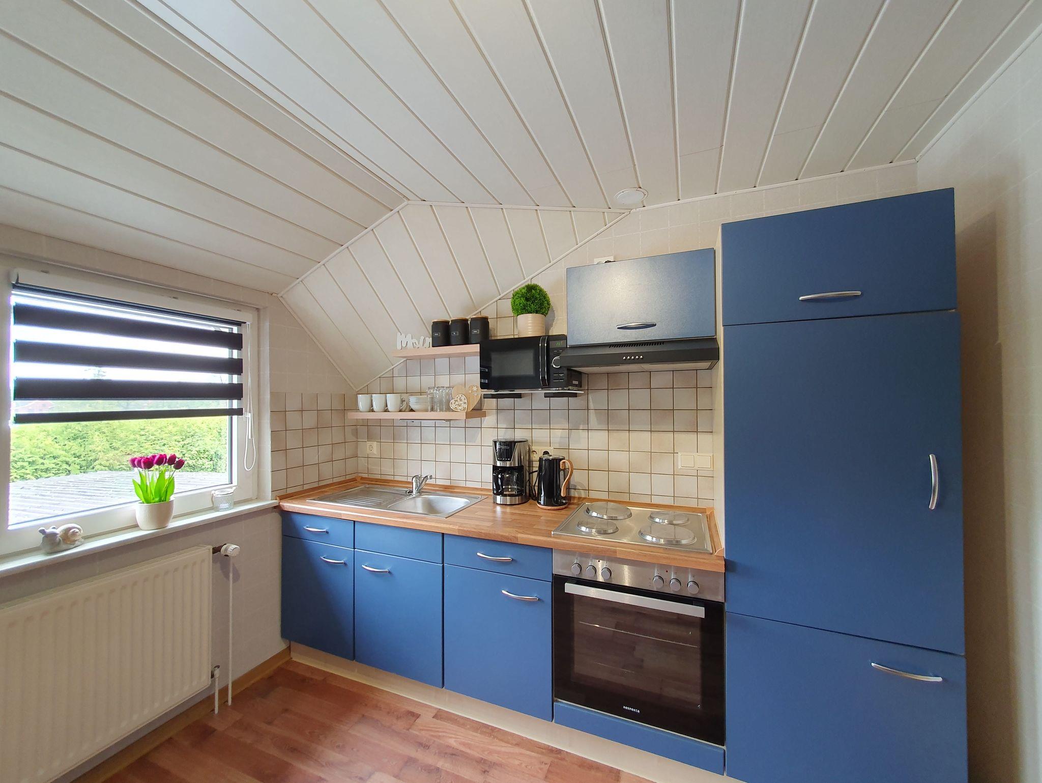 Die gemütliche 65 m² Oberwohnung in ruhiger Lage bietet ausreichend Platz für 2-3 Personen im Schlafzimmer mit Doppelbett, Wohnzimmer mit großer (Schlaf-)Couch, Bad mit Dusche und WC und einer gut ausgestatteten Küche.