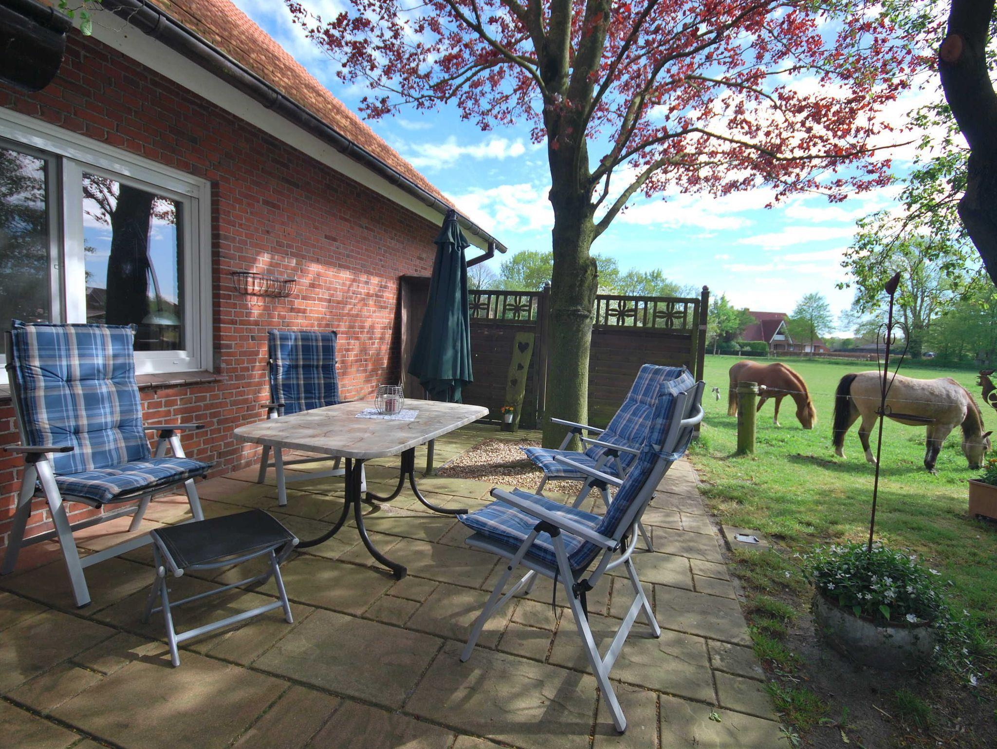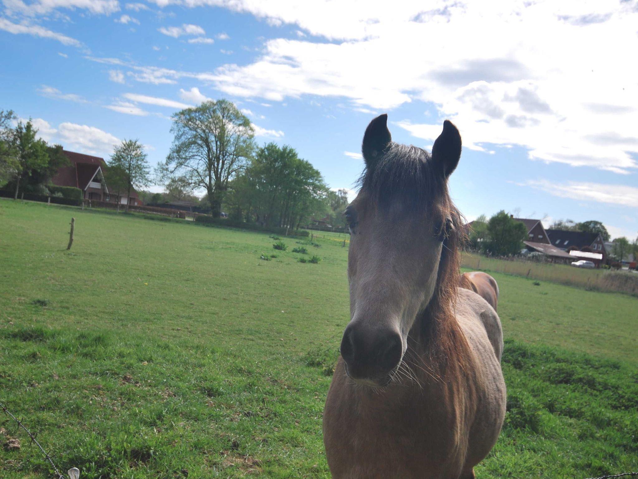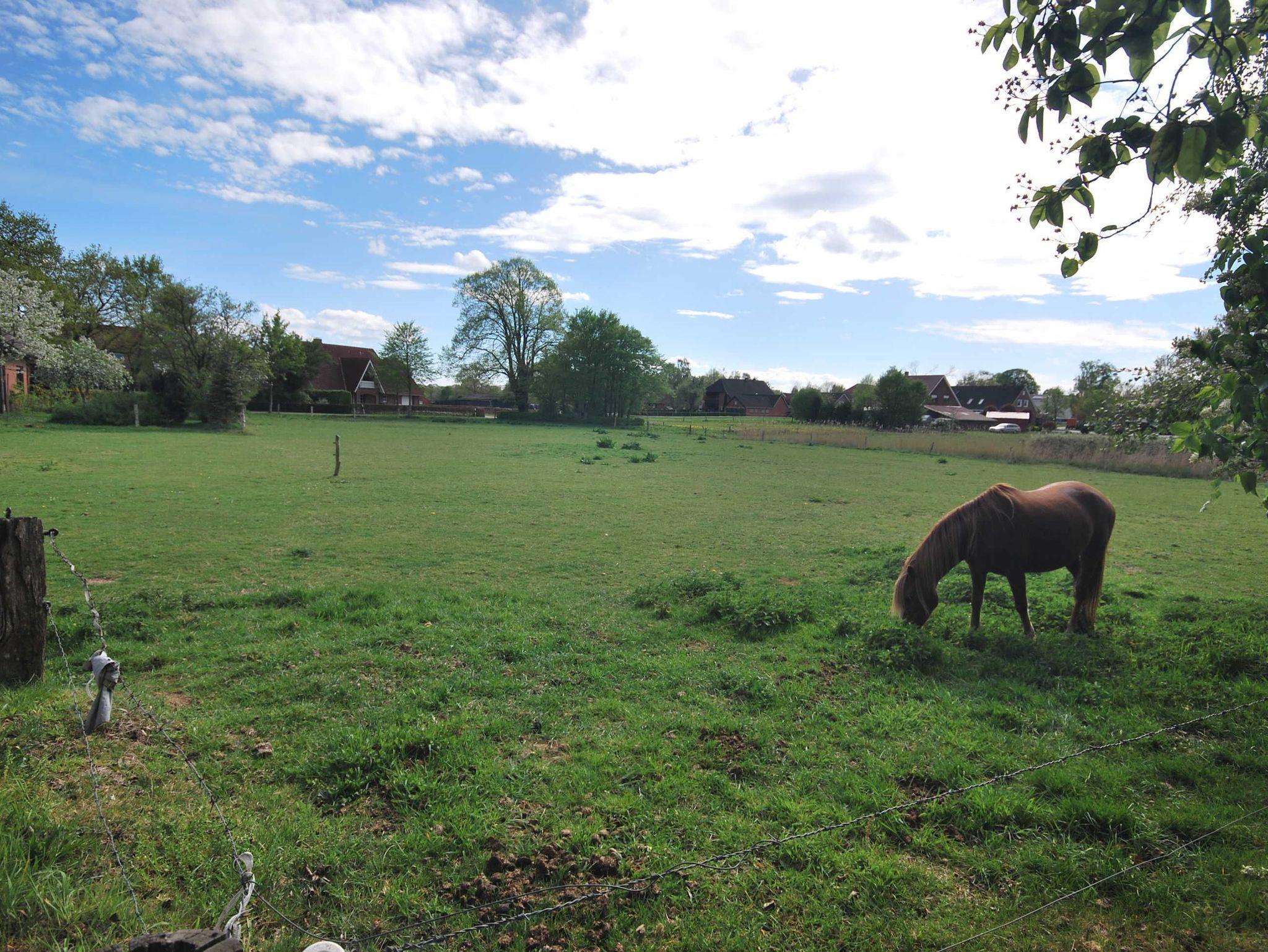 Ferienhaus mit Blick auf Pferdeweiden und die wunderschöne ostfriesische Landschaft.