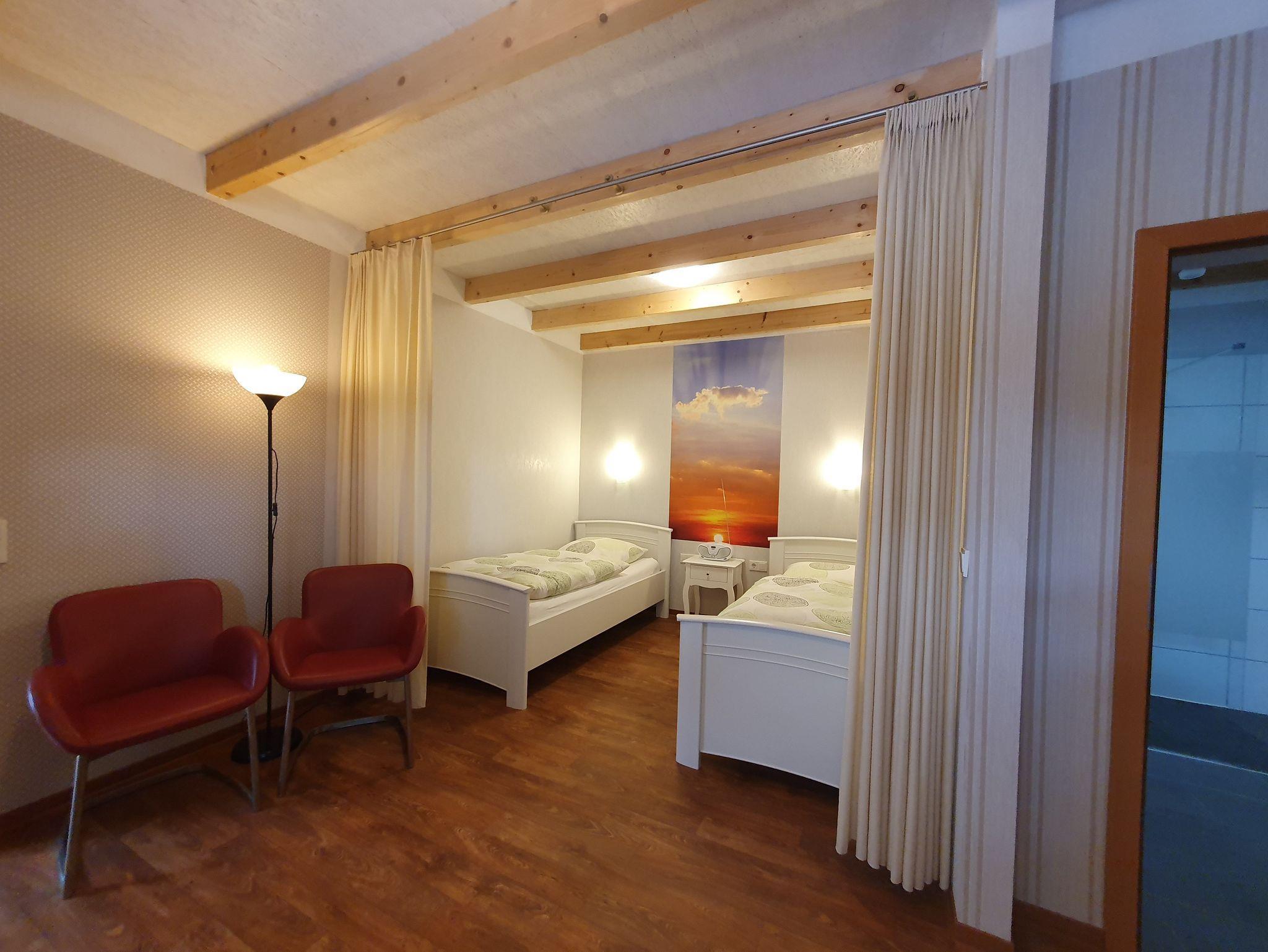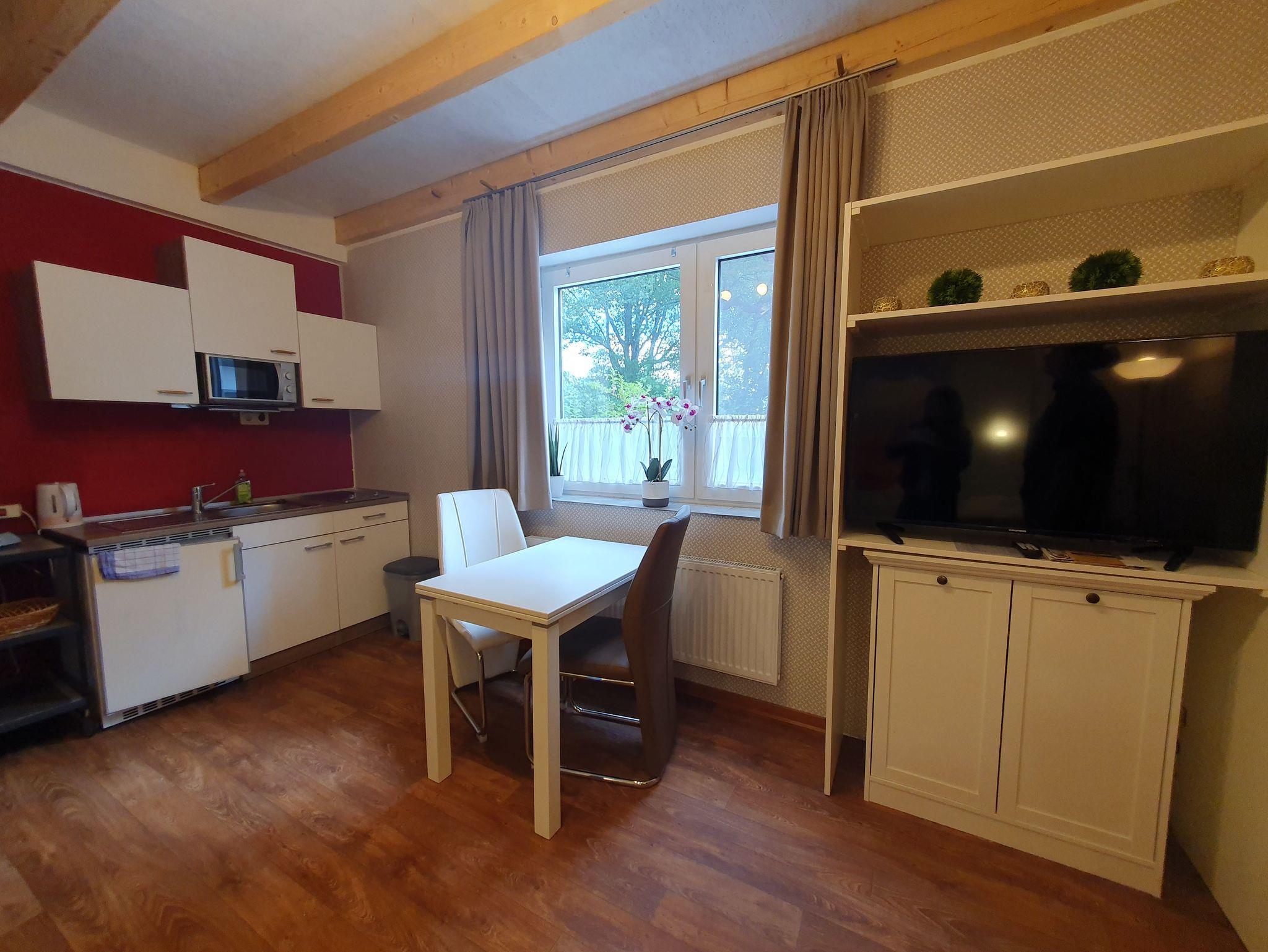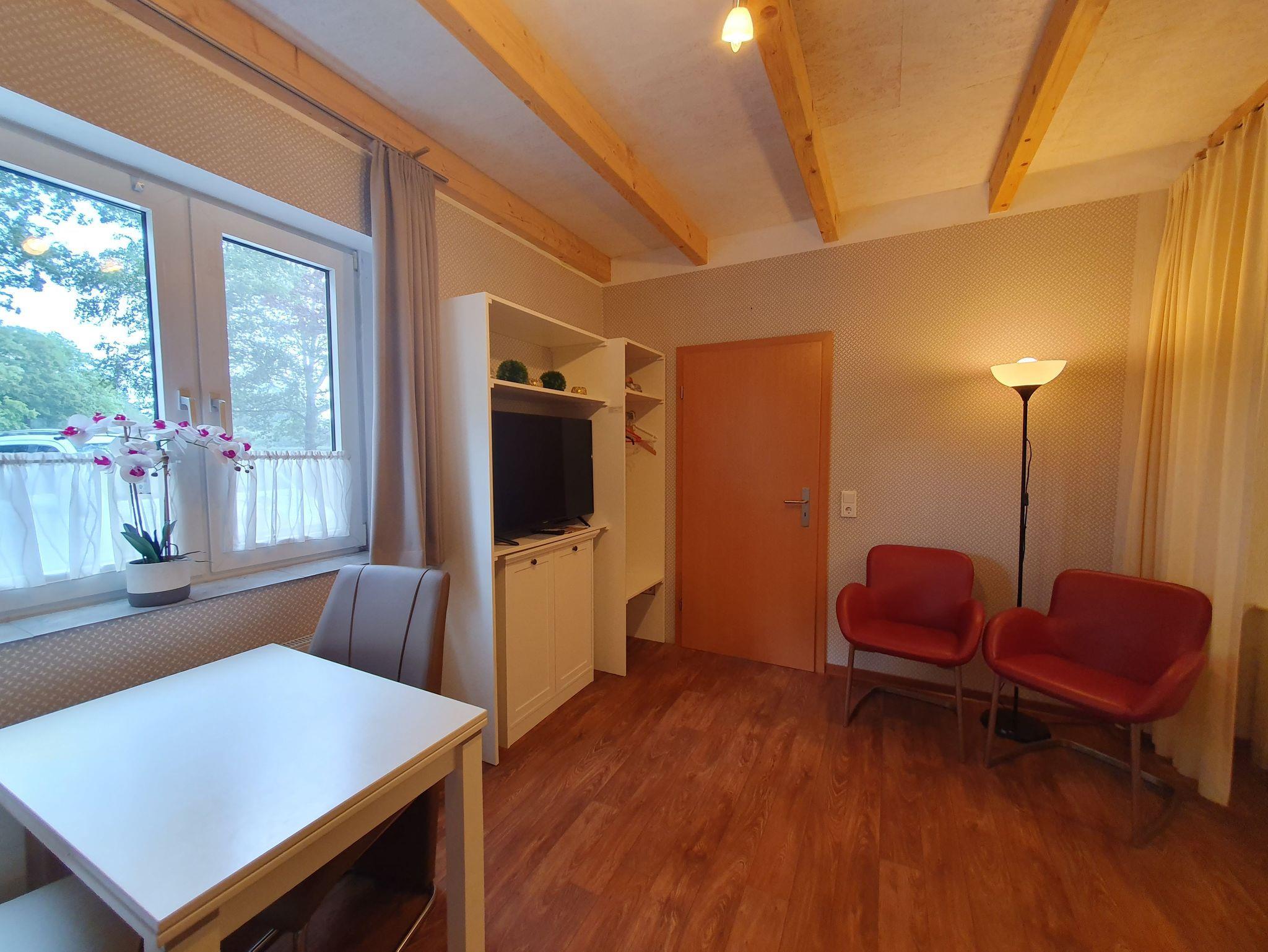 Das Appartement verfügt über zwei Einzelbetten, die auch gerne zusammen gestellt werden können. Der Schlafbereich kann mit einem Vorhang getrennt werden. Die Wohnküche mit kleiner Küchenzeile, eine Sitzecke mit Flachbild-TV laden zum Verweilen ein. Das große Bad mit ebenerdiger Dusche lässt keine Wünsche offen.