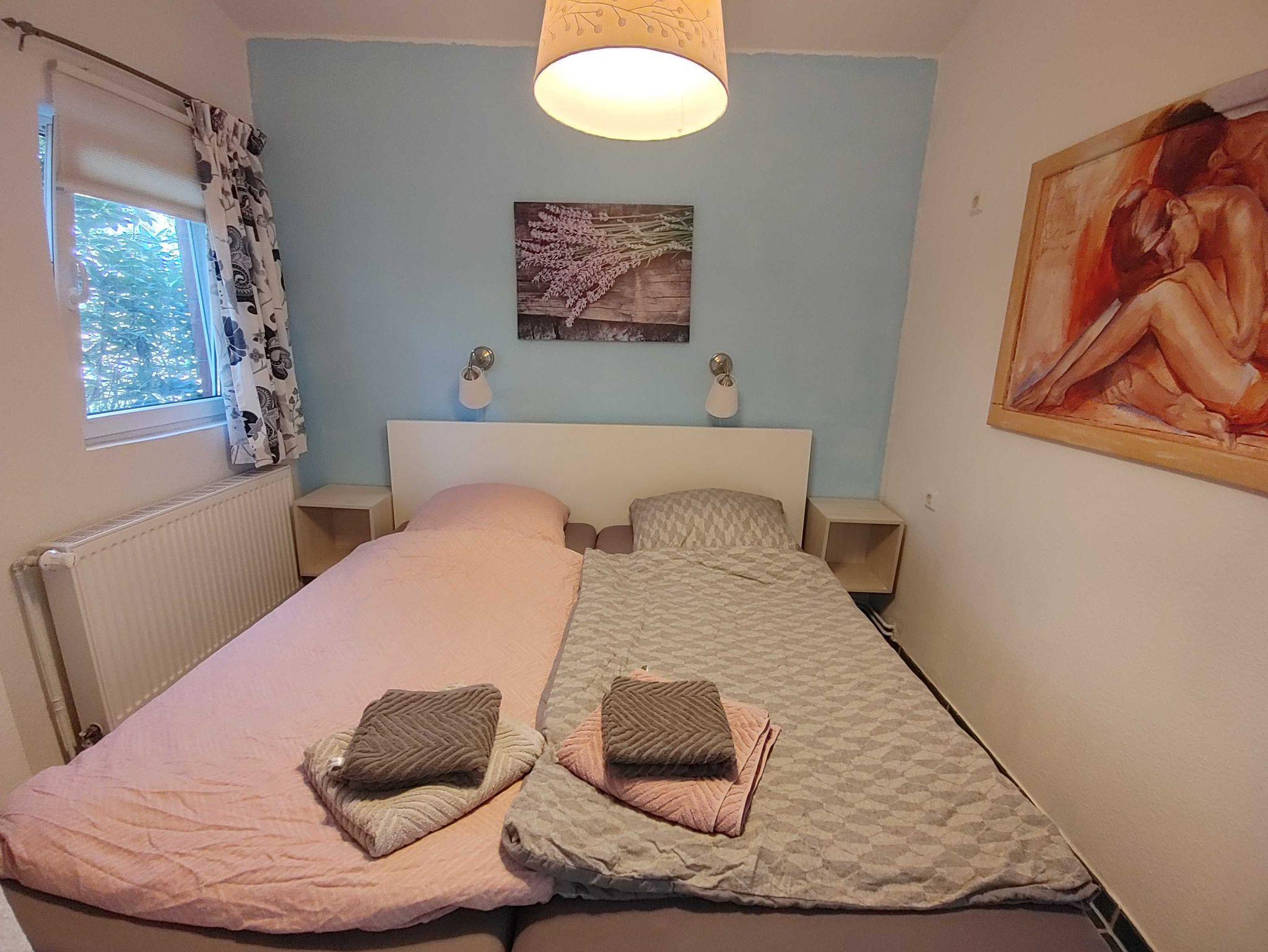 Die Unterkunft verfügt über etwa 40 qm. Vom Eingangsbereich mit Wohnschrank, Schuhschrank etc. kommt ihr in den schönen einladenden Aufenthaltsraum mit offener Küche, kleinem TV-Gerät und direktem Zugang zur Terrasse, wo man sehr gut ?abschalten? kann! Ein Schlafzimmer mit großem Queensizebett (180*200) und der nötigen Einrichtung liegt ruhig gelegen neben dem Aufenthaltsraum, ist aber auch durch eine Tür hiervon getrennt. Zu guter letzt habt Ihr noch ein kleines schön eingerichtetes Bad mit Dusche und WC.