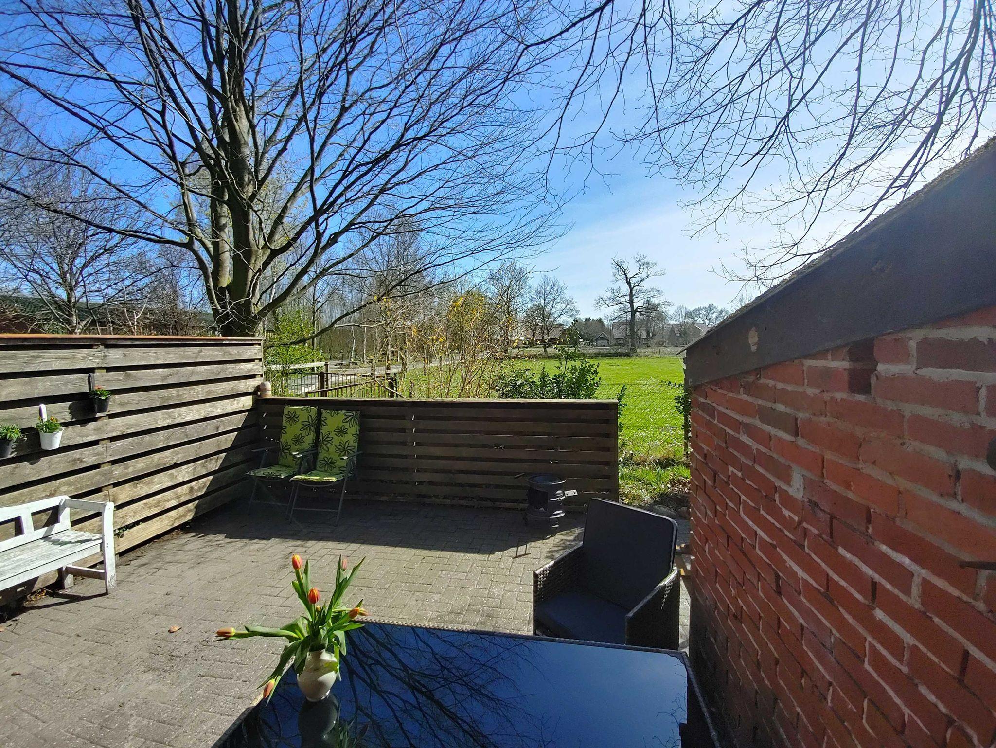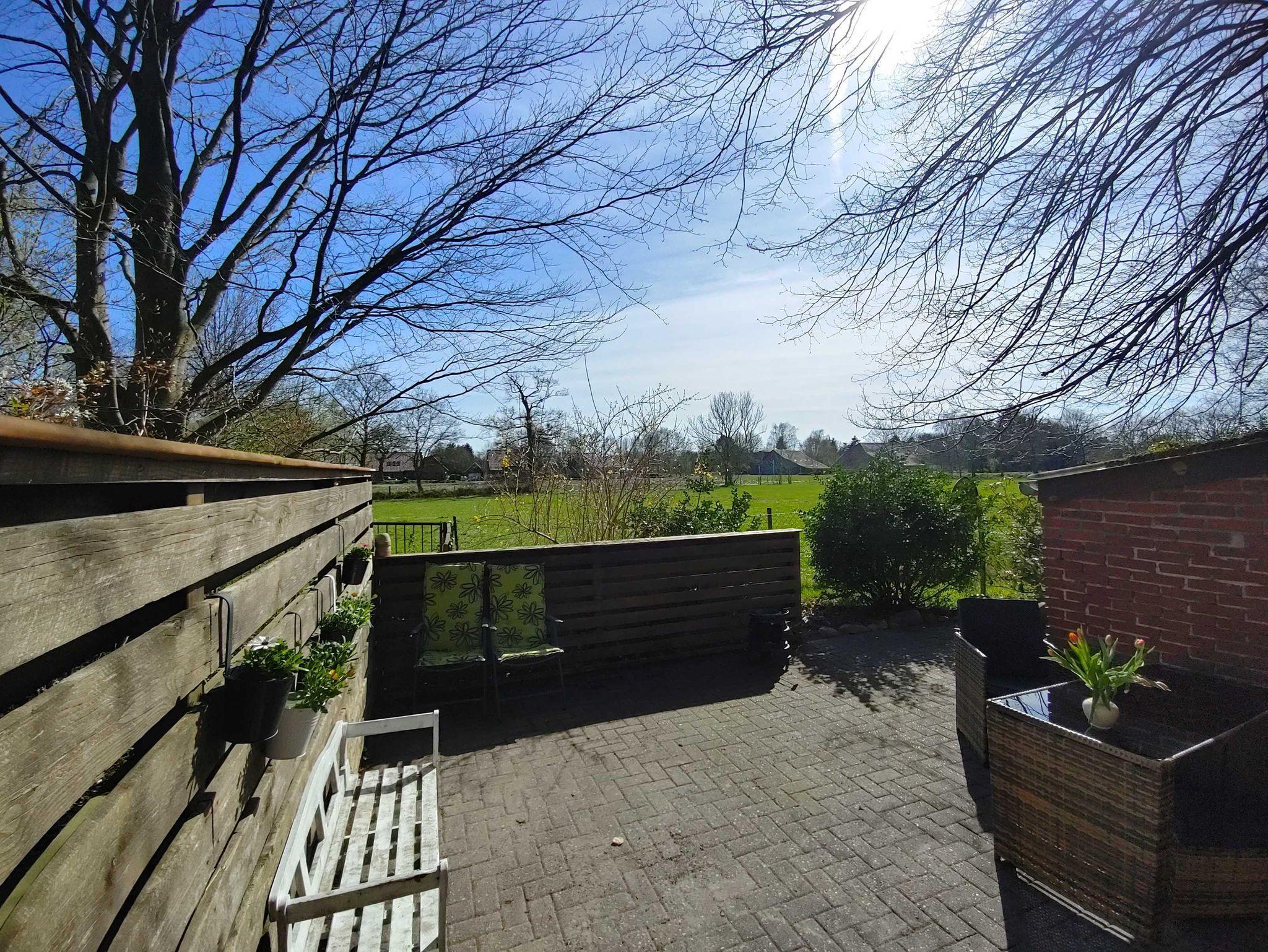 Charmantes Ferienhäuschen in Uplengen mit Terrasse, Grill und Blick auf grüne Pferdewiesen.