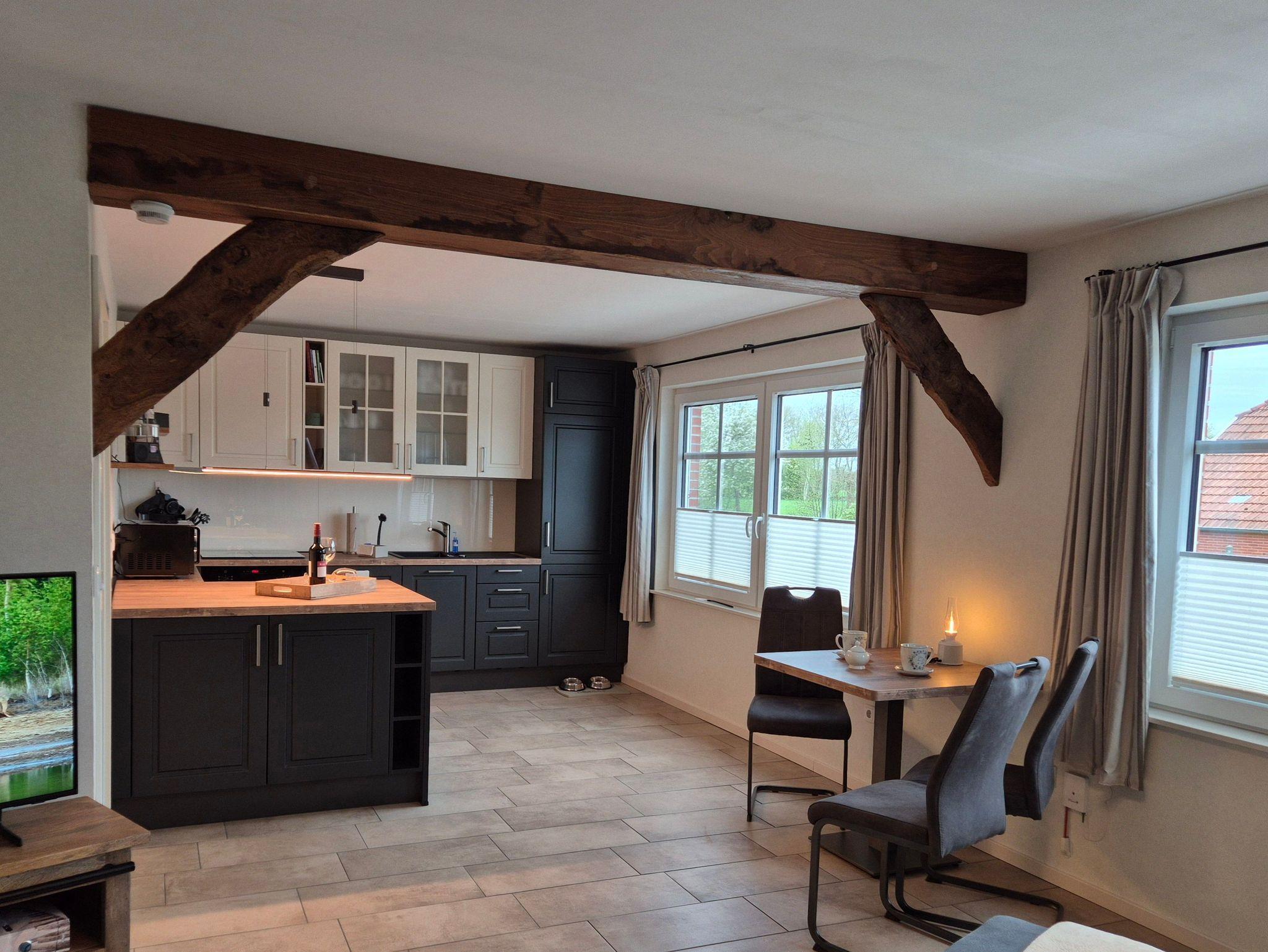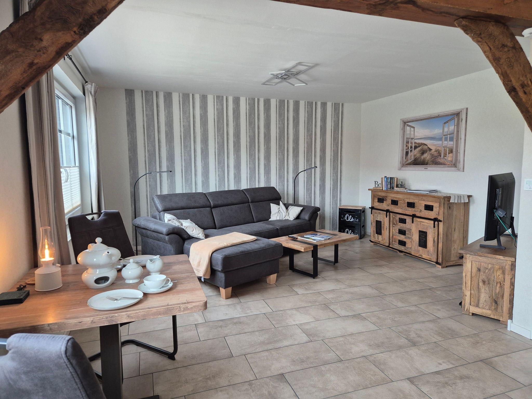 Unsere Ferienwohnung Mörgensünn im Erdgeschoss ist ca. 67qm groß und verfügt über einen großen Wohnraum mit integrierter Landhausküche. Die Küche ist ausgestattet mit: Kühlgefrierkombination, Induktionsherd, Mikrowelle, Geschirrspüler, Toaster, Kaffeemaschine (Pads u. Filterkaffee) Wasserkocher. Im Wohnzimmer könnt ihr es euch auf der Schlafcouch zum Lesen oder Fernsehen bequem machen. Ihr findet diverse Spiele sowie Bücher und Zeitschriften zum Thema Ostfriesland zum Schmöckern.