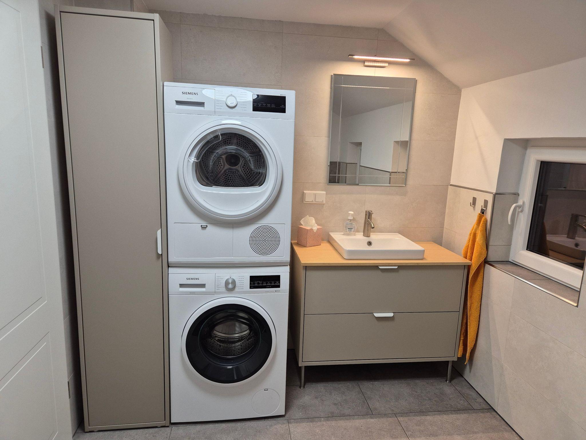 Im Bad gibt es eine geräumige ebenerdige Regendusche, einen Waschtisch mit Stauraum, eine wassersparende moderne Toilette, sowie Waschmaschine und Trockner. Ein Föhn steht euch ebenfalls zur Verfügung.