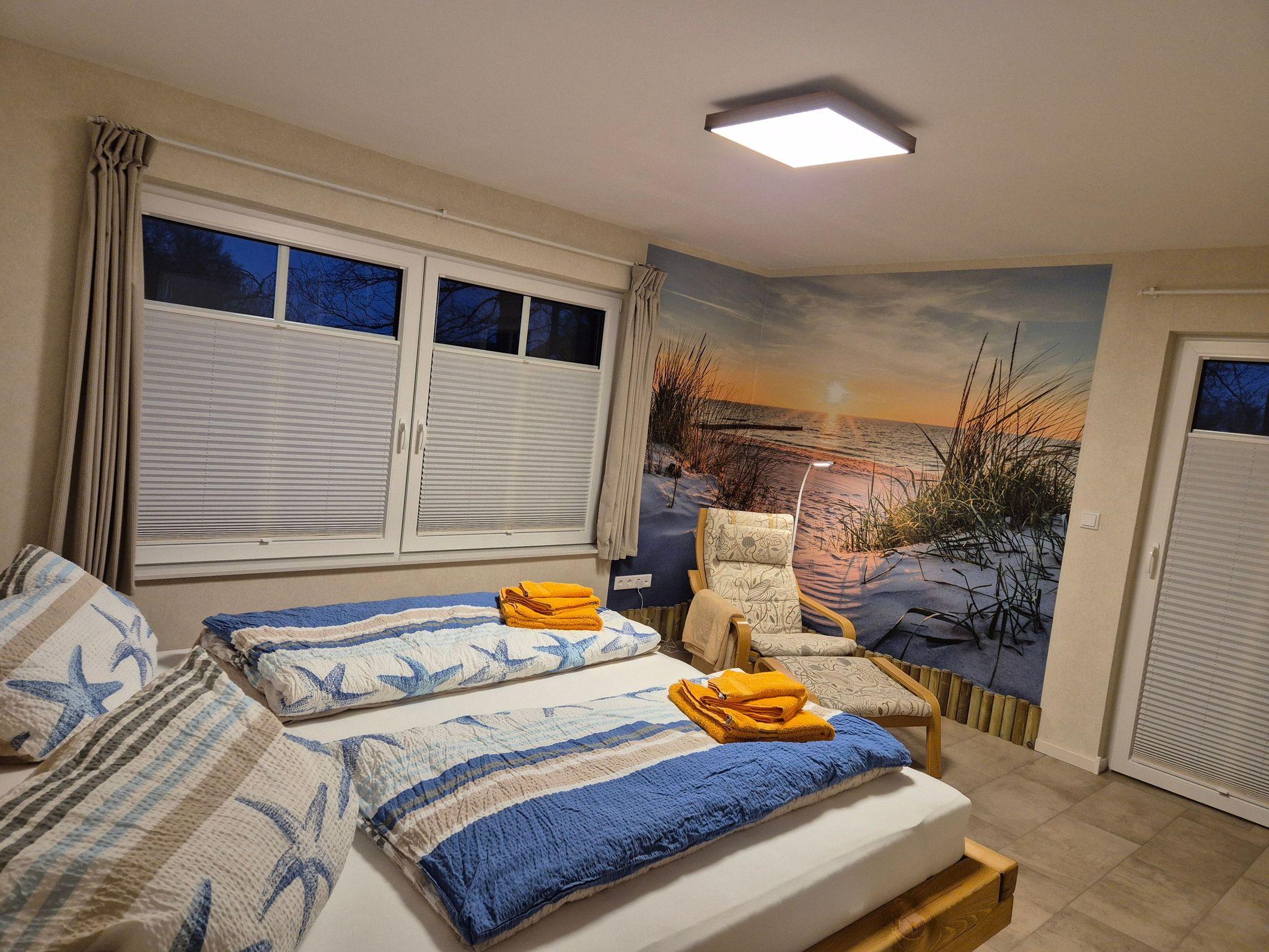 Im Schlafzimmer steht euch ein 200 x 180 cm großes Doppelbett zur Verfügung. Ihr könnt euch von der Sonne wecken lassen oder das Schafzimmer mit Gardinen abdunkeln. Außerdem gibt es eine gemütliche Leseecke.
