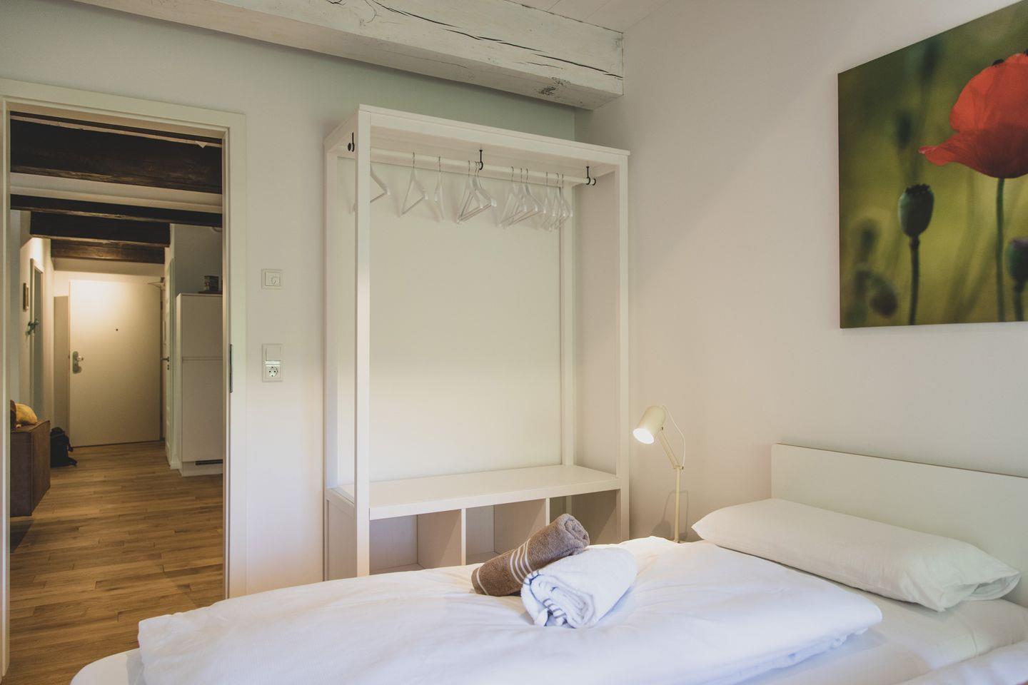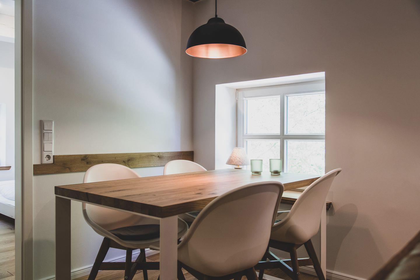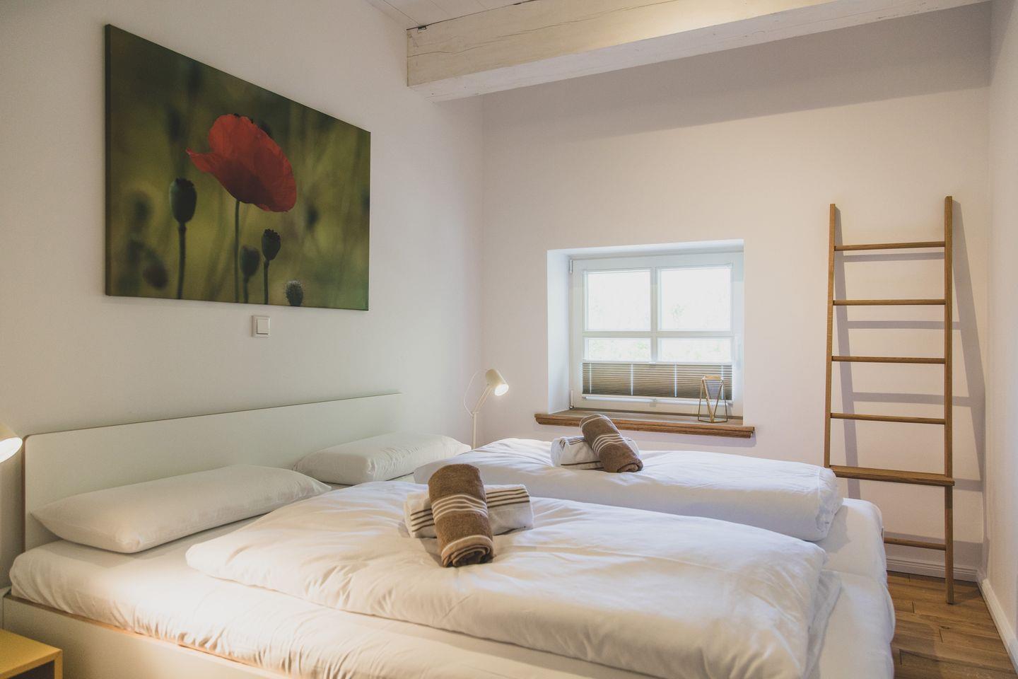 Die Wohnung ist liebevoll gestaltet und mit modernem Komfort ausgestattet. Sie verfügt über zwei komfortable Schlafzimmer mit Parkettboden, die für erholsamen Schlaf sorgen. Das großzügige Wohnzimmer schließt sich an die offene Küche an und ist der perfekte Ort, um gemeinsame Zeit zu verbringen. Hier können Sie am Esstisch zusammen speisen oder sich auf der Sofaecke entspannen. Die voll ausgestattete Küche lässt keine Wünsche offen und bietet alles, was Sie für die Zubereitung köstlicher Mahlzeiten benötigen, inklusive Induktionsherd, Spülmaschine, und Mikrowelle.