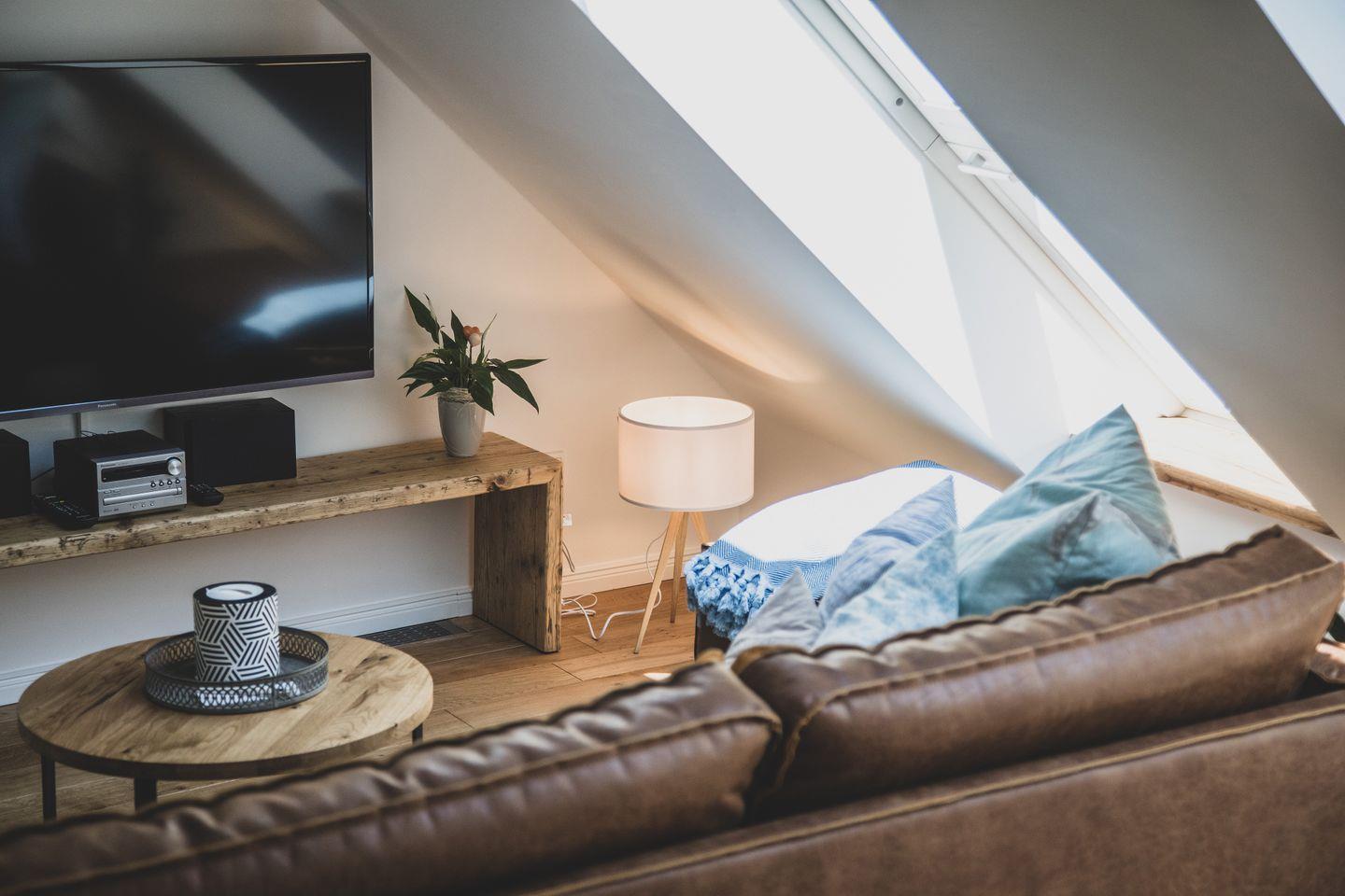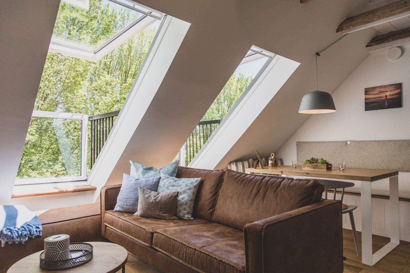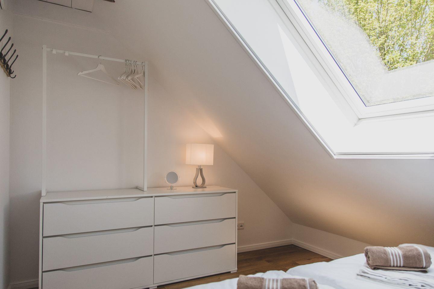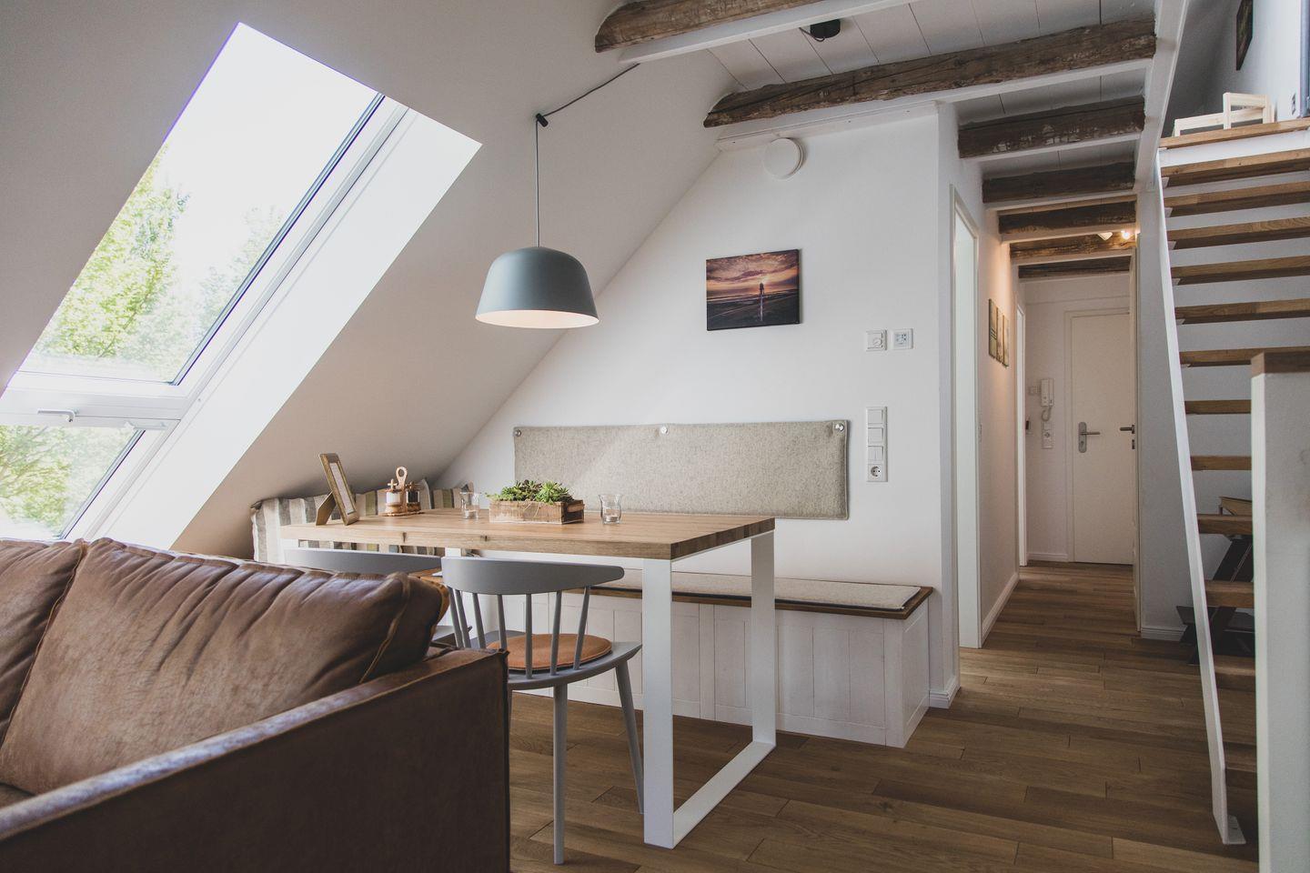 Mit einer Größe von 56 m² findet hier bequem Platz für bis zu vier Personen. Die Ferienwohnung im zweiten OG verfügt über zwei geschmackvoll eingerichtete Schlafzimmer mit hochwertige Parkettböden, die für eine warme Atmosphäre sorgen. In dem lichtdurchfluteten Wohnzimmer lädt eine gemütliche Sofaecke zum Entspannen ein, während ein Essbereich, der ausreichend Platz für gesellige Mahlzeiten bietet, dazu einlädt, die Zeit gemeinsam zu genießen. Die moderne Küche ist voll ausgestattet mit allen Annehmlichkeiten, die Sie benötigen: Ein Kühlschrank, Herd, Backofen und sogar eine Spülmaschine stehen Ihnen zur Verfügung. Genießen Sie Ihren Kaffee aus der bereitgestellten Kaffeemaschine auf dem "Balkon" oder der Terrasse im Garten.